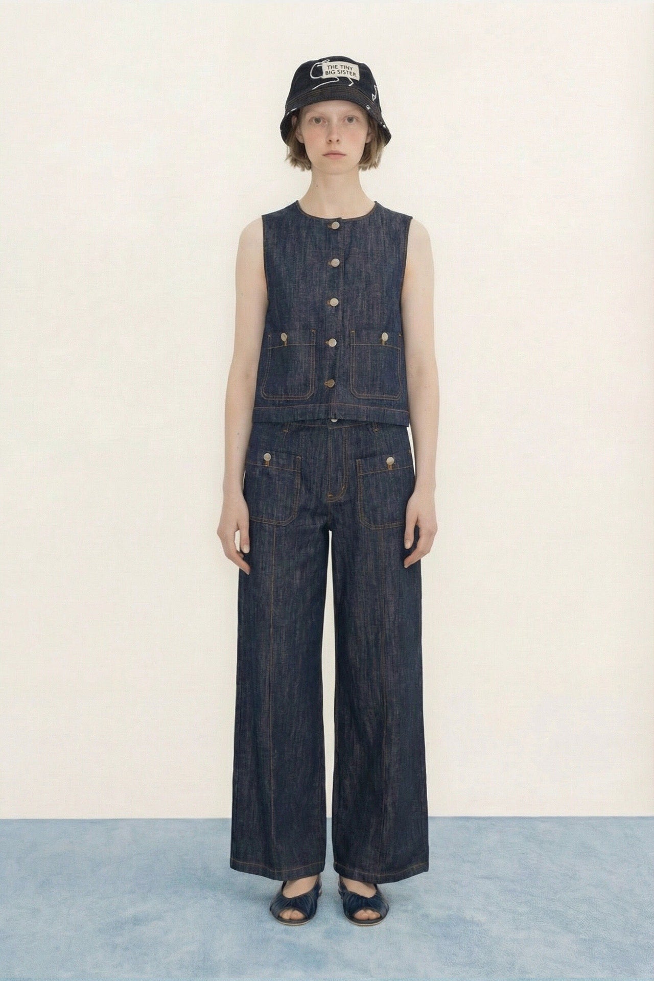 Chaleco vaquero confeccionado en mezcla de lino y algodón con acabado efecto denim, ligero y transpirable. Presenta cierre frontal con botones metálicos, bolsillos delanteros parche. Silueta ligeramente cuadrada. Combínalo con la prenda a conjunto para un look coordinado.