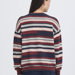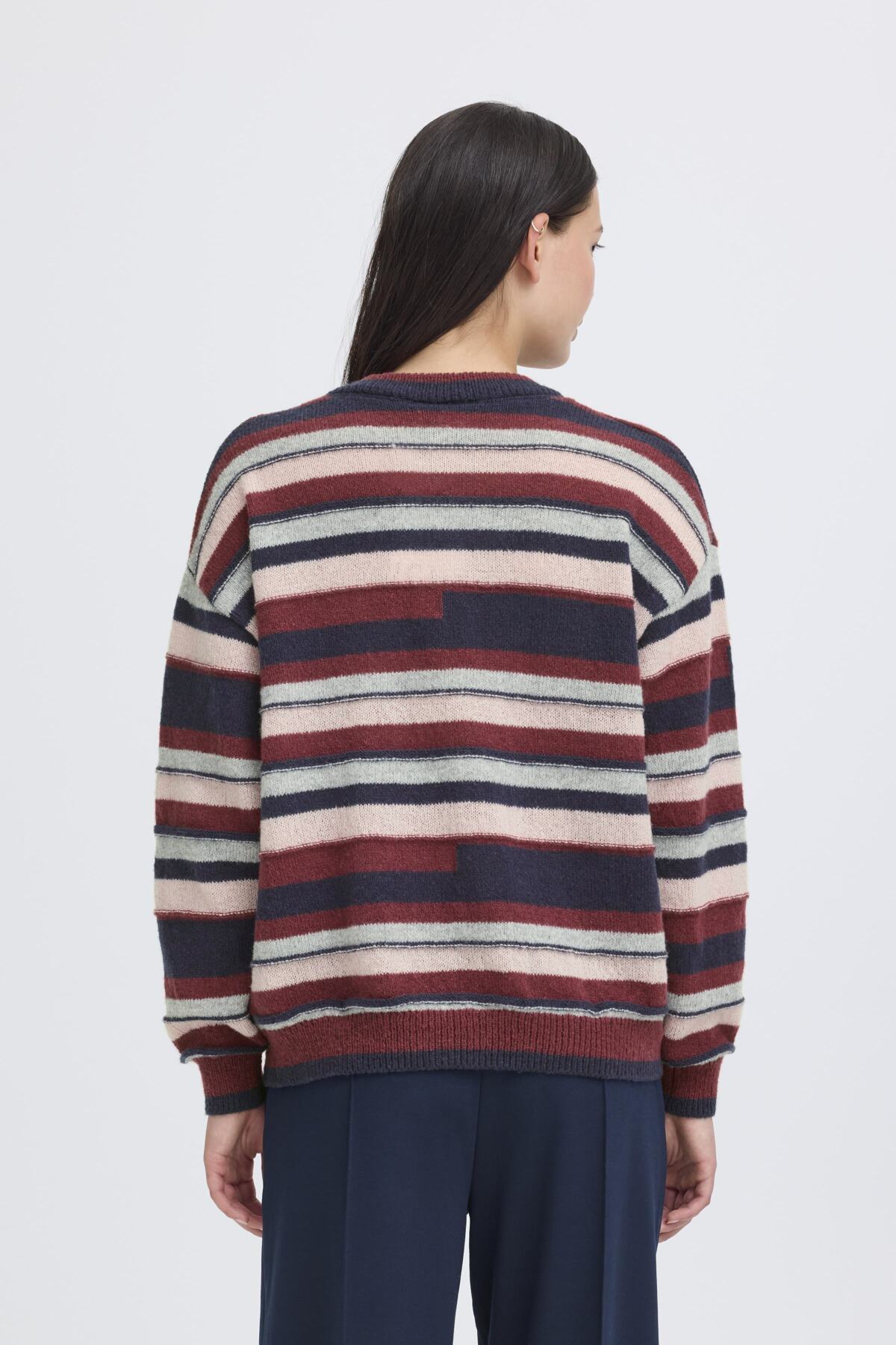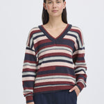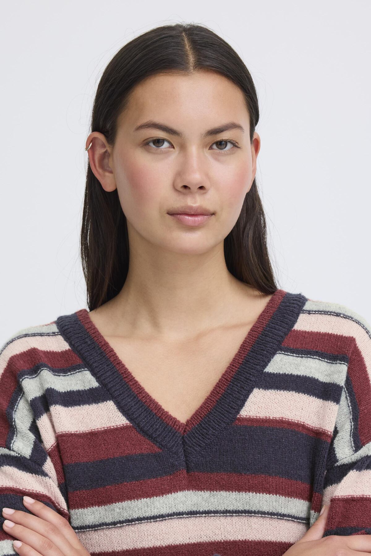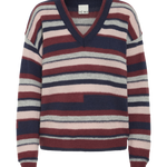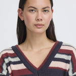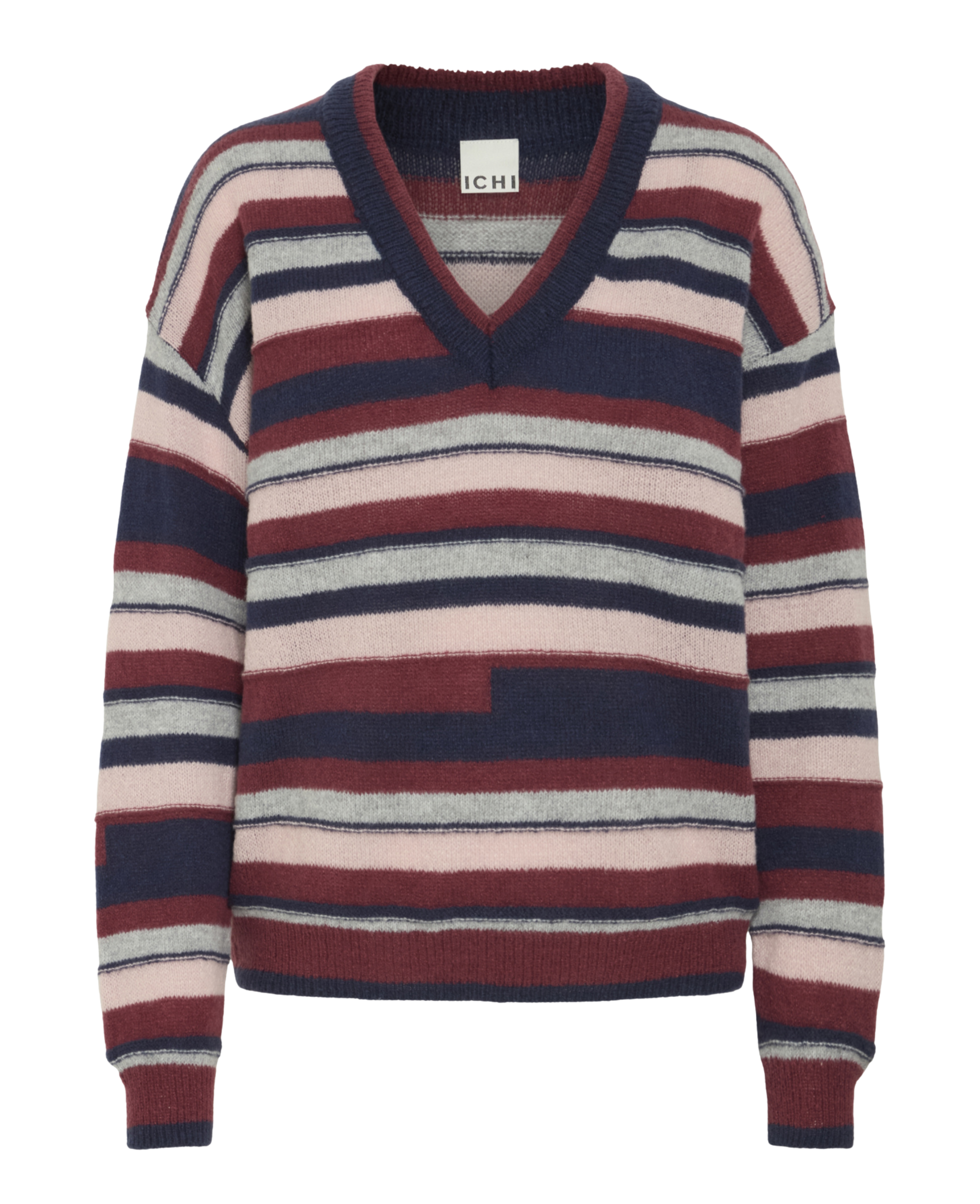 Su estampado de rayas multicolor en tonos burdeos, azul marino, gris y rosa aporta dinamismo y un toque juvenil, mientras que el escote en V estiliza la silueta y lo hace fácil de combinar con camisas, camisetas o llevarlo solo. Una pieza llamativa y cómoda para tu armario de otoño e invierno.