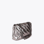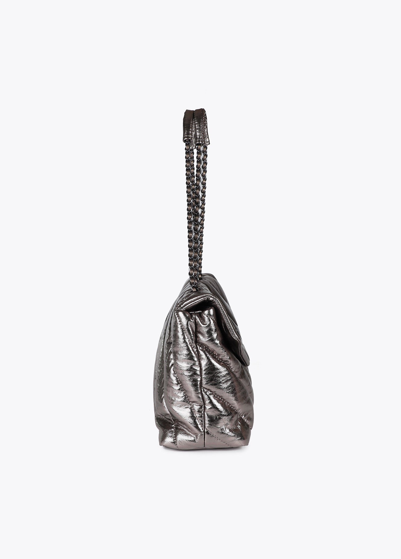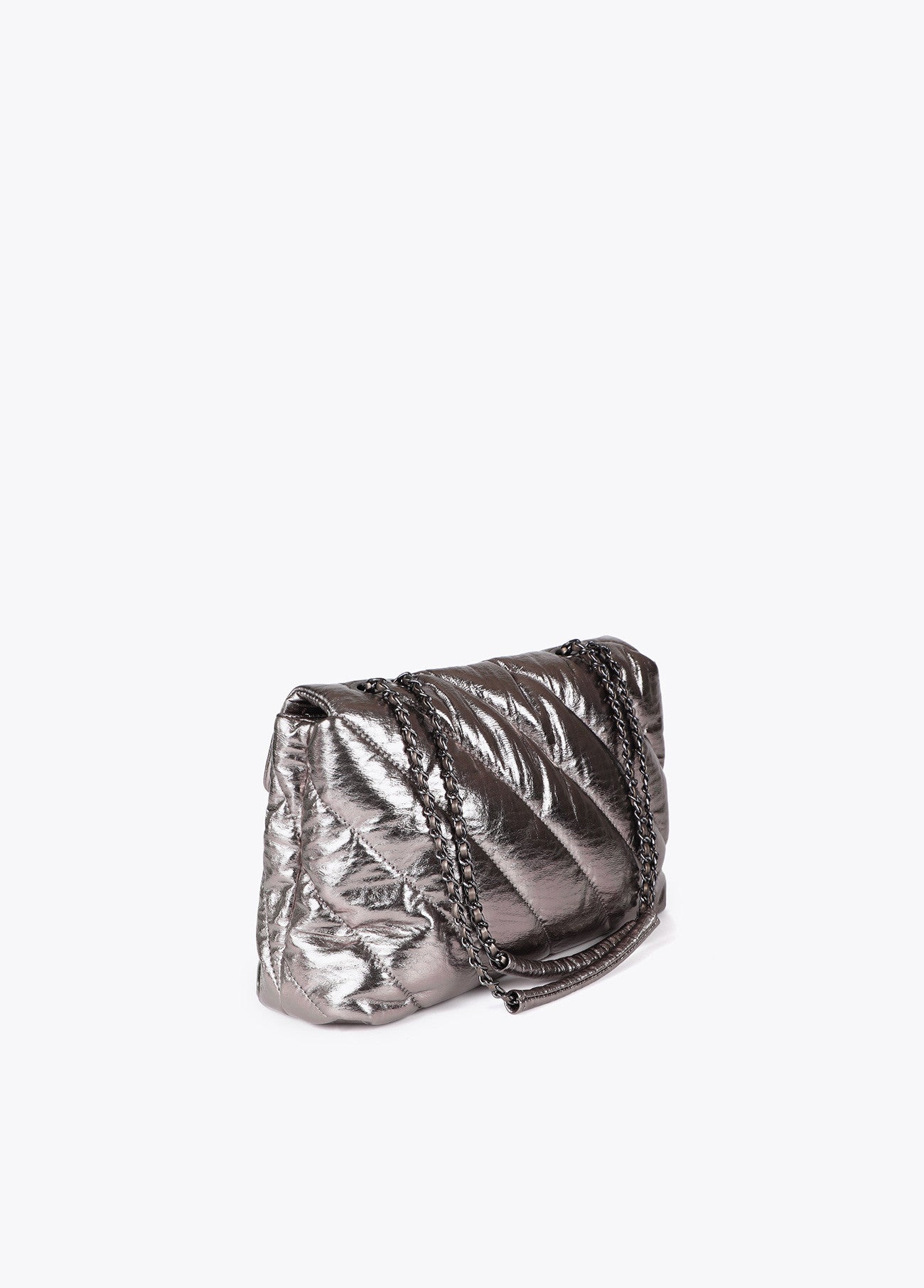 Bolso con solapa en tejido acolchado metalizado de diseño moderno. Cadena de eslabones metálicos y cierre magnético. Interior espacioso con compartimentos adicionales. Ideal para añadir un toque chic a cualquier outfit.