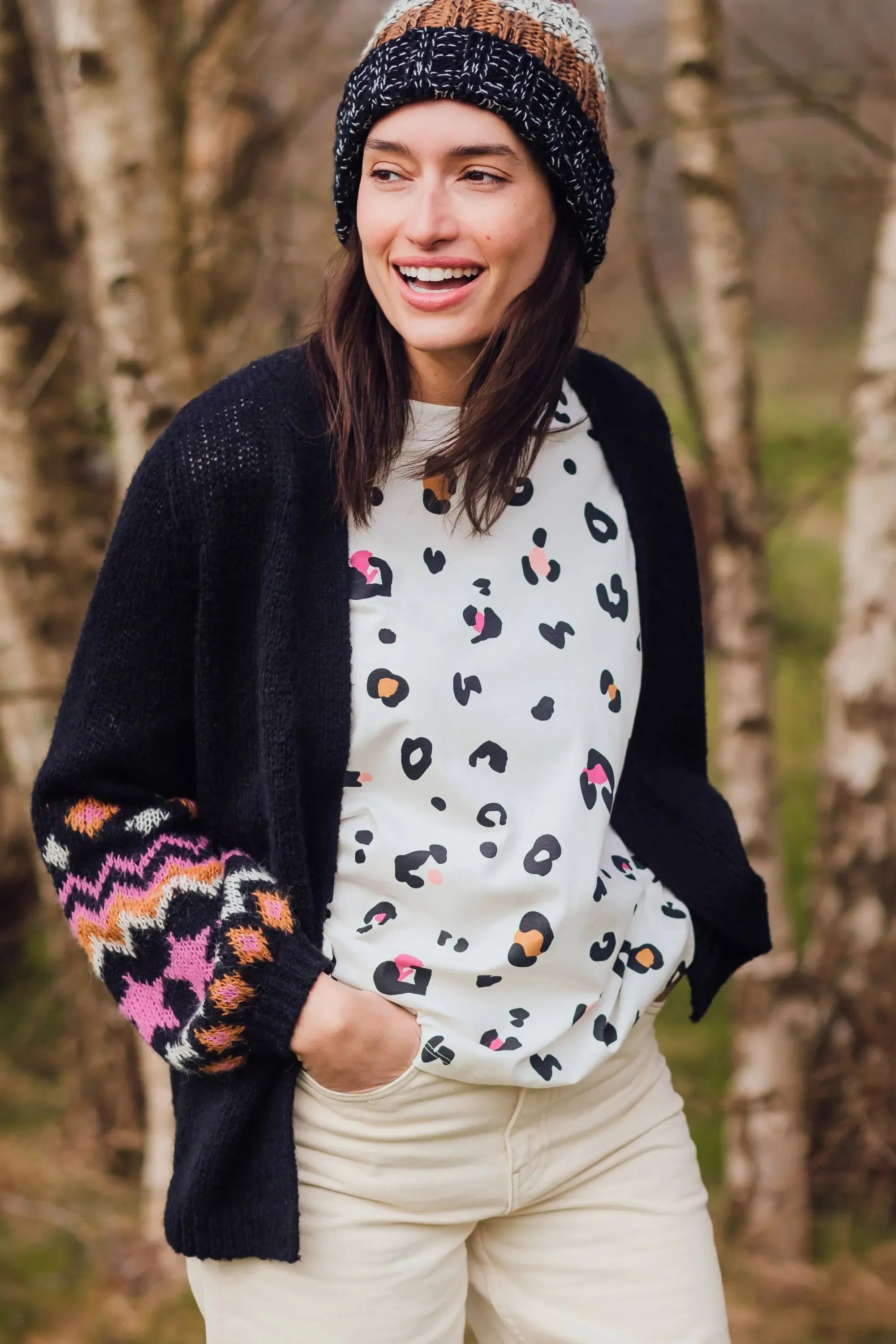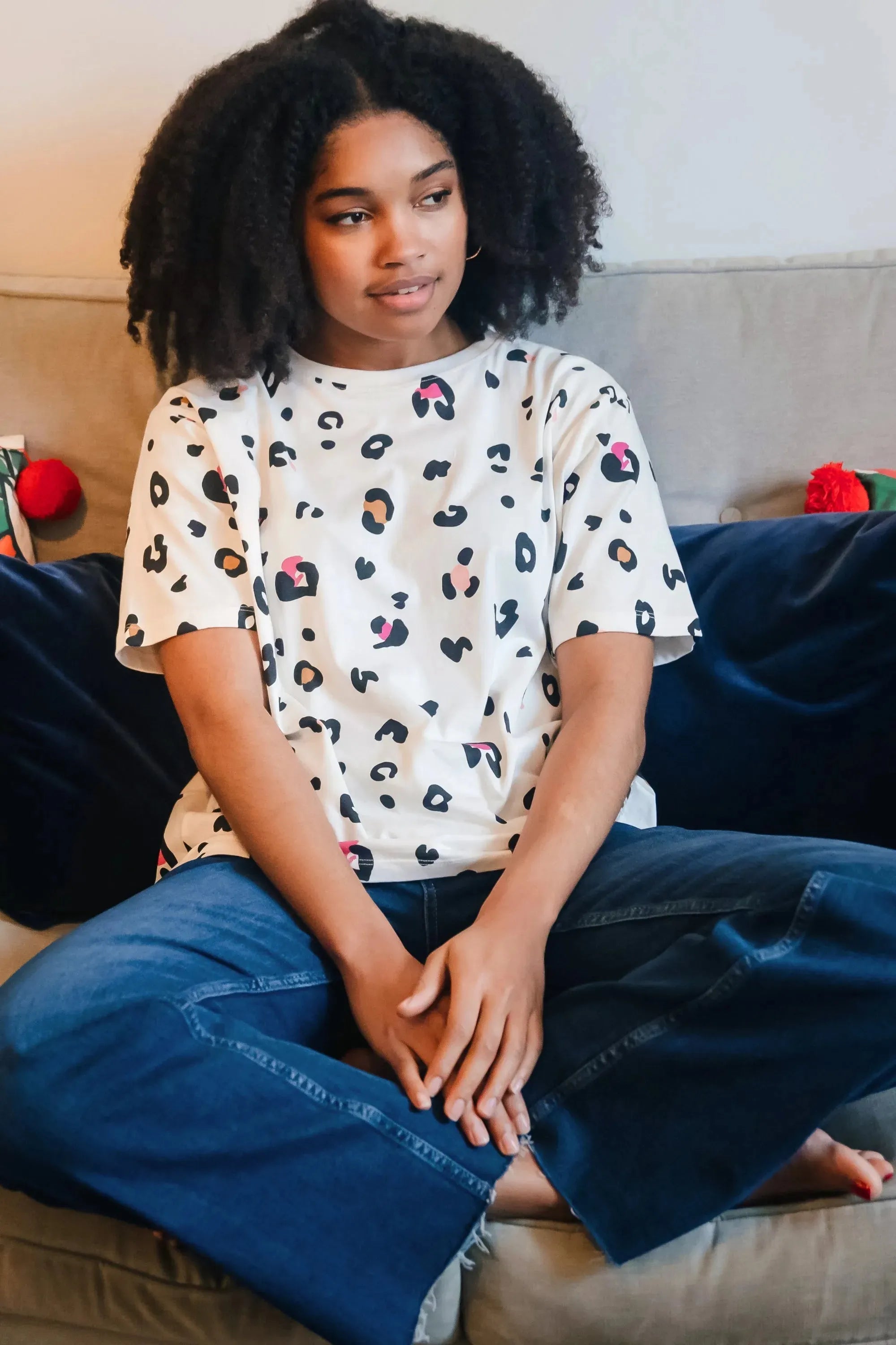 The Kinsley T-shirt combines an oversized “borrowed tee” cut with a simple crew neck and longer short sleeves. The Colour Pop leopard print design features a black animal print with spicy pink and tan on an off-white base.