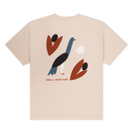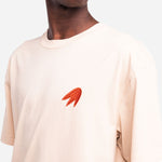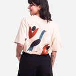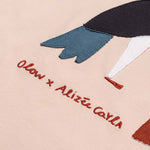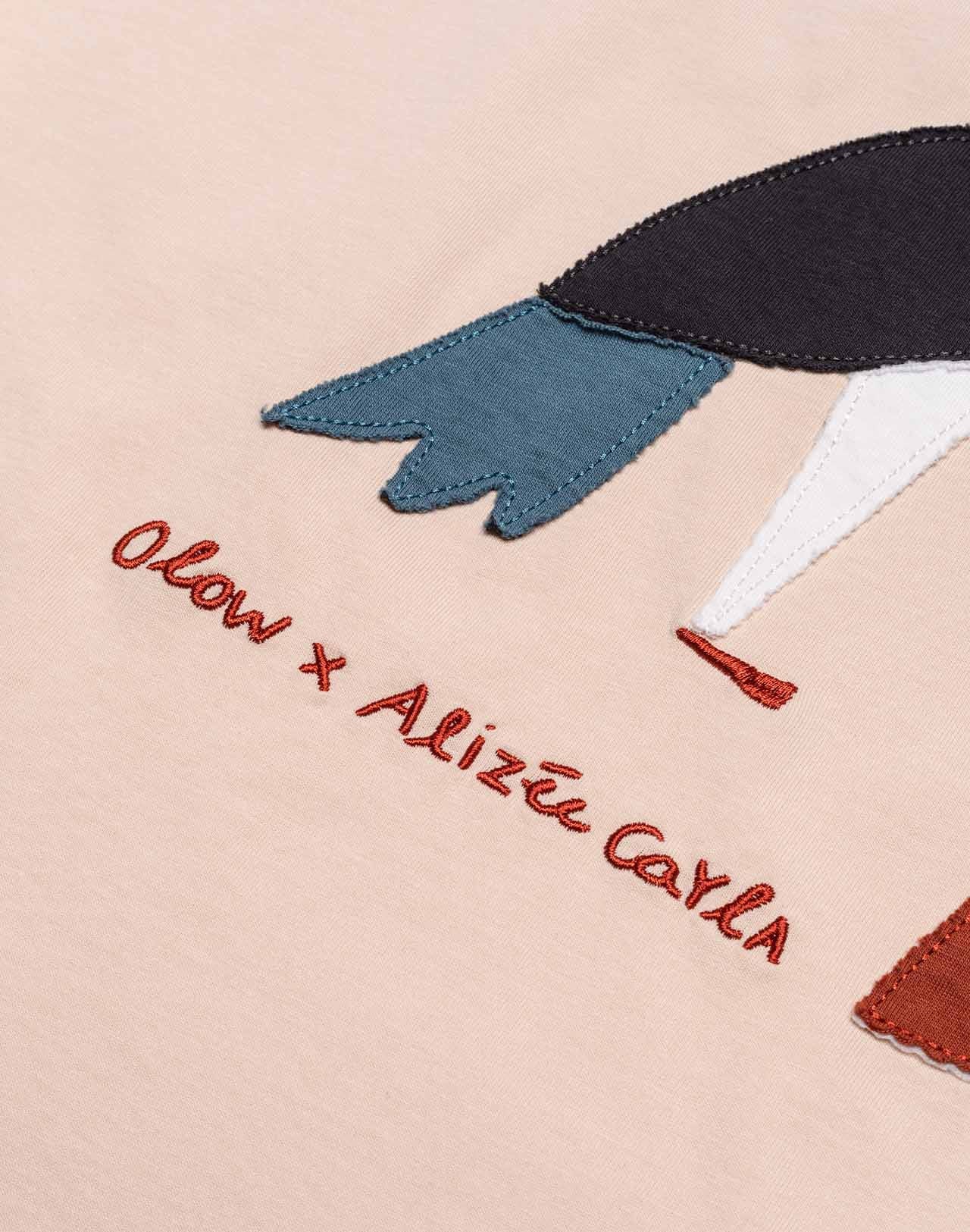 Camiseta holgada de algodón orgánico con acabado texturizado y diseño gráfico, con zonas planas de tela cosida y bordados, todo ello inspirado en el mundo de la artista Alizée Cayla.