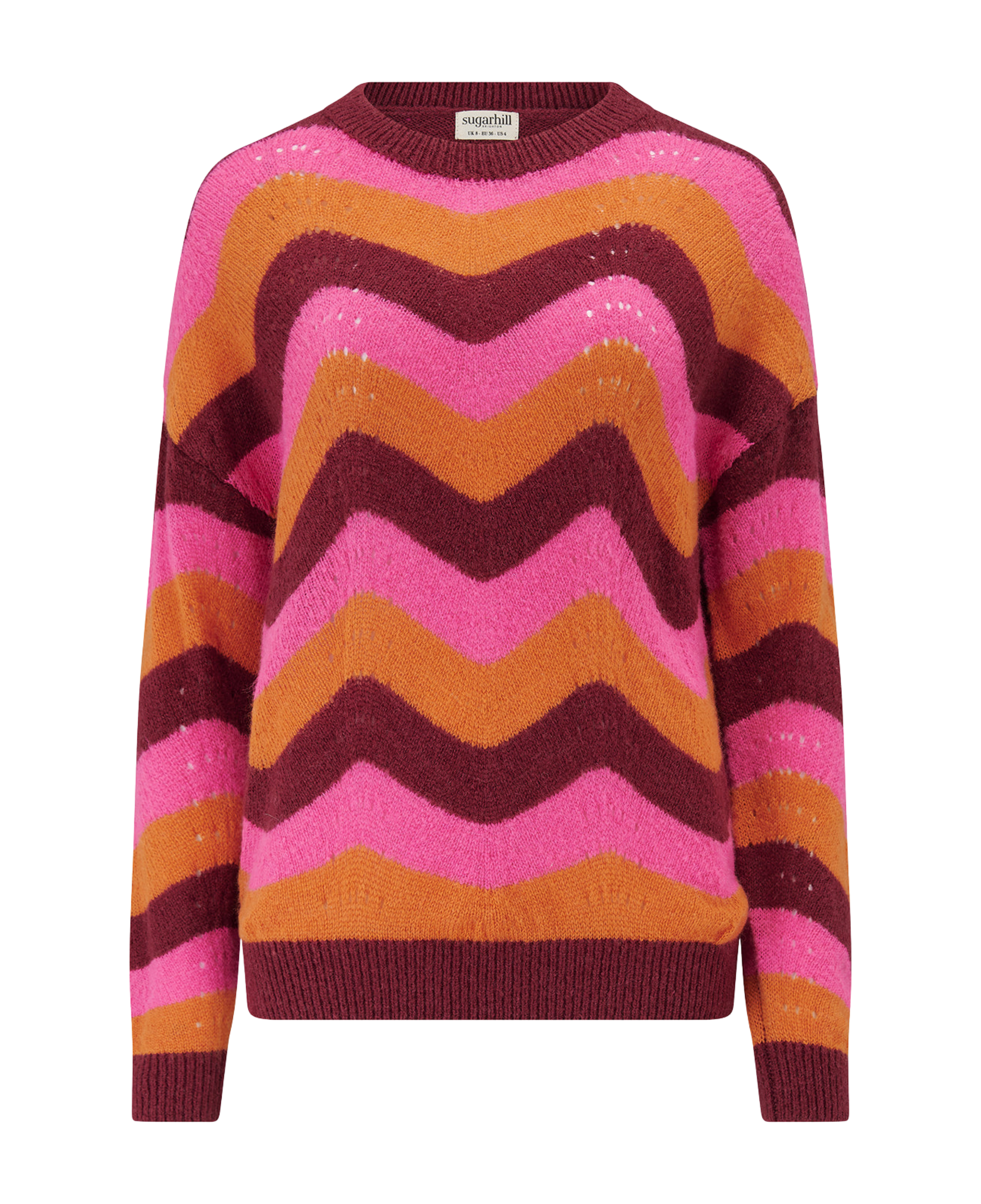 El jersey Evaline es un diseño atrevido y divertido pensado para alegrar tu armario. Con rayas onduladas de inspiración retro en rosa, naranja y burdeos, este jersey se realza con detalles de punto calado que le aportan una textura sutil y encanto. Con su corte holgado y su paleta de colores vivos, el Evaline es perfecto para combinar con otras prendas o para lucirlo solo.