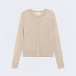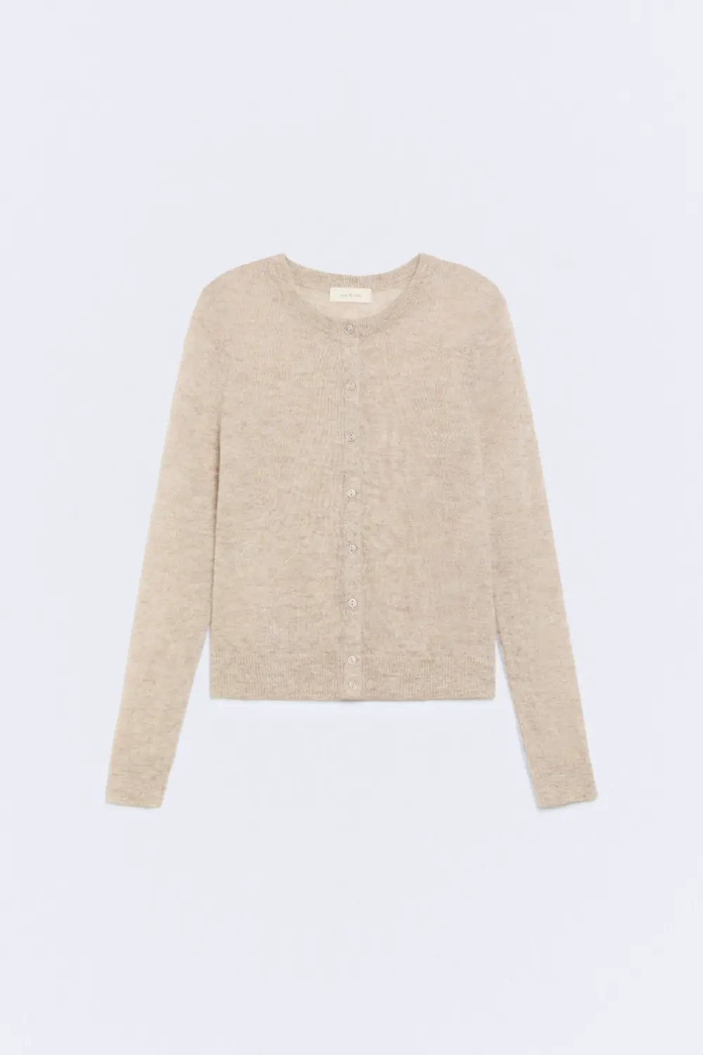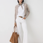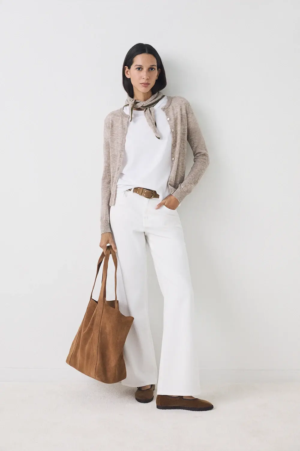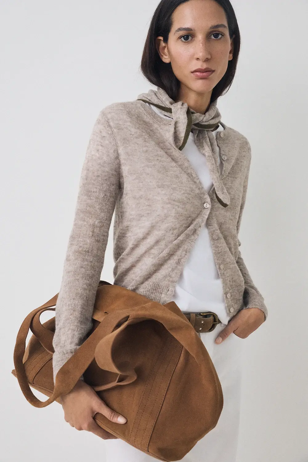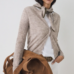 El cárdigan presenta un corte recto y ligero, con cuello en V y cierre de botones, mientras que el pañuelo aporta el toque final para un conjunto armonioso. Ideal para looks de oficina, cenas informales o para elevar un outfit casual con un toque de elegancia natural.