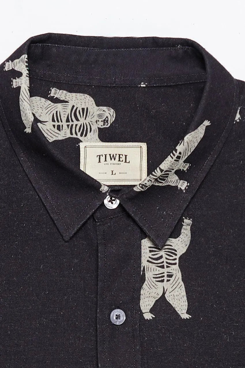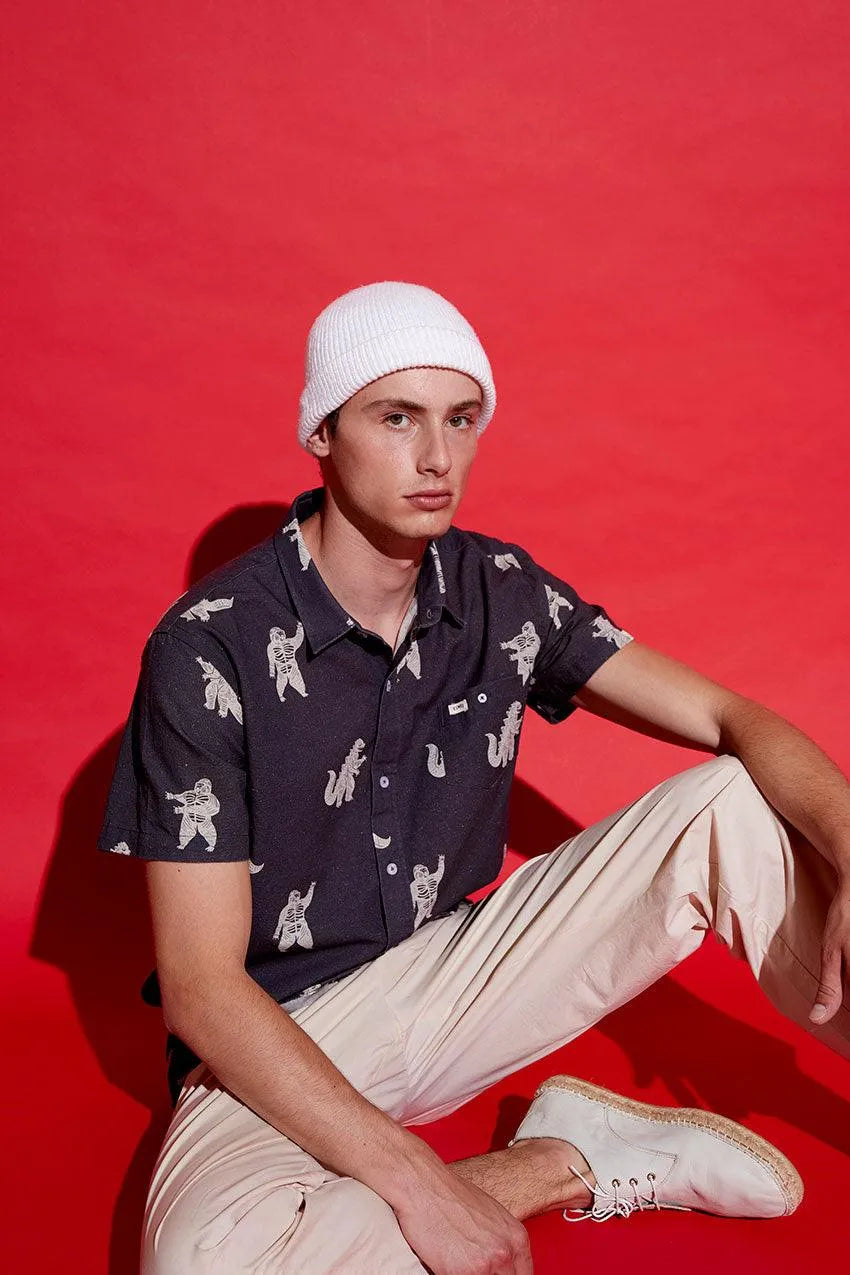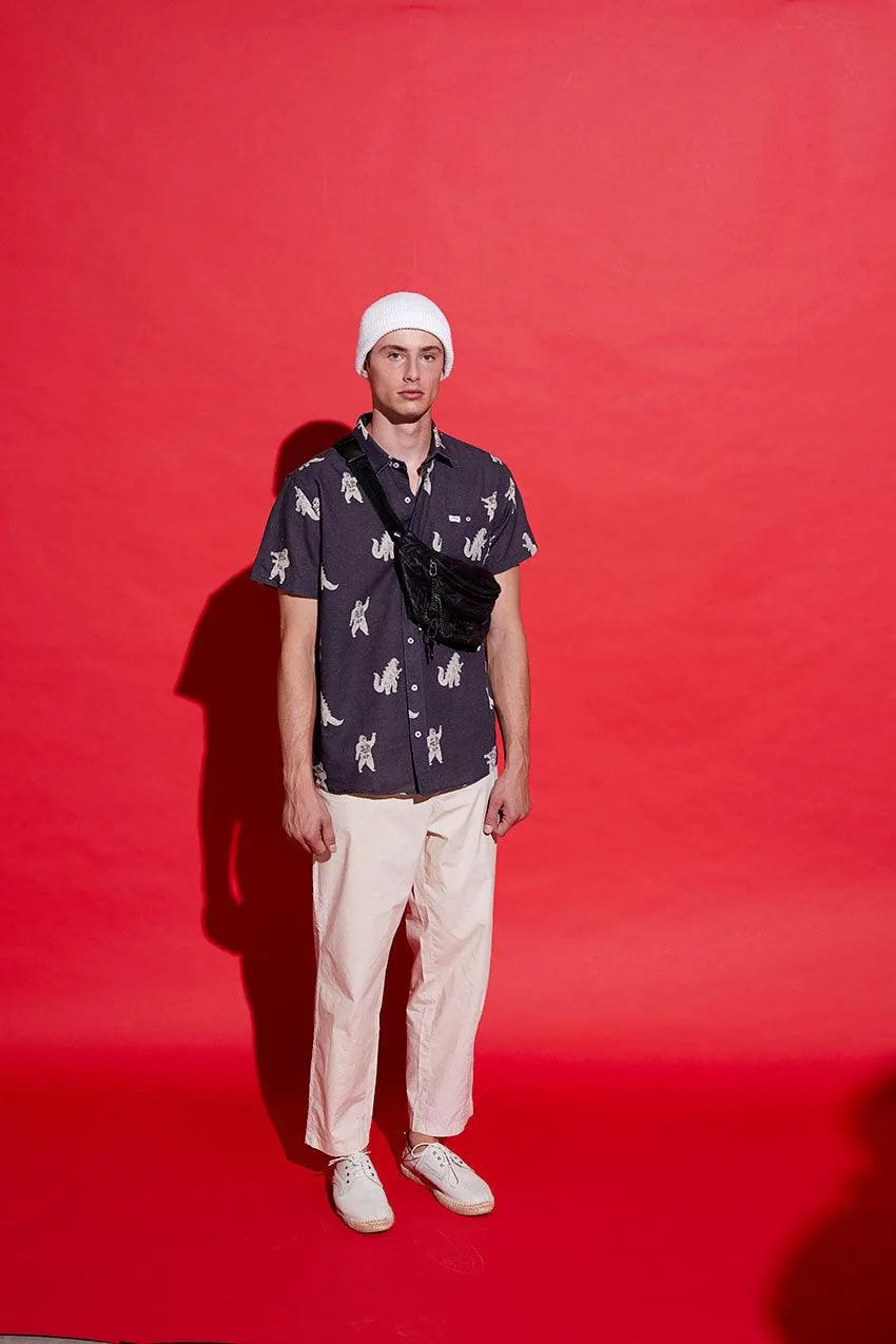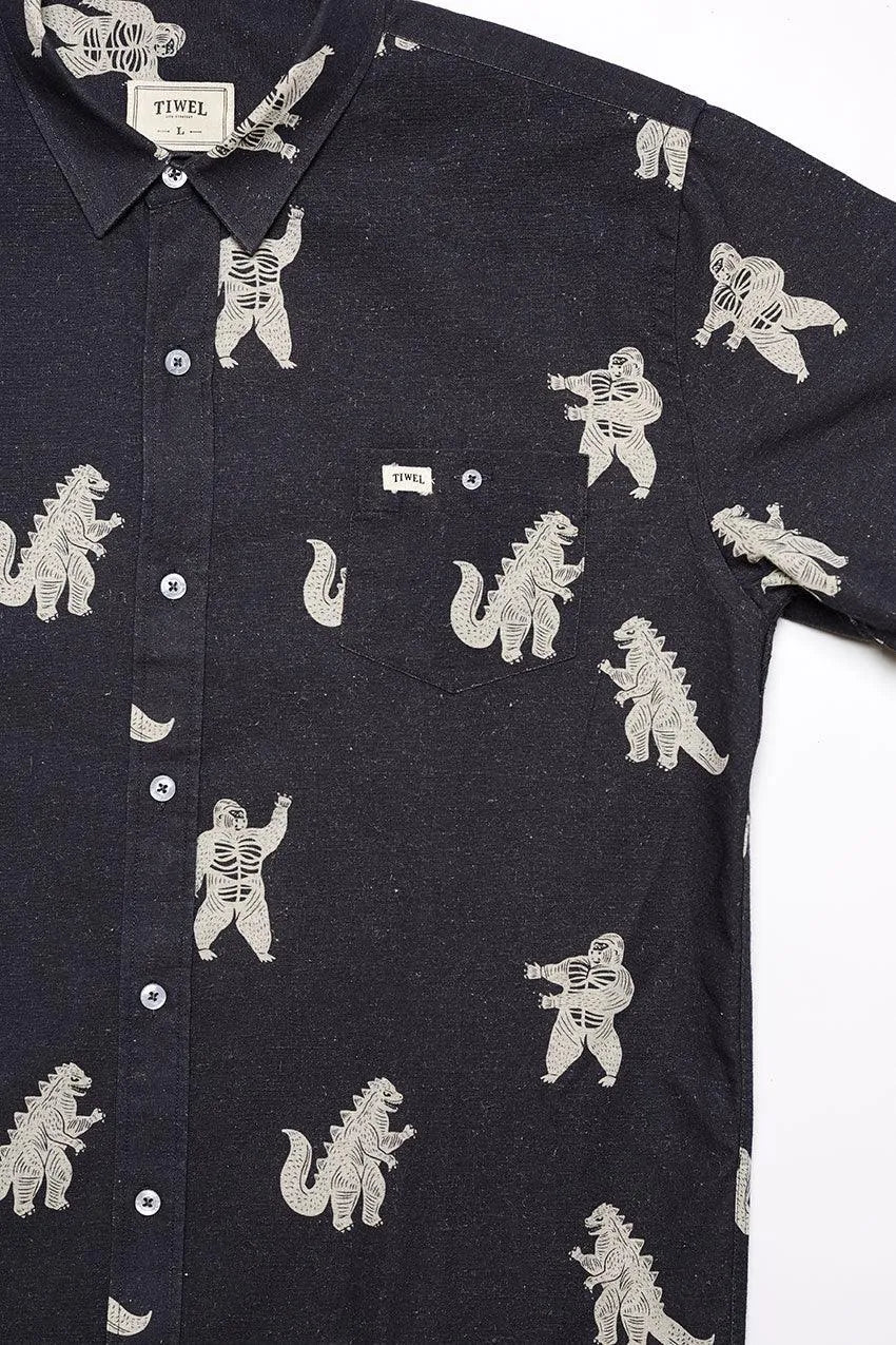 Black Maze shirt, short-sleeved and 75% Cotton / 25% Linen, with decoration and all-over-print of Godzilla and King Kong designed, exclusively, for the new special edition themed capsule “Lucky Blue - Nozawa Spirit”.