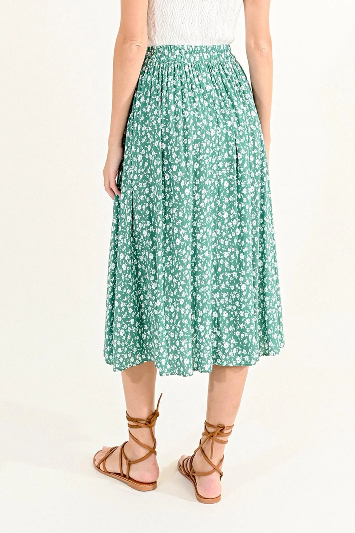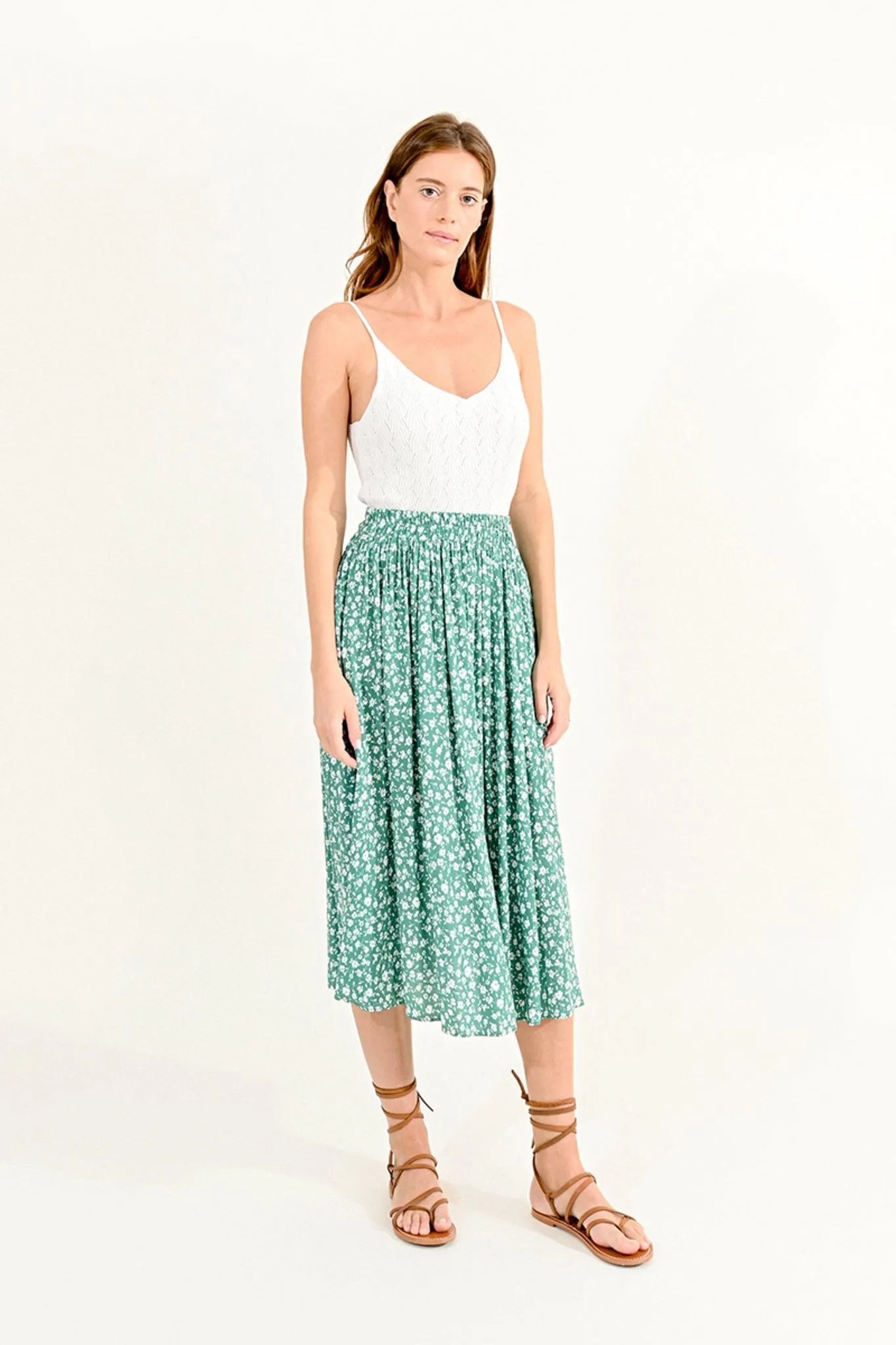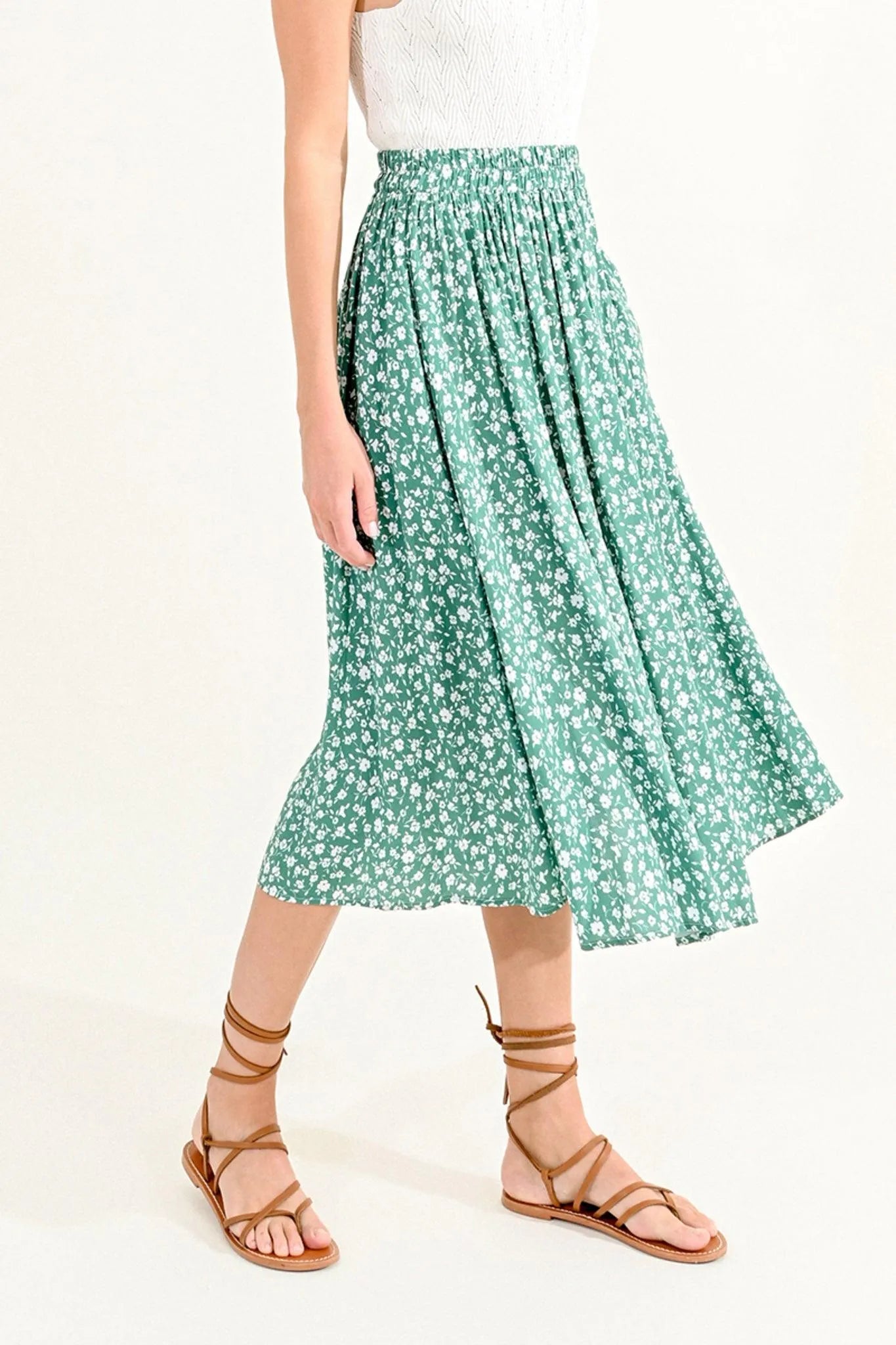 Long, high-waisted, pleated skirt. Model with floral print and elastic waist.