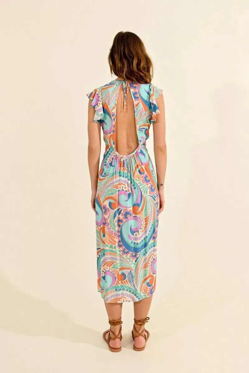 Long dress, with short butterfly sleeves, V-neckline and pleats. Model with multicolor print and open back. Front button closure.