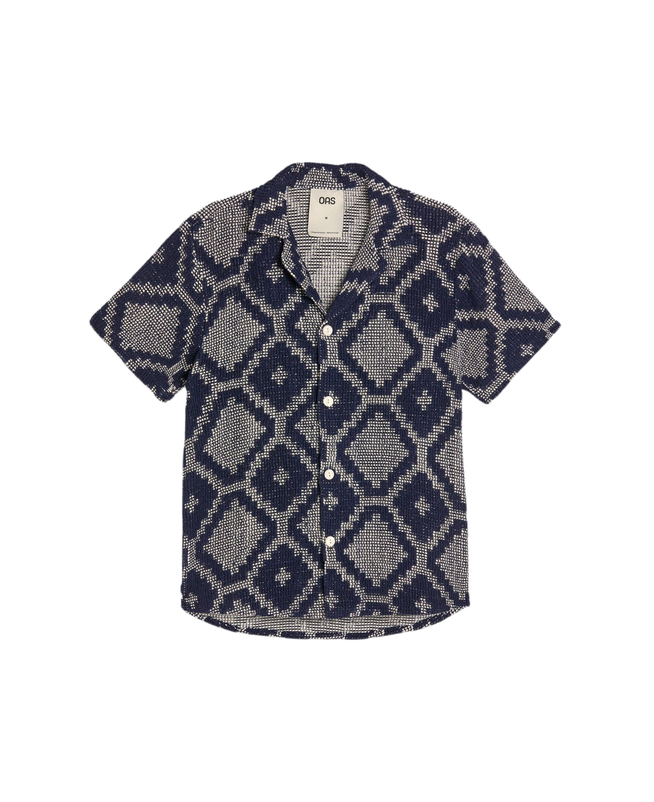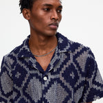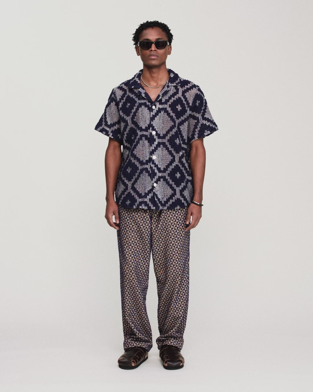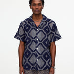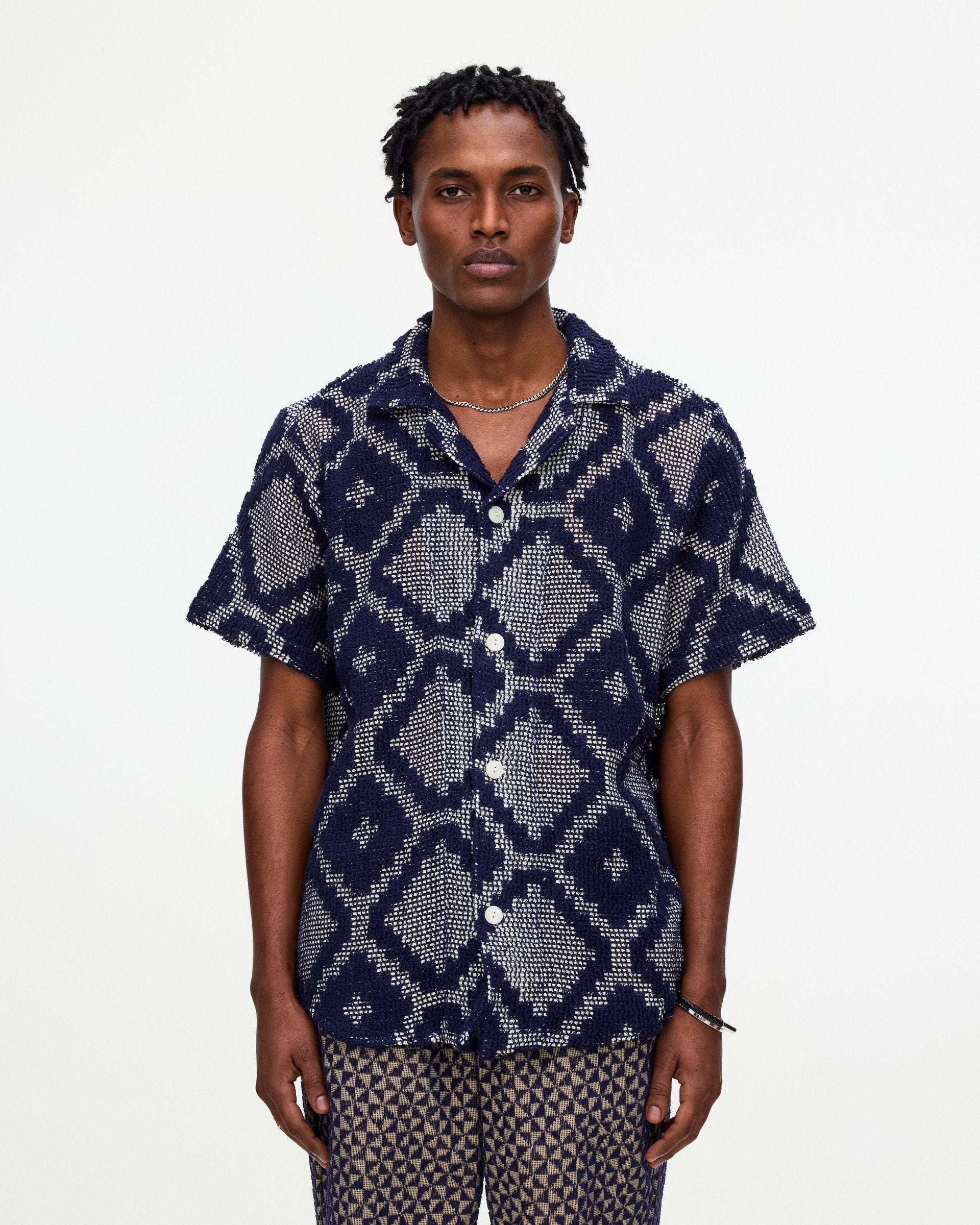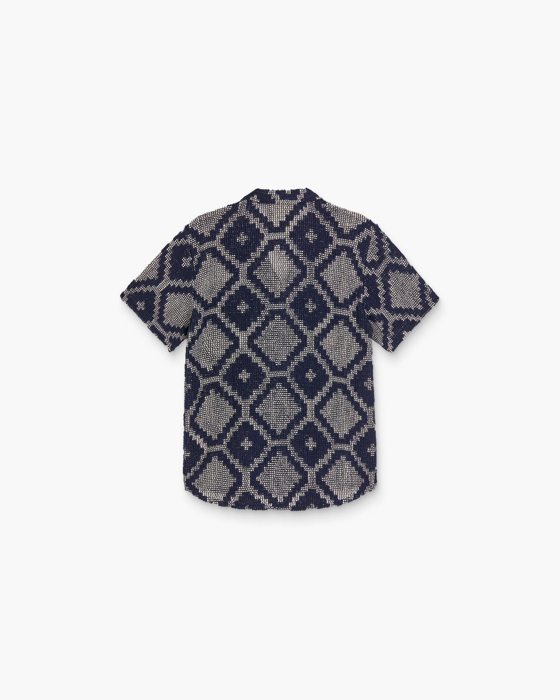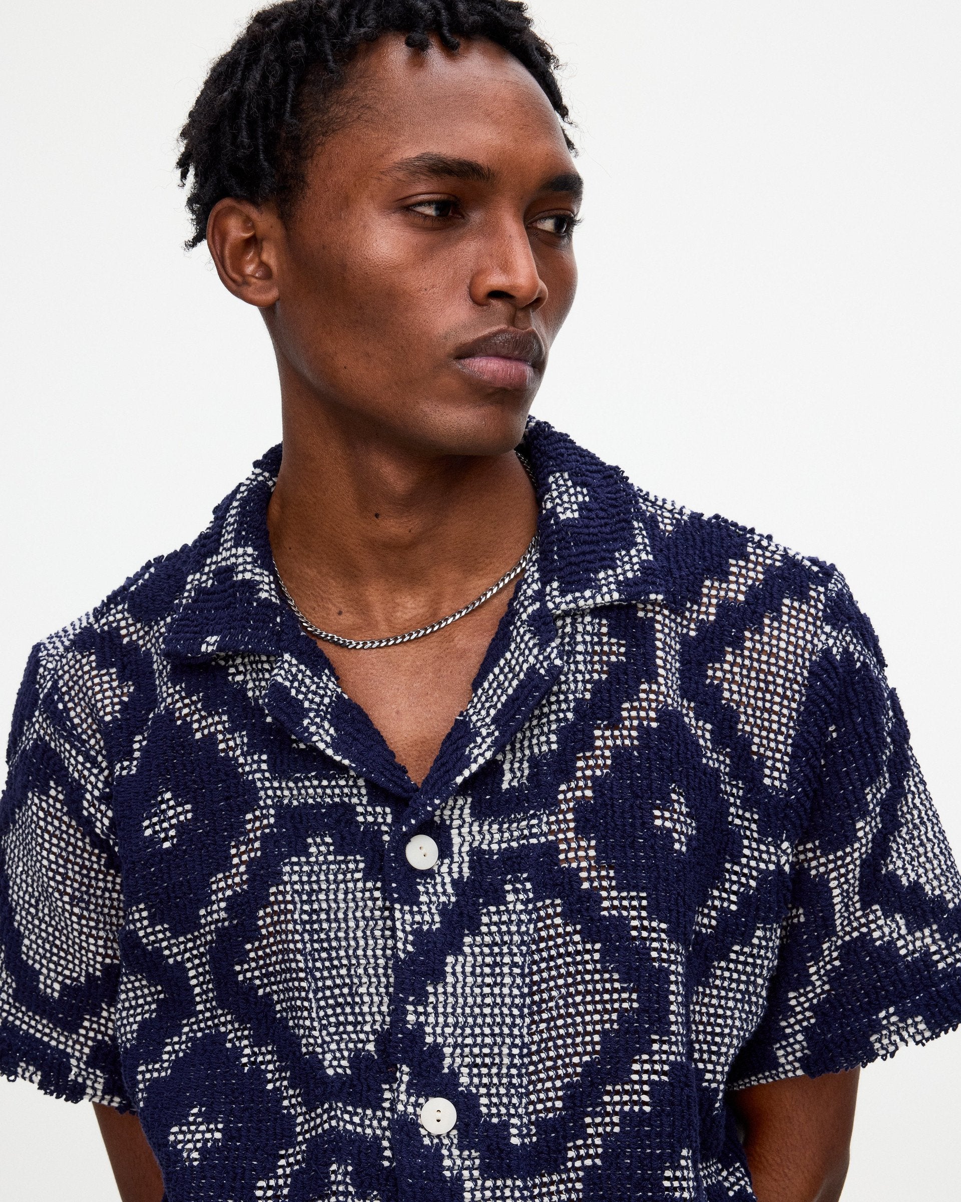 The Trastevere crochet Cuba shirt features a textured take on mosaic motifs with its two-tone jacquard print. A fitted yet relaxed holiday essential, it features a resort collar and button-front closure.
