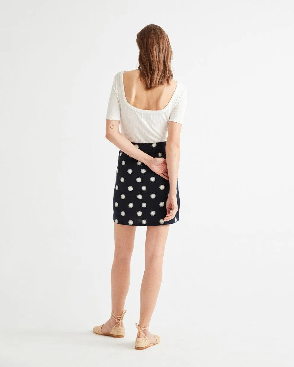 SHORT AND STRAIGHT SKIRT WITH OPENING. WITH INVISIBLE ZIPPER AND BUTTON ON THE SIDE. PRINTED FABRIC WITH ROTATING TECHNIQUE
