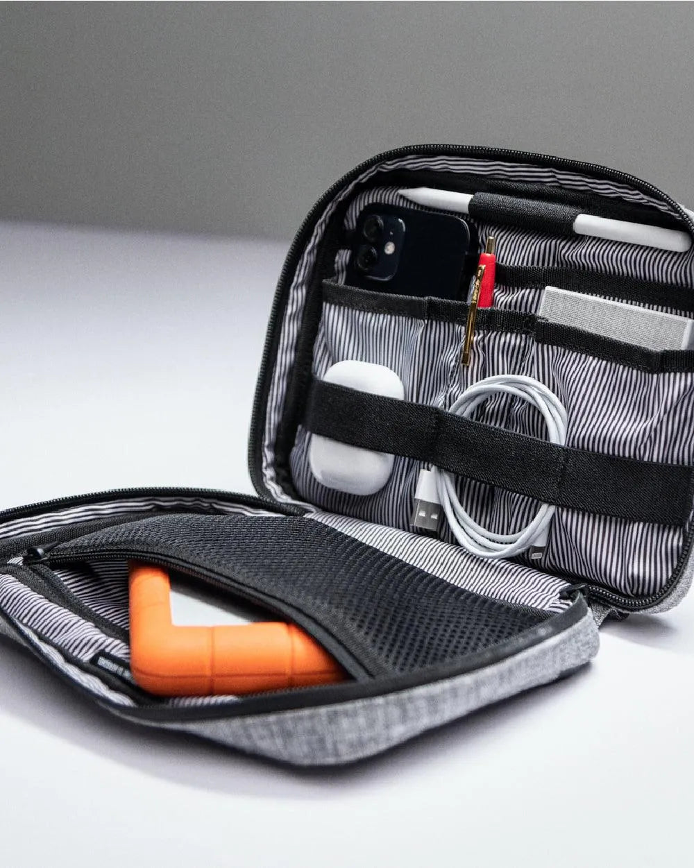 Keep it together. From your small devices to your cables, chargers and mouse, the Tech Organizer keeps everything protected on the go. With storage pockets and elastic organizers to keep your tech accessories in place, this compact style opens wide for easy access to essentials.