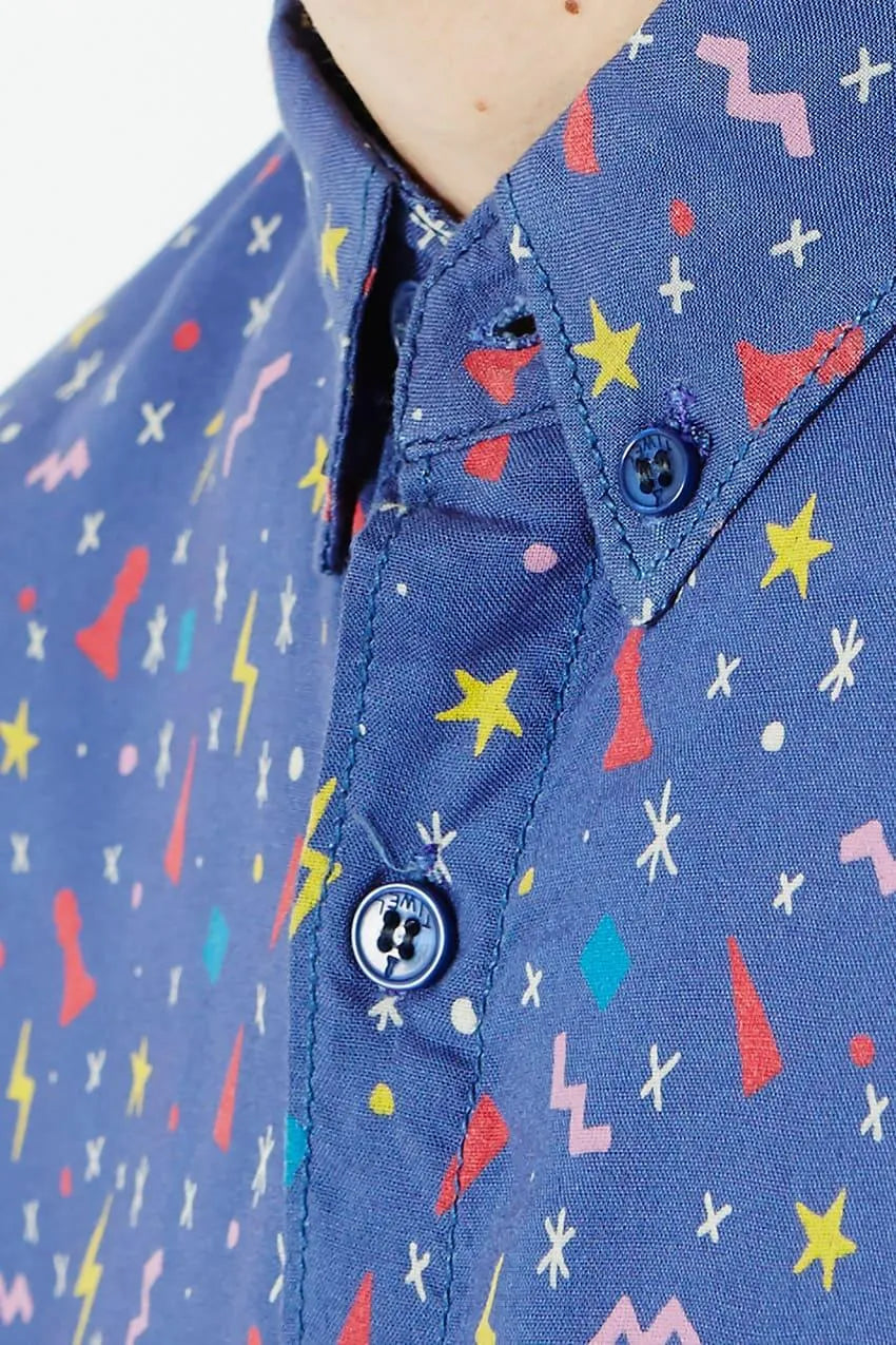 Directly from Moraland, comes this blue short-sleeved Kimora shirt printed with different multicolored motifs where the pawn cannot be missed, designed exclusively for the special edition of Tiwel by Sergio Mora . Front buttons and chest pocket.
