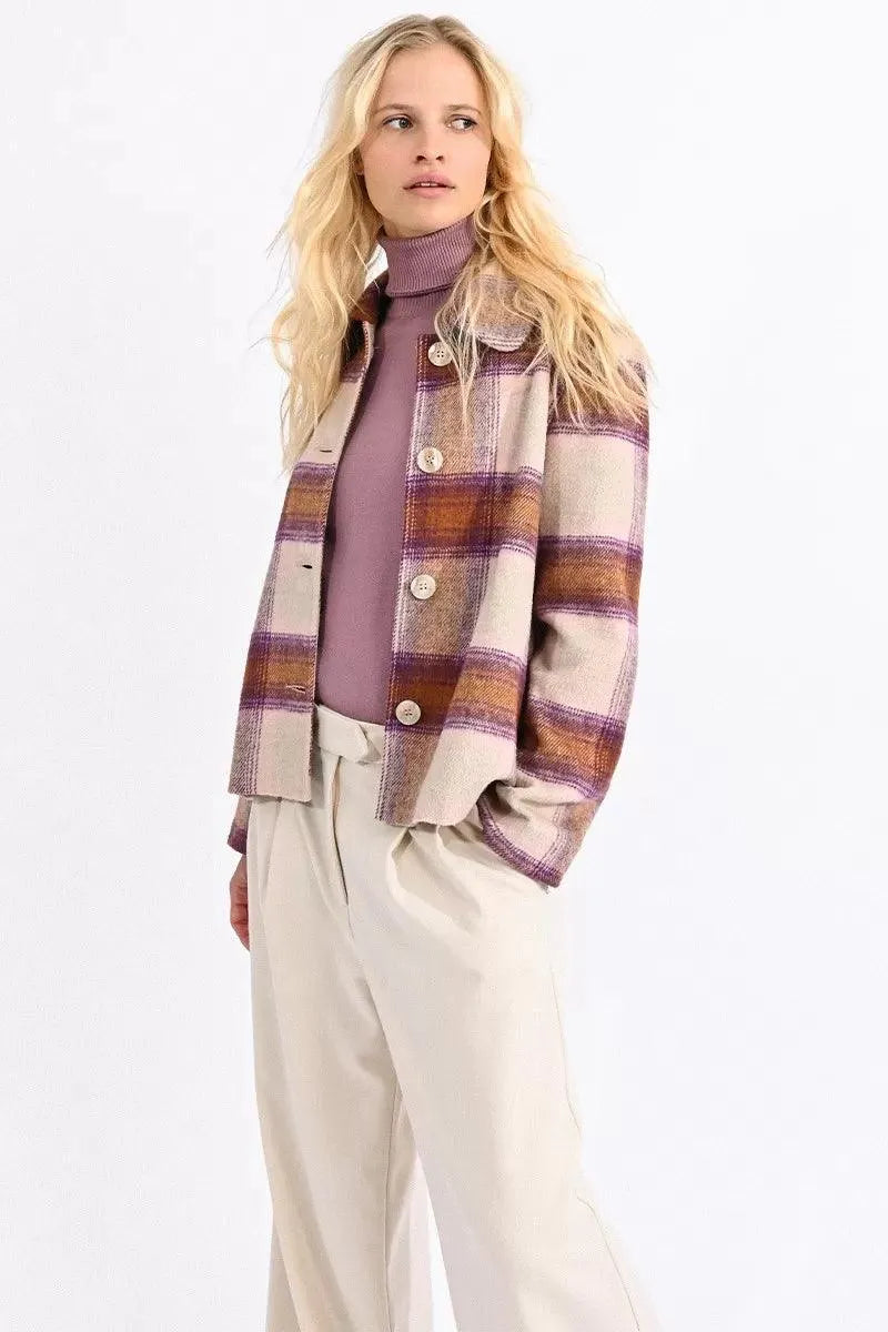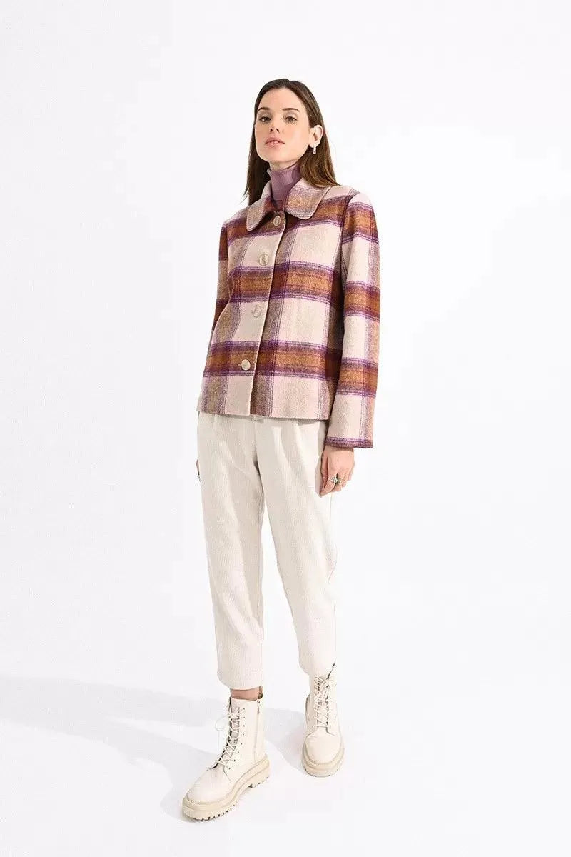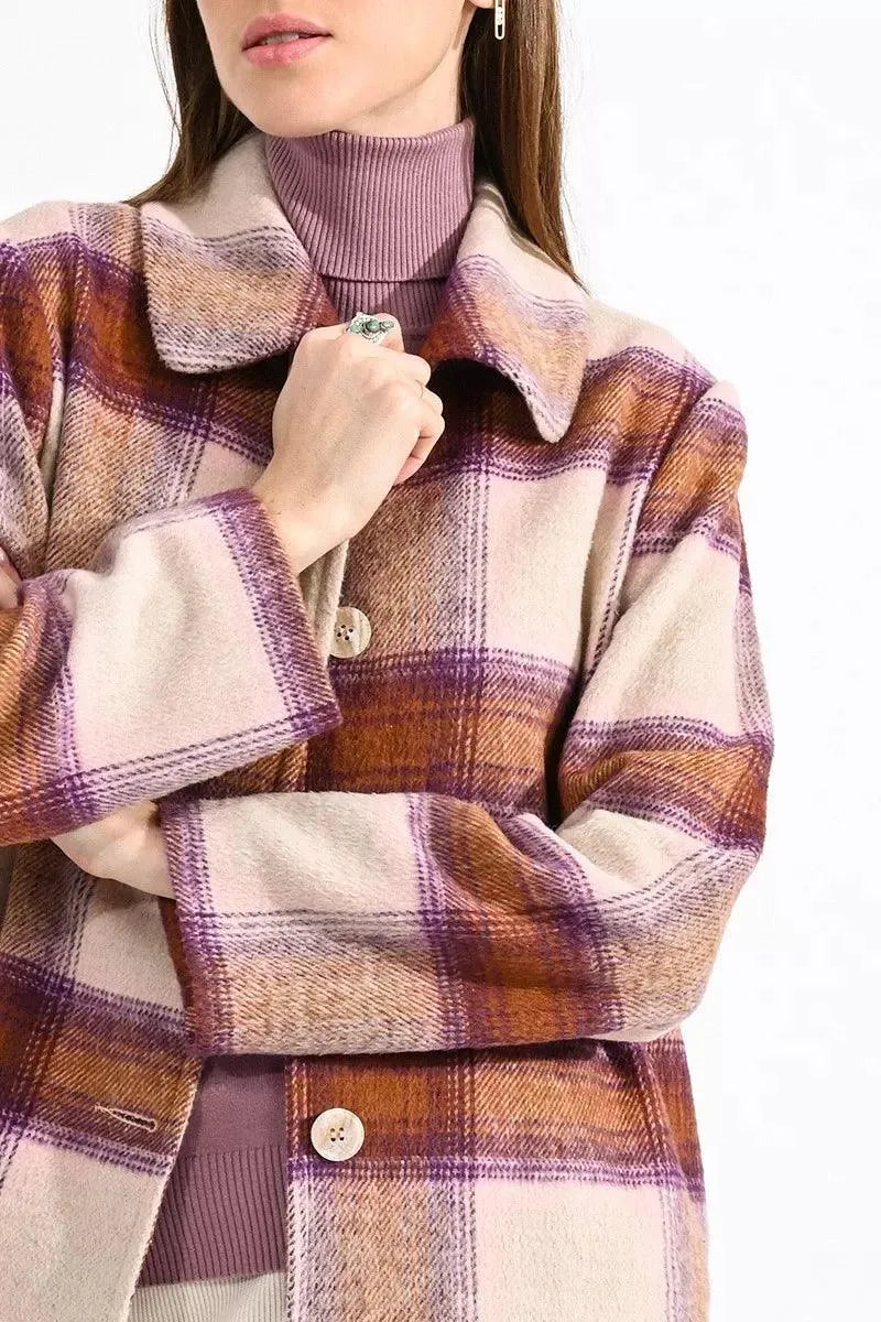 Short coat, long sleeves, with collar. Model with checkered print and front button closure.