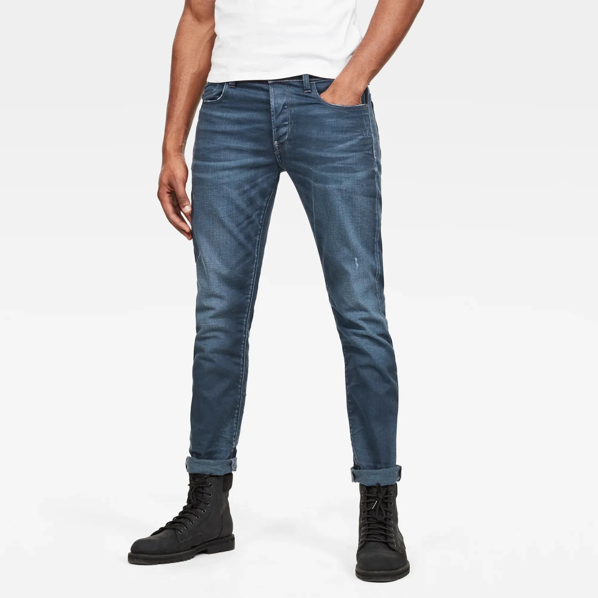 The G-Bleid Slim jeans feature a Western-inspired design and feature typical tool belt elements for strength and durability. In addition, this authentic five-pocket model has two additional pockets. The small nail pocket on the waistband offers a hidden compartment. The other pocket, located at the back of the hip, is made with sturdy stitching. The corners of the back pockets have a solid gusset created with hidden stitches. The back loops are set at an angle.