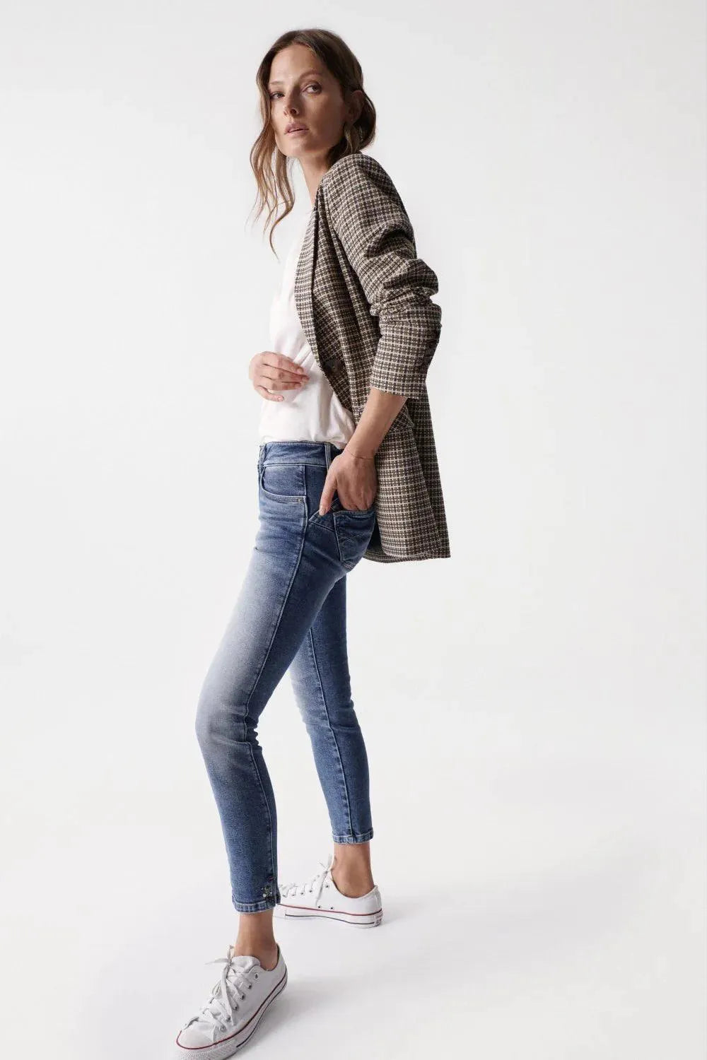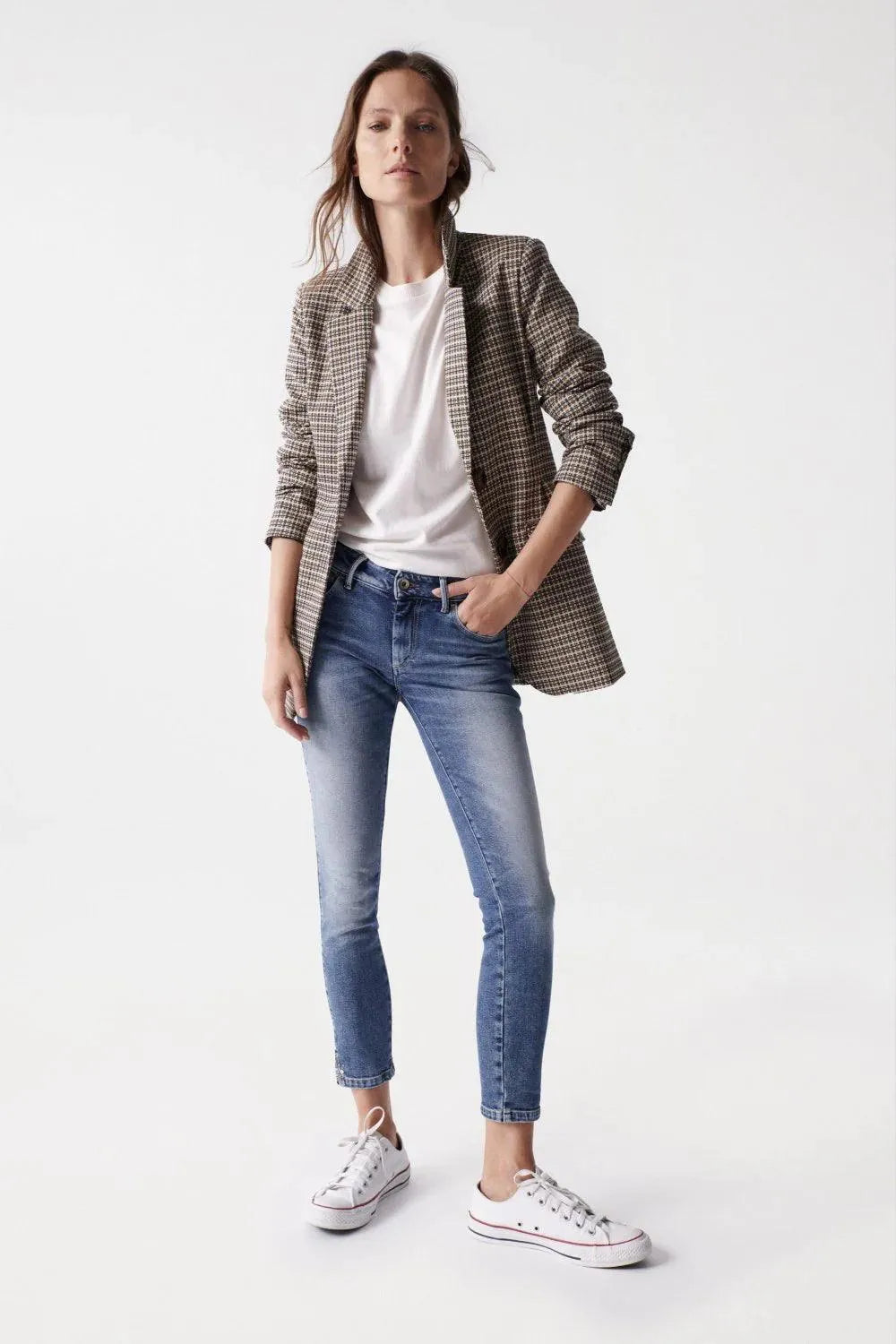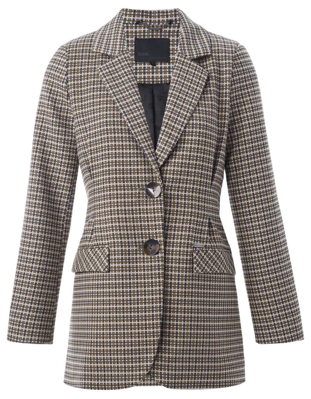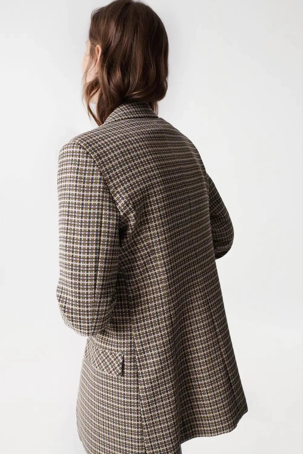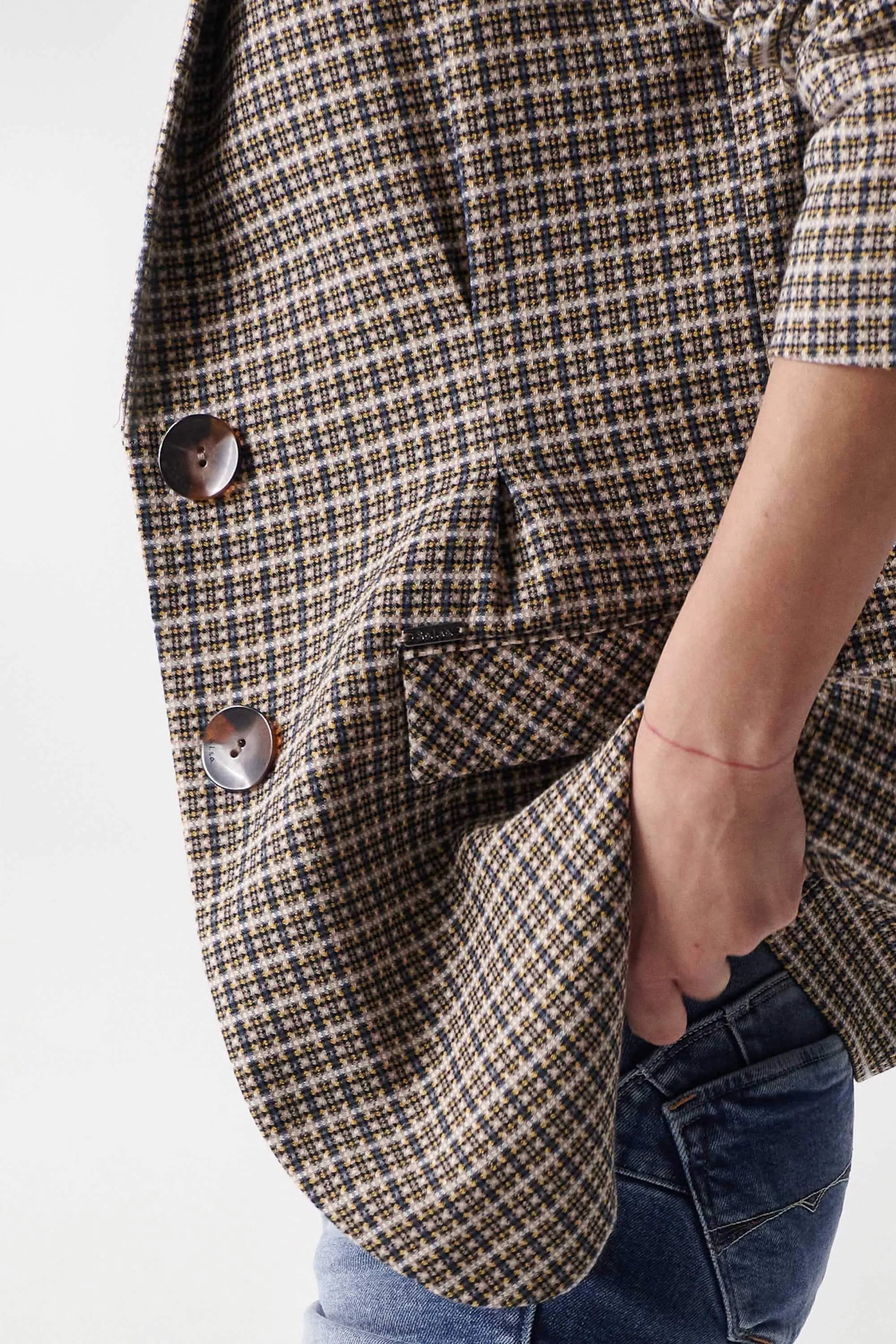 Textured cloth blazer. Plaid print. Regular cut. V-neck with lapels. Long sleeve. Double front button fastening. Front pockets with flap. Inner lining.