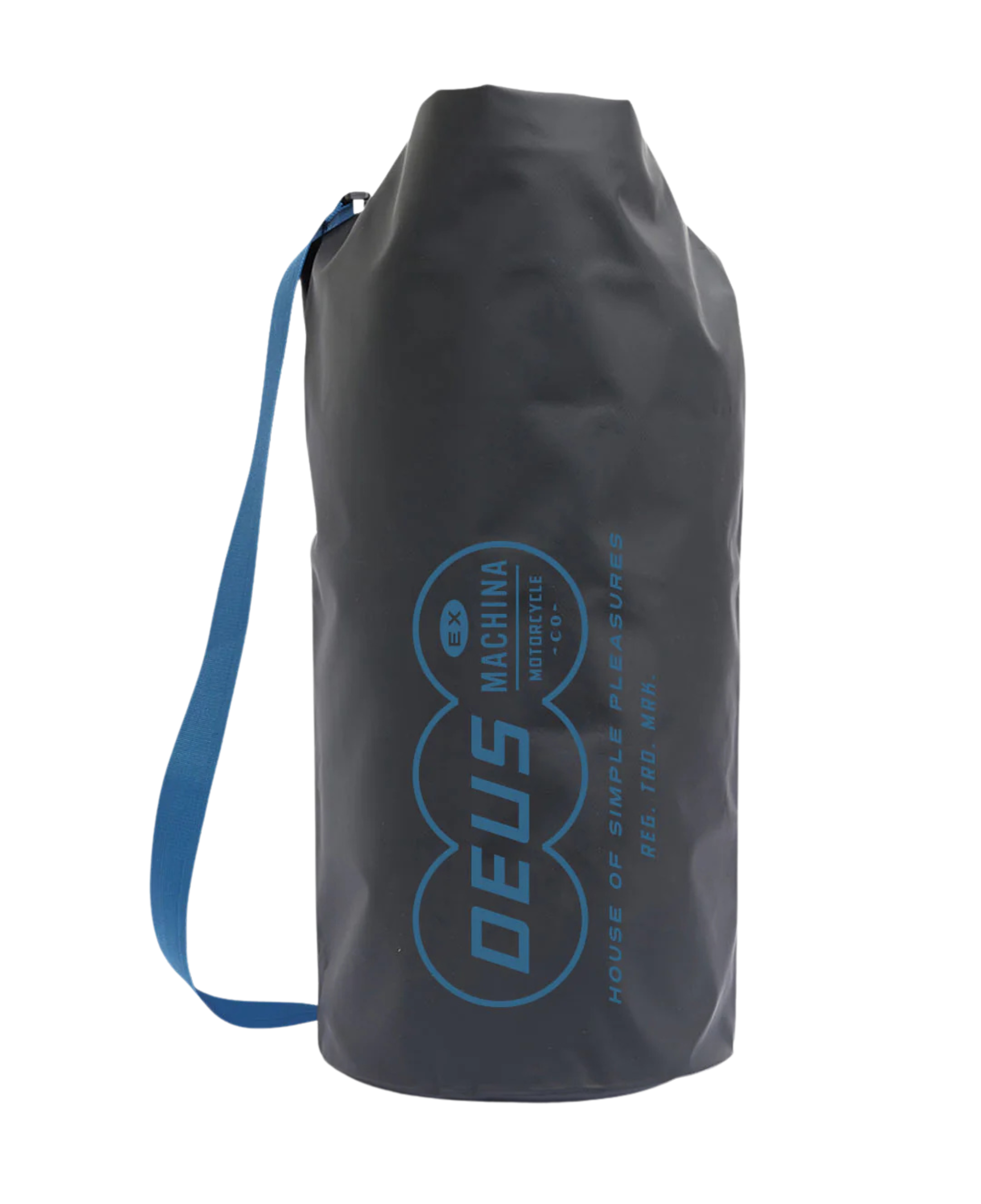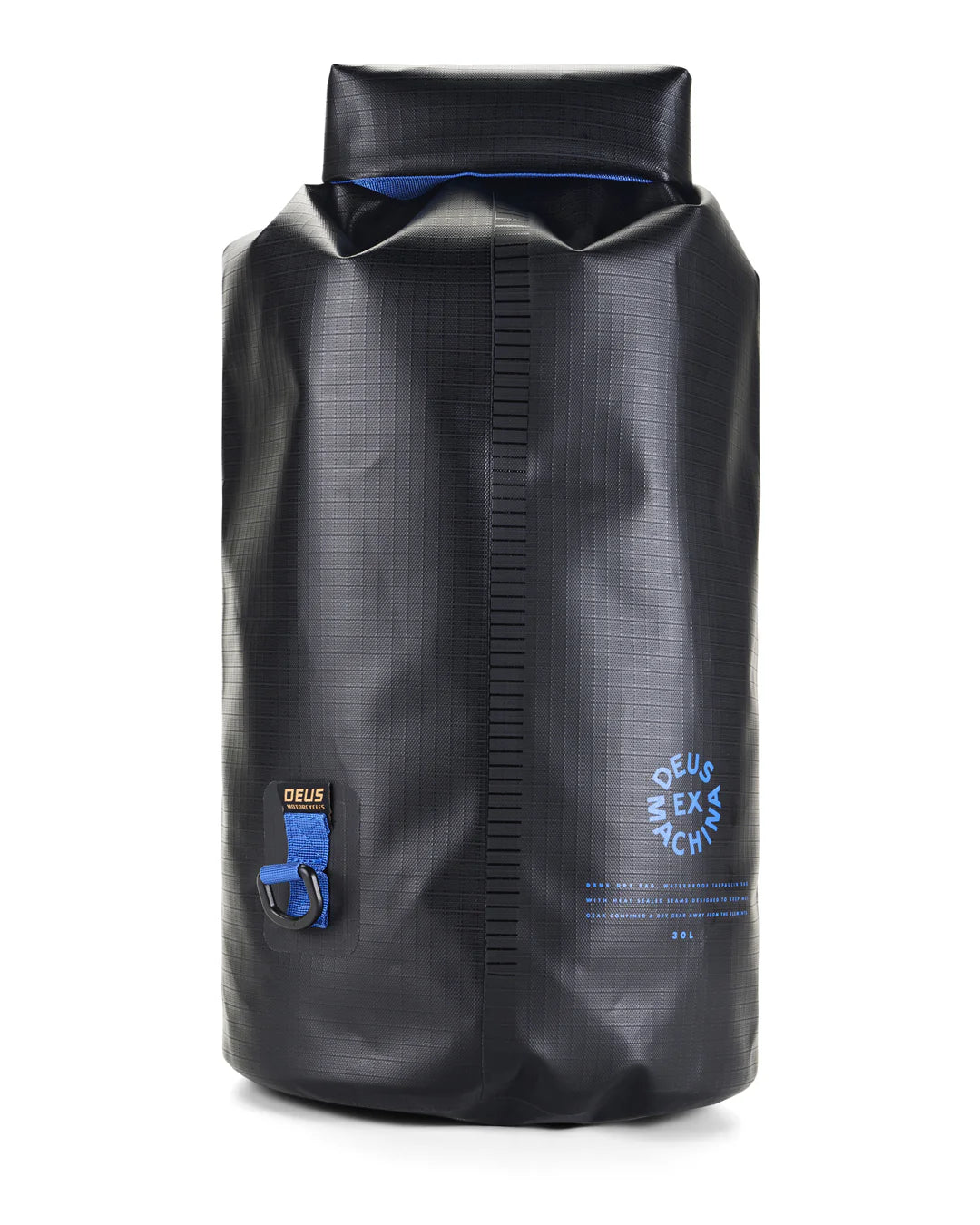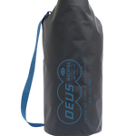 PVC dry bag. Waterproof and ideal for water sports and outdoor activities. DEUS brand print. 30L capacity. 38cm wide webbing shoulder strap with a 22cm base.