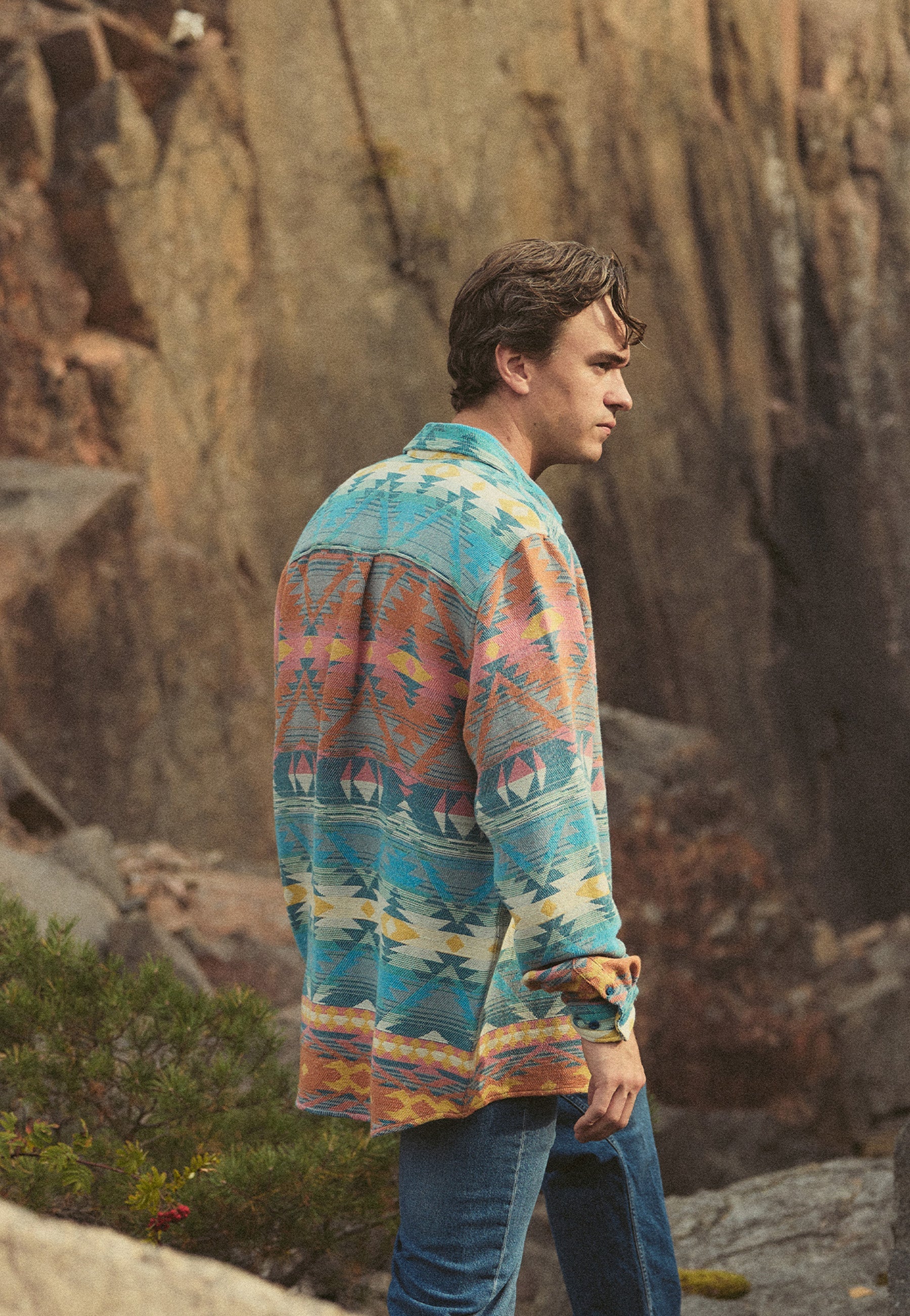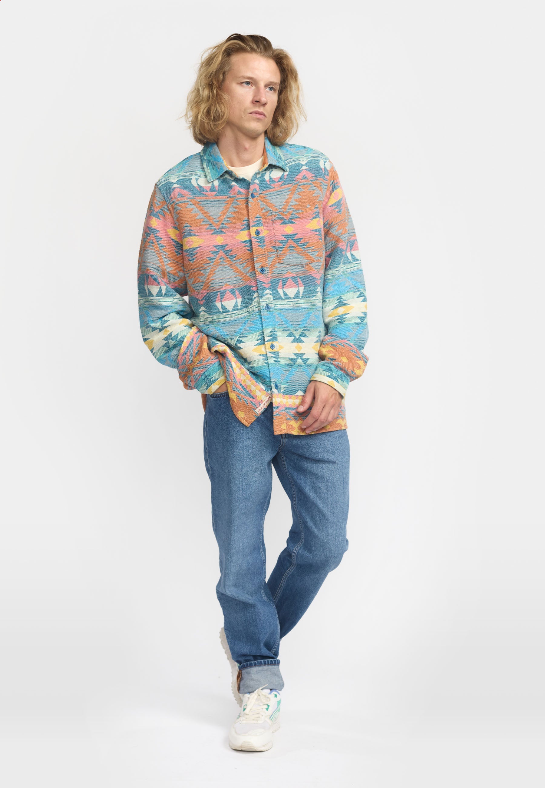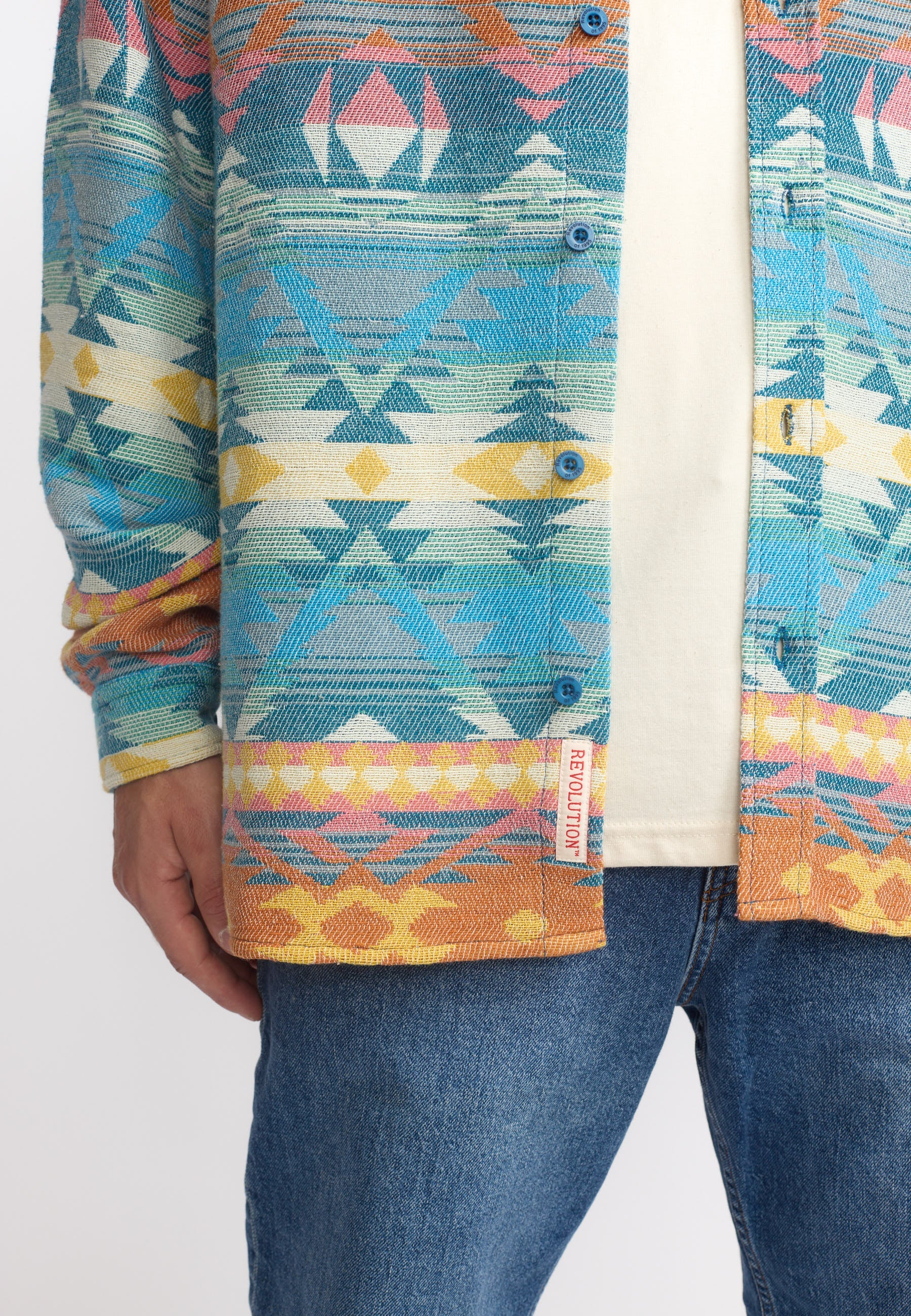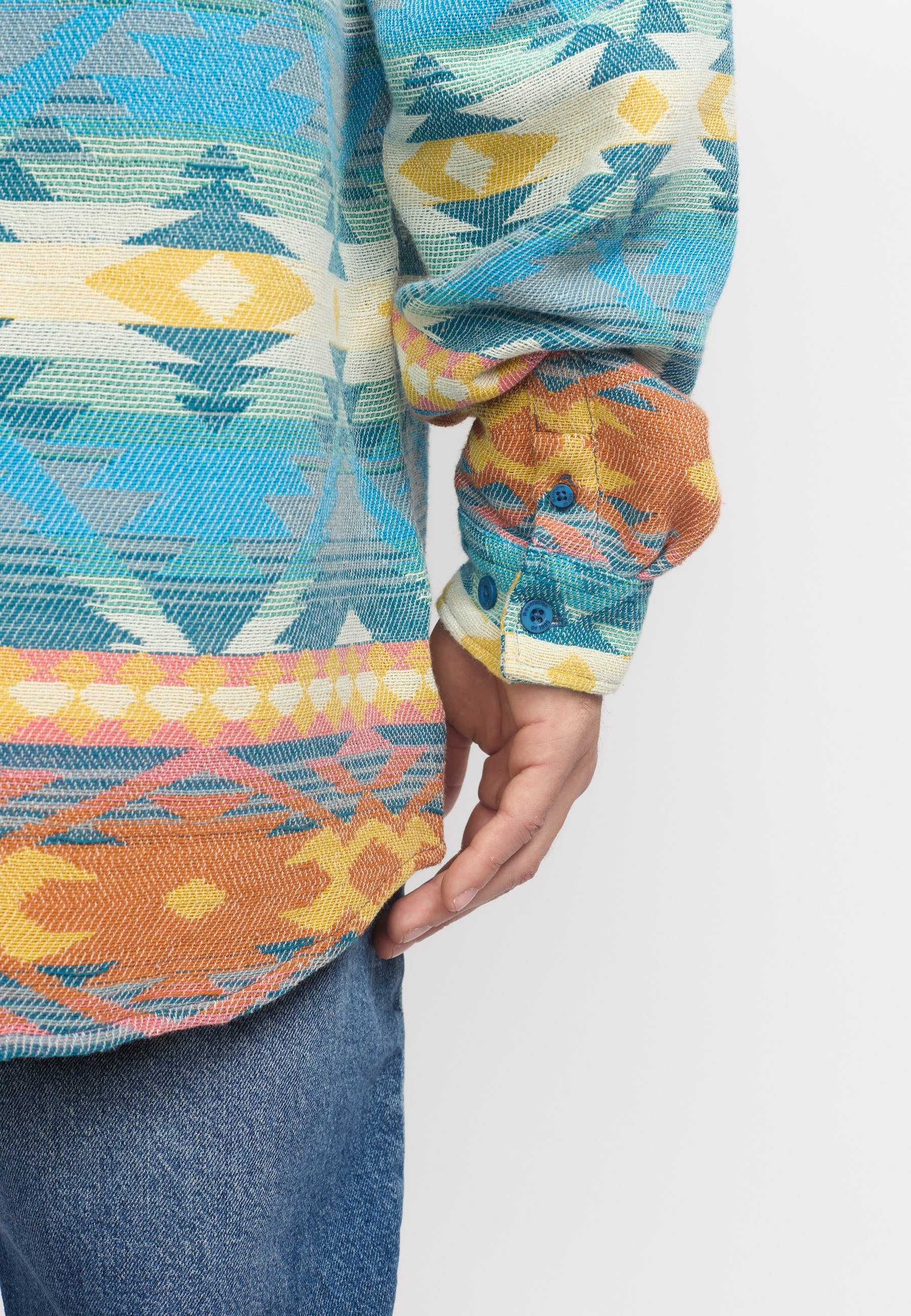 Medium-weight shirt crafted from a soft cotton fabric. This loose-fitting shirt is designed with a single, sharp-cut chest pocket and a button-down front, finished with 4-hole buttons. The shirt has adjustable cuffs for comfort and is crafted with a double-layered yoke and a center-back pleat for strength and improved mobility. The colorful print with signature geometric shapes is inspired by ancient Aztec traditions and is woven using the jacquard technique. Jacquard weave is made by pre-dyeing the yarns before weaving, ensuring greater colorfastness and durability compared to designs simply printed onto the fabric.