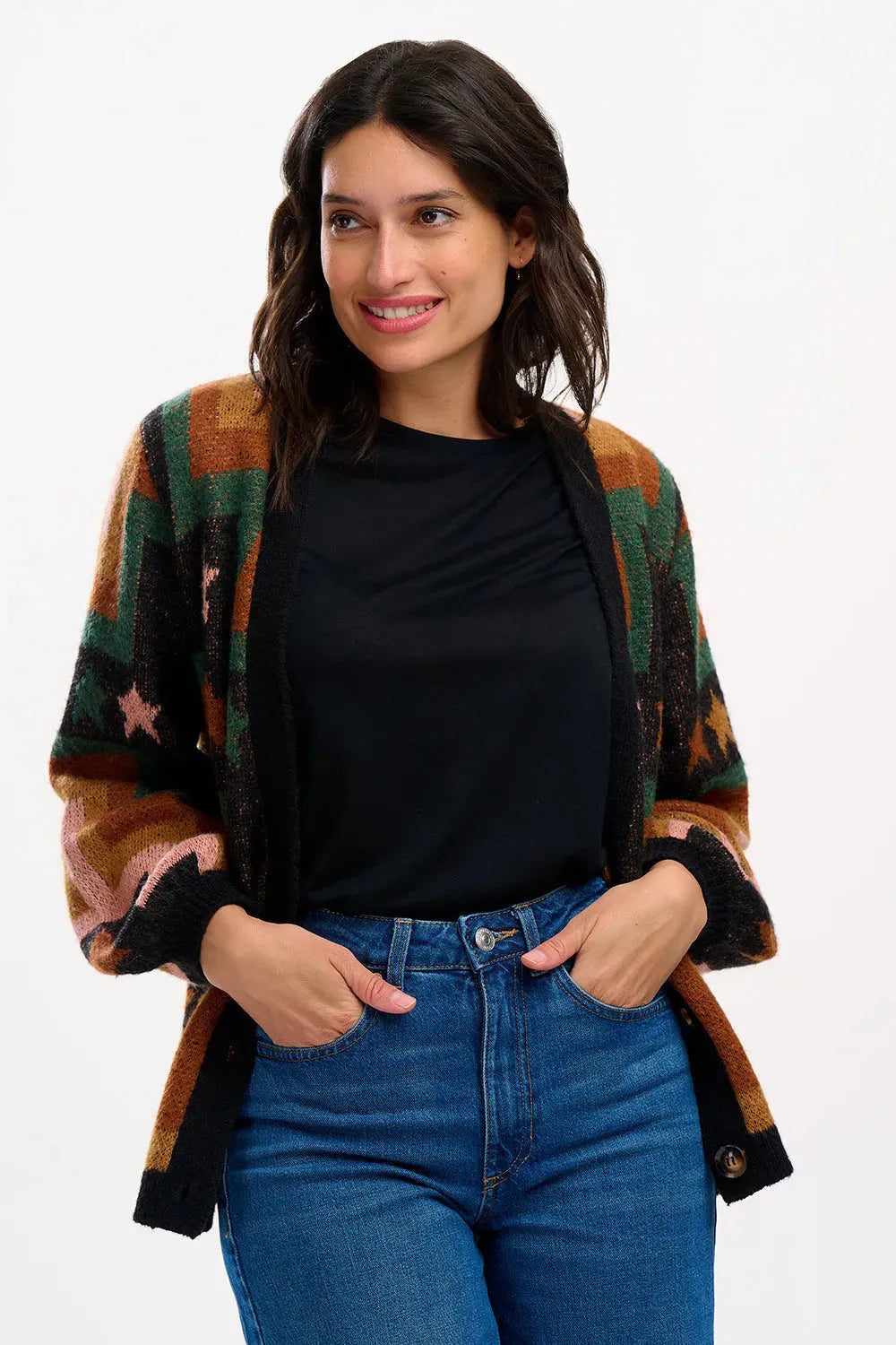 The relaxed-fit Morganna cardigan features the same graphic designs as the Sugarhill sweaters in a chunky double-knit fabric and blouson sleeves.