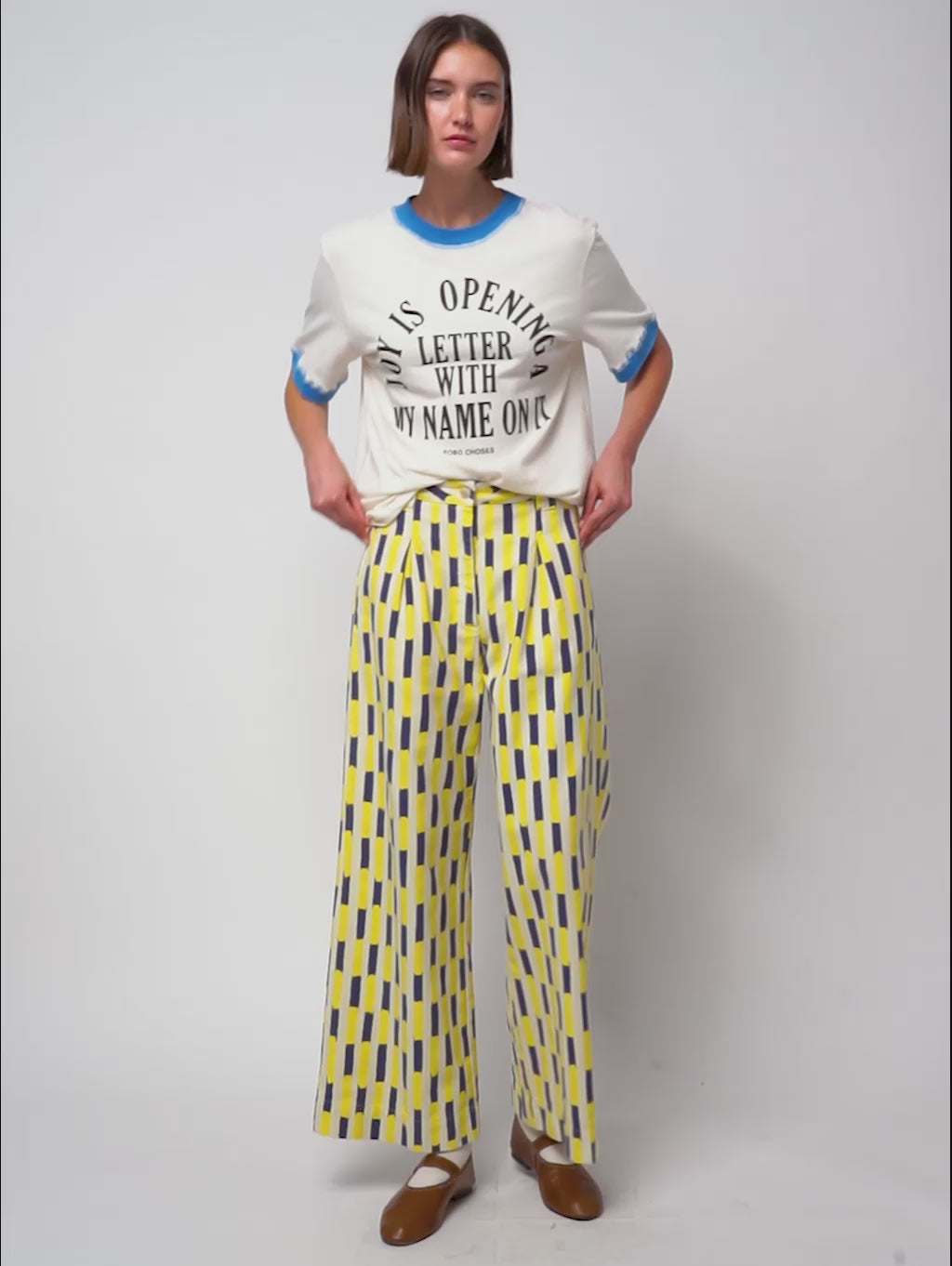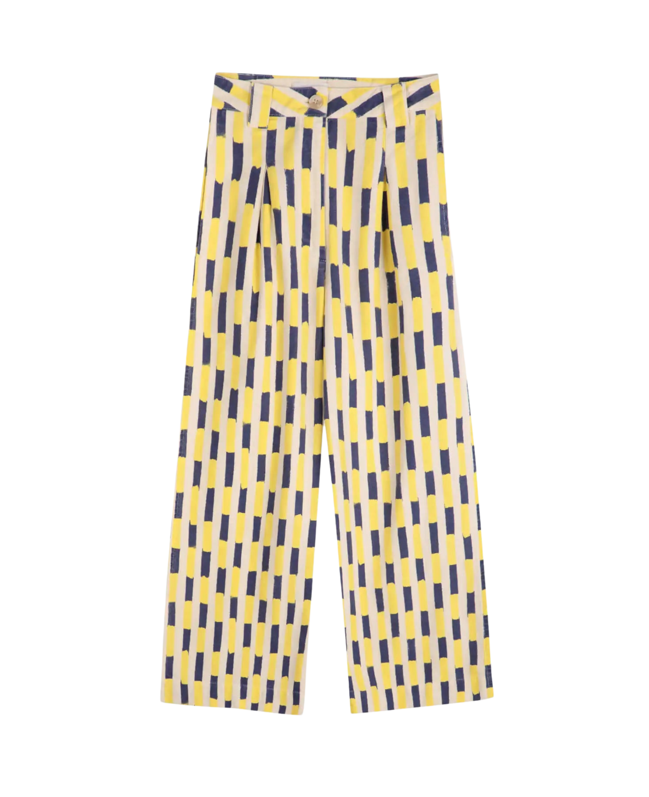 Add a touch of sophistication to your wardrobe with these multicolored wide-leg pants. Made with 80% cotton and 20% recycled cotton, the high-rise design and maxi-length cut create a silhouette with personality. Responsibly made in Spain, combining style with conscious production.