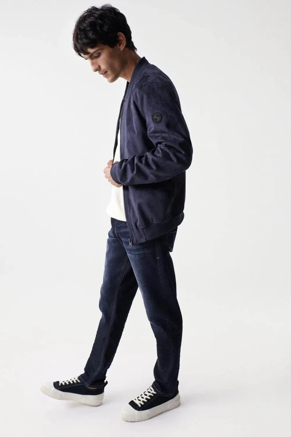Navy blue bomber jacket with suede type fabric and machine washable.