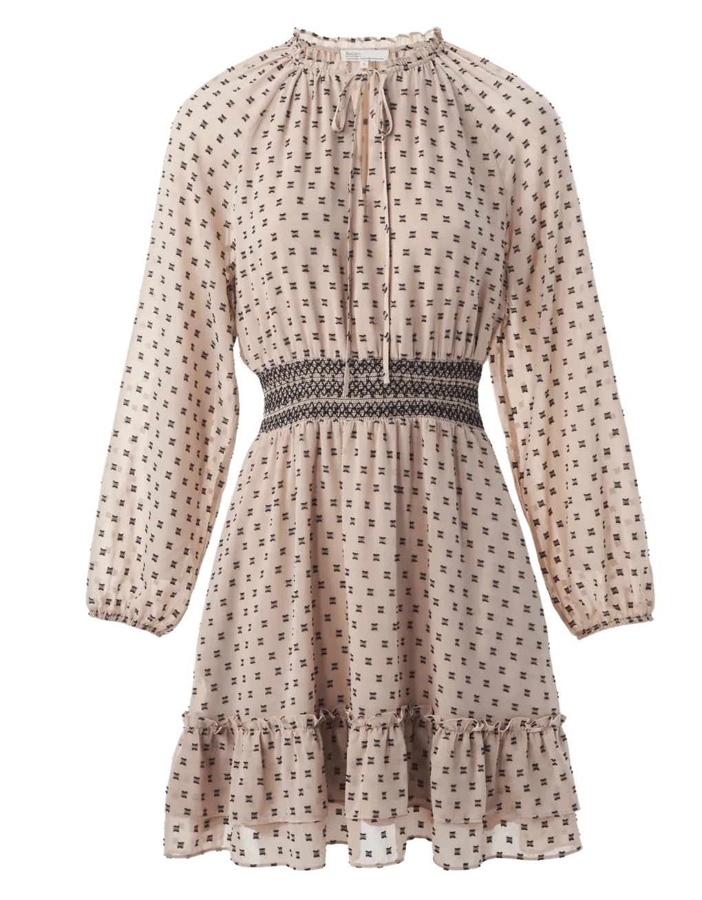 Short textured dress. Peak neck. Long sleeves with elastic at the wrist. Elastic effect waist. Ruffle detail at the bottom. Lined.