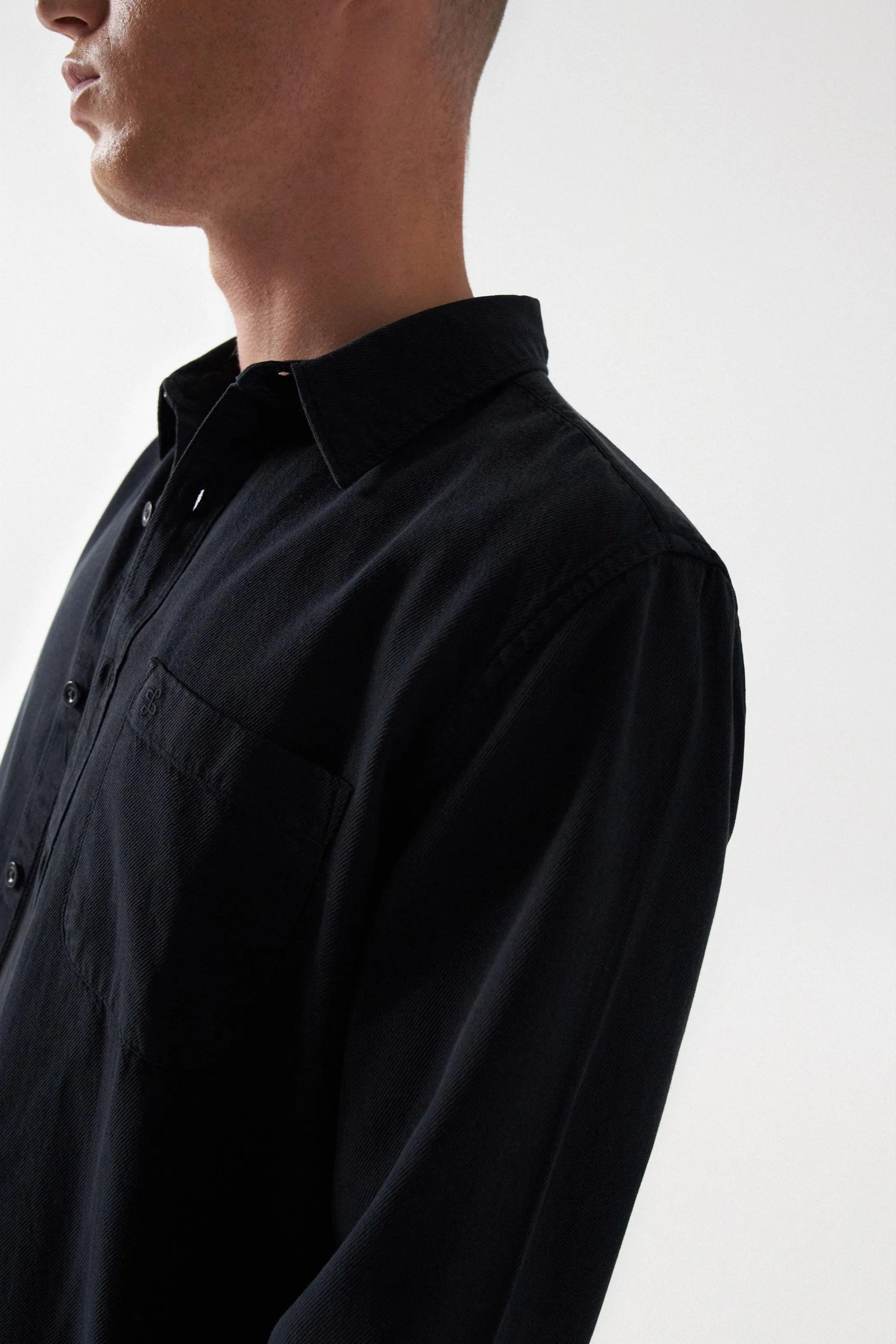 Textured shirt. Dark green. Regular cut. Collar with lapels. Long sleeve with buttons. Button closure. Pocket detail on the chest with branding.
