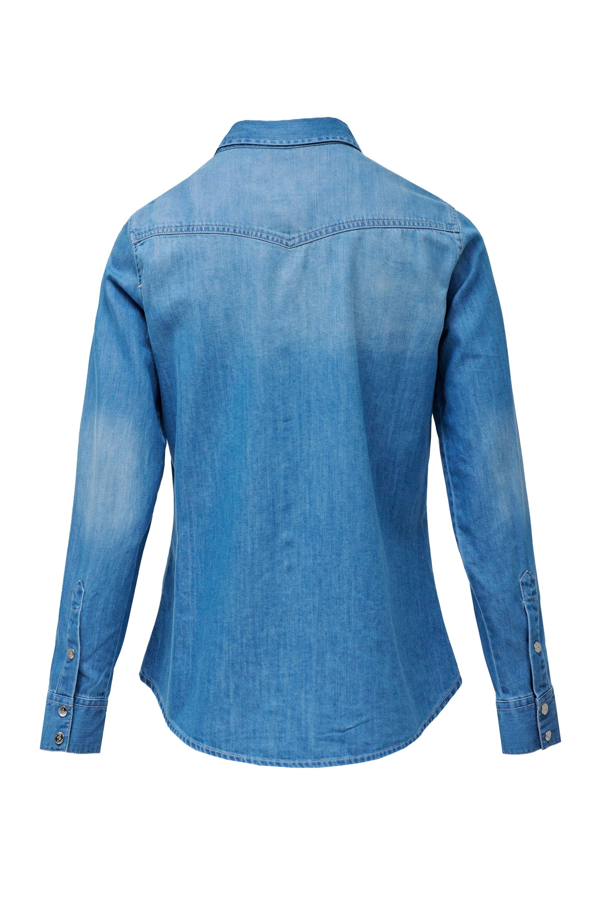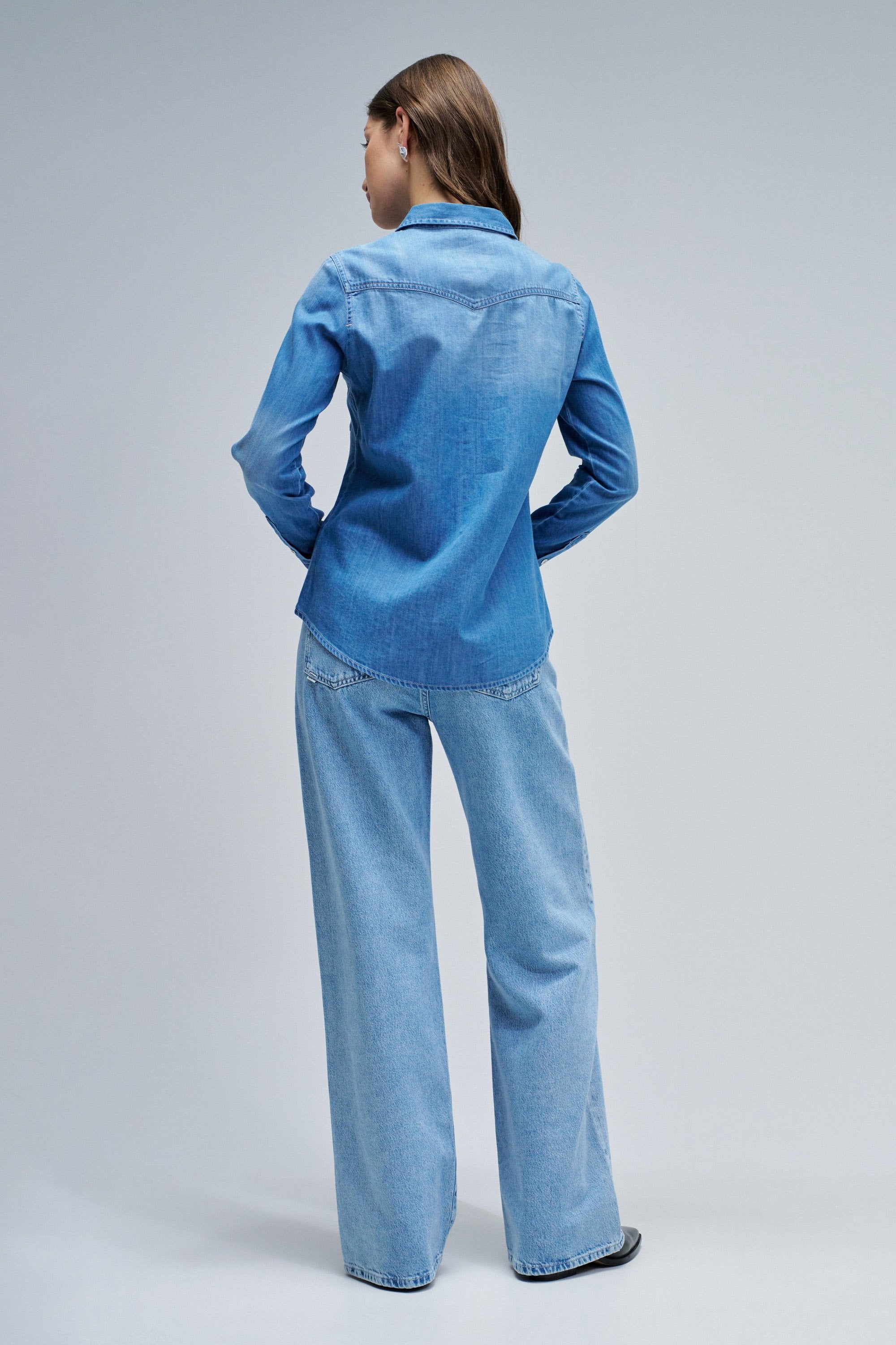 Blue light denim shirt with a regular fit that offers comfort and versatility. The design features a classic collar, a front opening with snap buttons, and two chest pockets, reinforcing its practical and casual character. The long sleeves with buttoned cuffs add a touch of structure, making it ideal for pairing with both relaxed and more dressed-up looks.