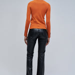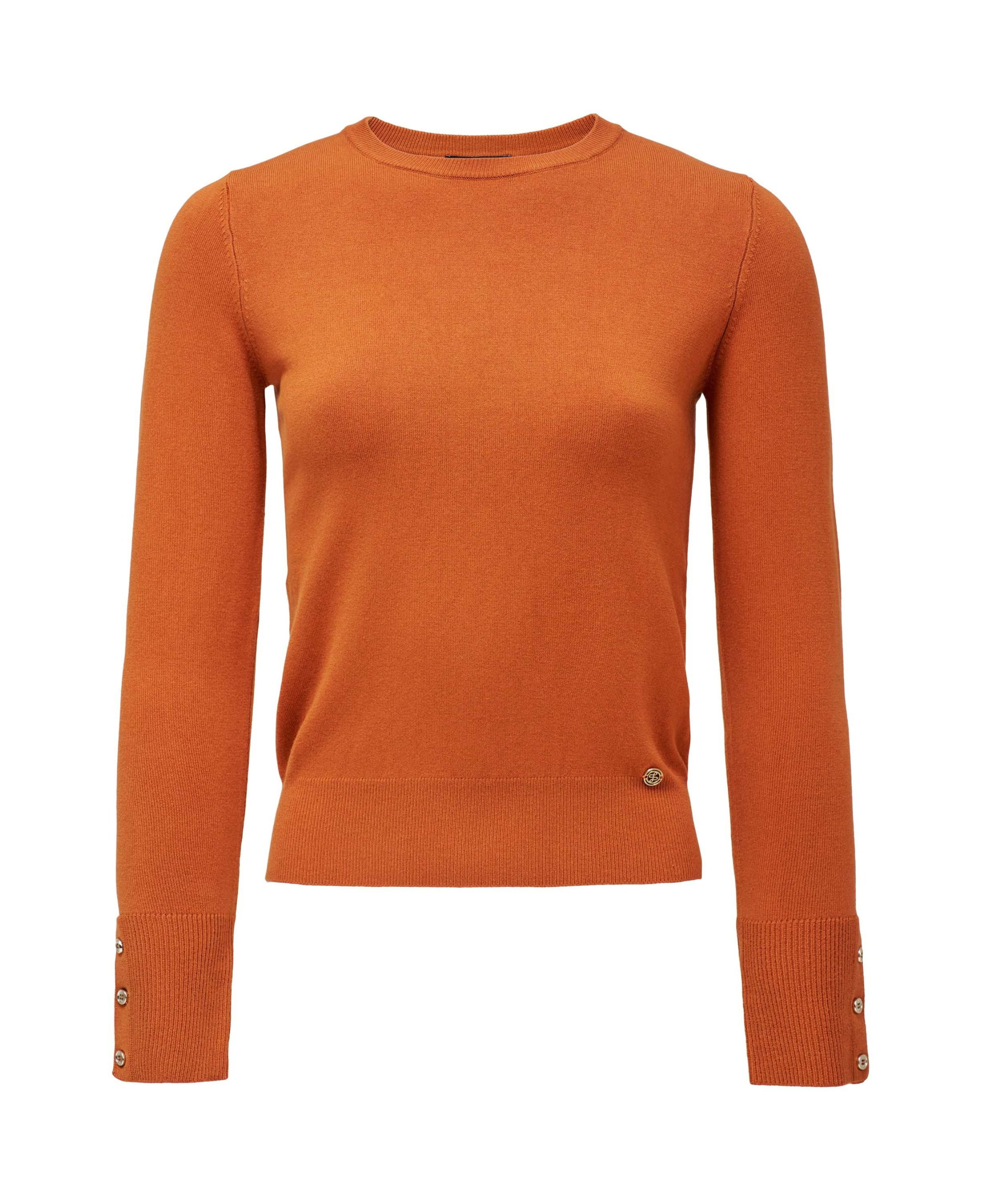 A versatile everyday piece, this basic knit sweater stands out with its vibrant orange color and slim fit that enhances the silhouette. The round neckline and ribbed cuffs and waistband add comfort and structure to the design. The gold buttons at the cuffs add a subtle touch of sophistication, making it perfect for both casual and more elegant combinations.