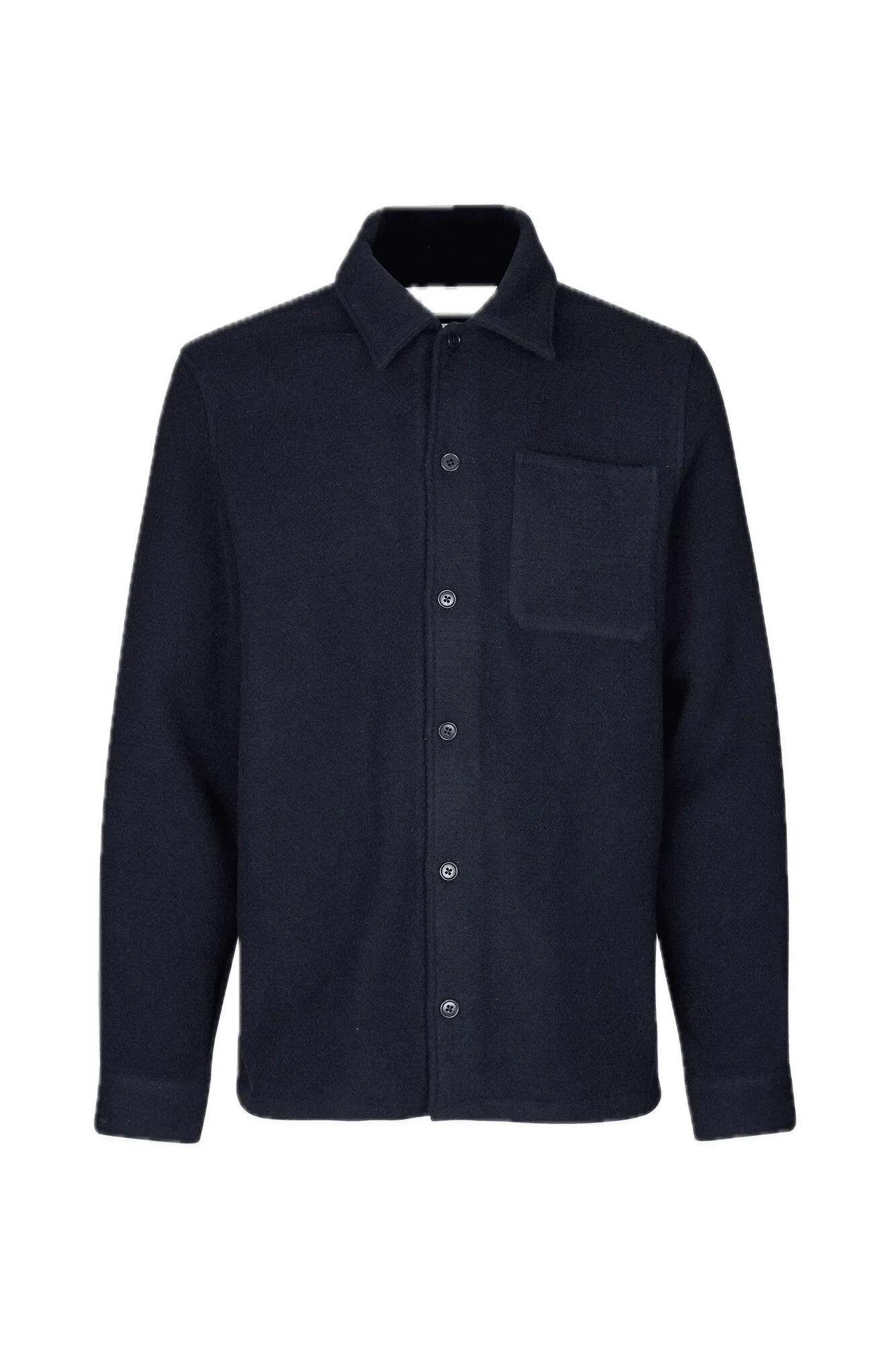 Regular fit overshirt with chest pocket. Pointed collar, seam on the neck yoke. Button closure at the center front and cuffs. Acrylic, polyester and wool blend fabric with graphic grid structure, woven in Italy.
