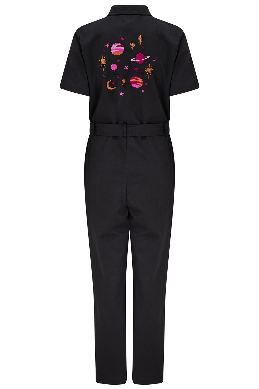 El exitoso mono Billy vuelve con un llamativo estampado bordado de planetas y estrellas. Este mono presenta un favorecedor corte entallado, una camisa de manga media y una cremallera frontal visible para un acabado de inspiración retro. El corte recto y ajustado, la cintura ajustable con cordón y los bolsillos aerodinámicos en el pecho y los laterales combinan comodidad y estructura.