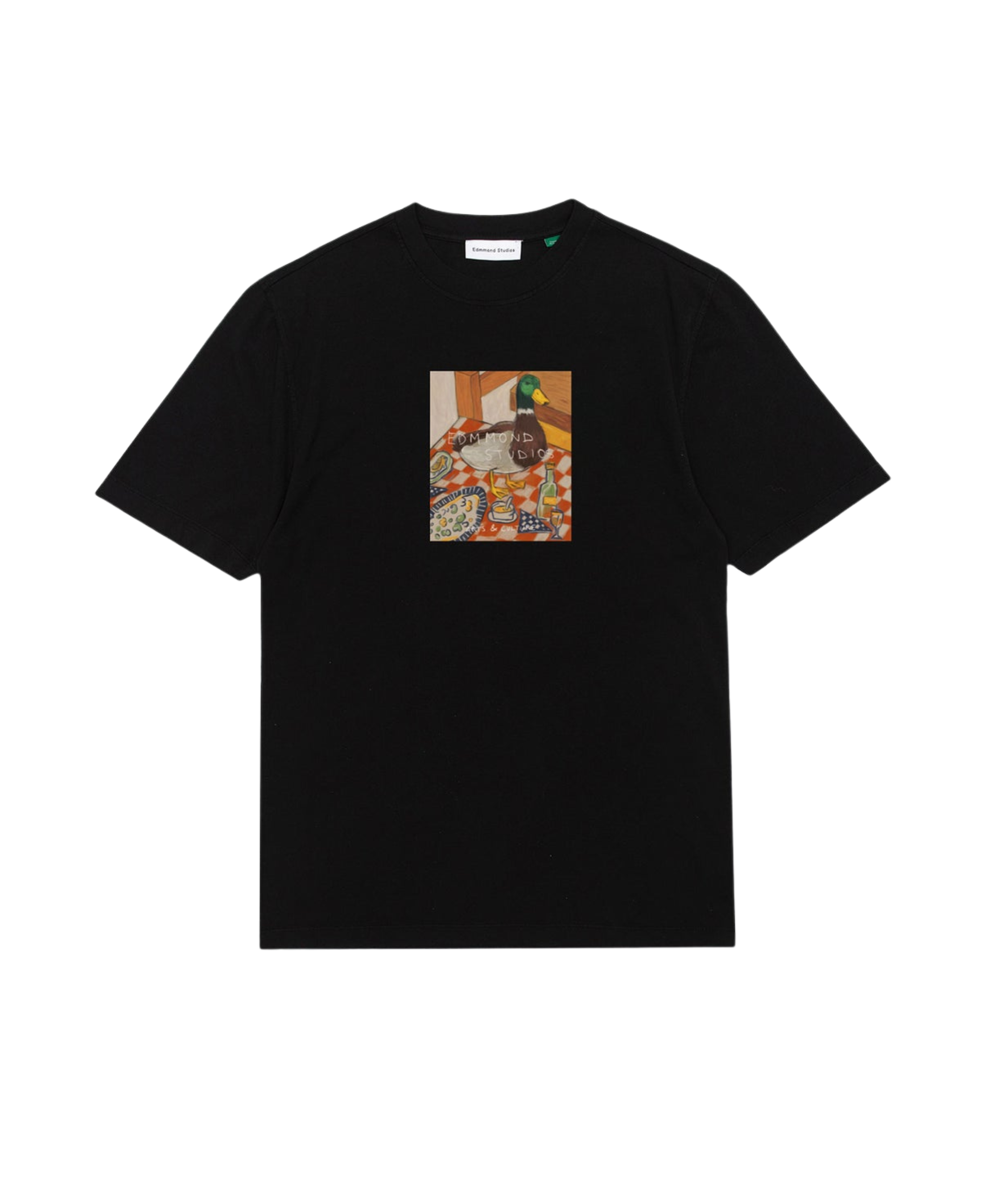 Camiseta negra de manga corta, fabricada con algodón 100% orgánico. Diseñada con un corte relajado y una longitud perfecta. Con un diseño especial del pato característico en la parte delantera y el logotipo "Edmmond Studios". Fabricada en Portugal.