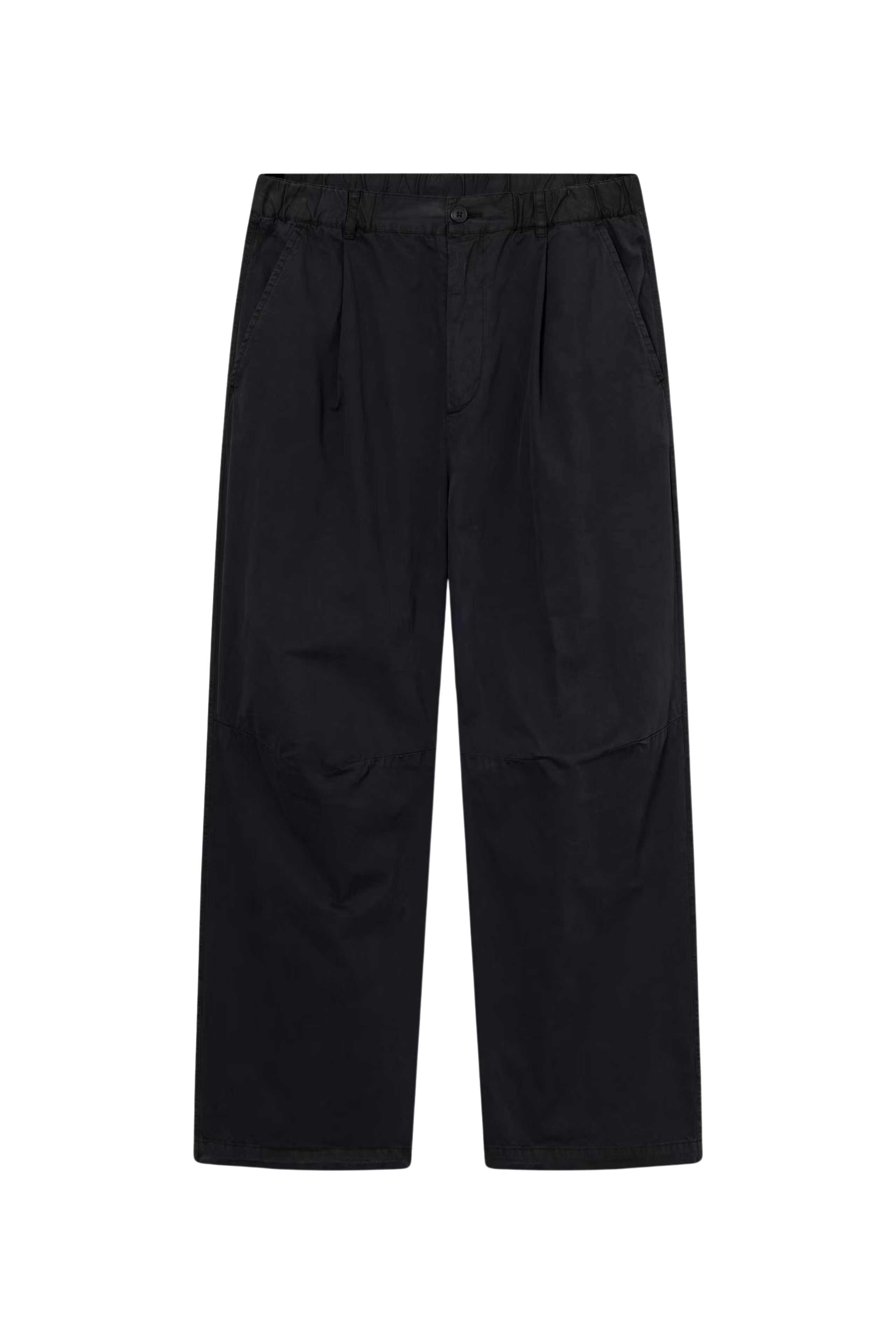 Los pantalones de pierna ancha ofrecen una silueta moderna con pliegues frontales y costuras visibles en las rodillas. Cuentan con bolsillos laterales en ángulo, trabillas para el cinturón y un acabado suave para mayor comodidad.