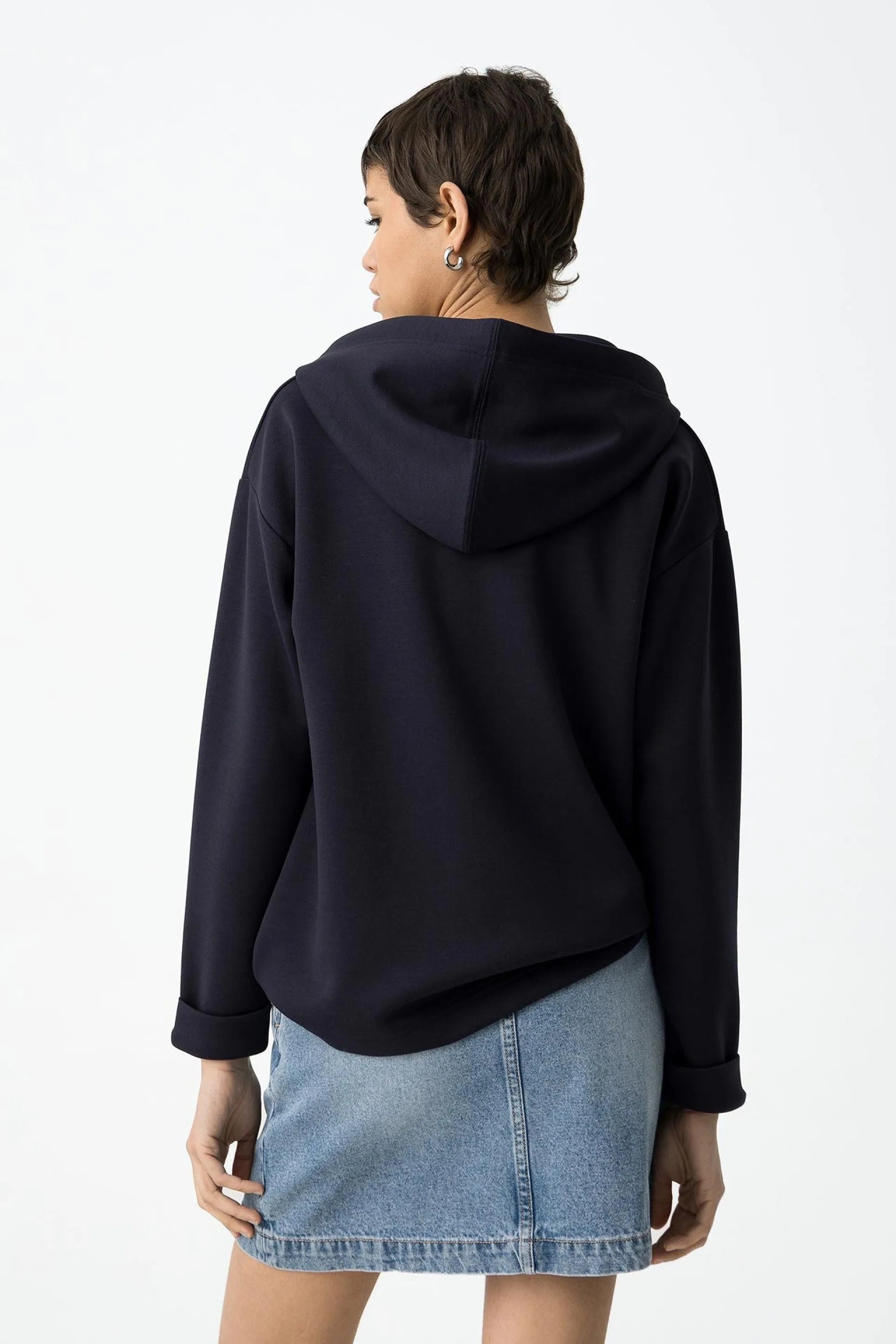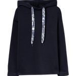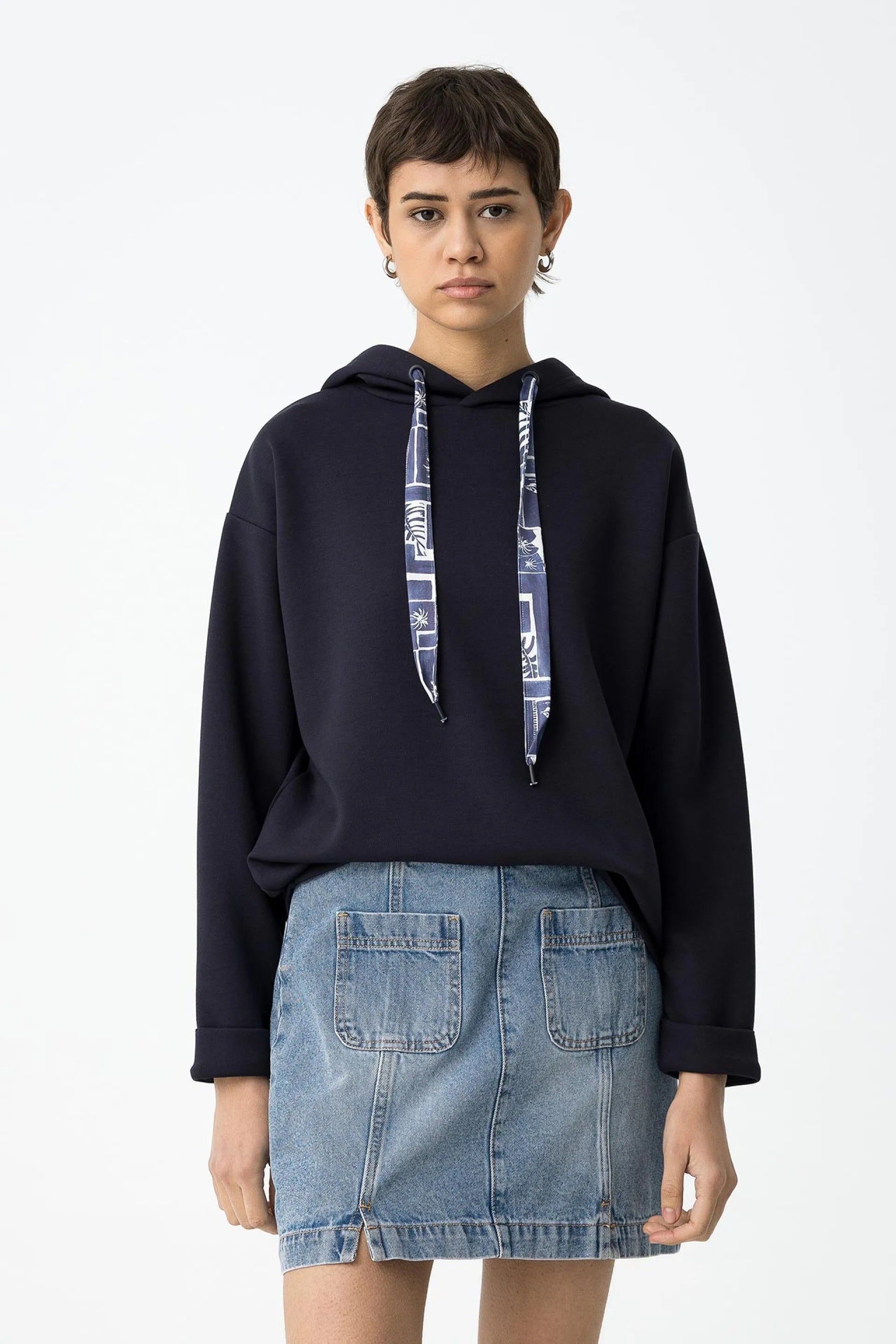 Fine knit hooded sweatshirt, relaxed fit, with satin drawstring, long sleeves and turn-up cuffs.