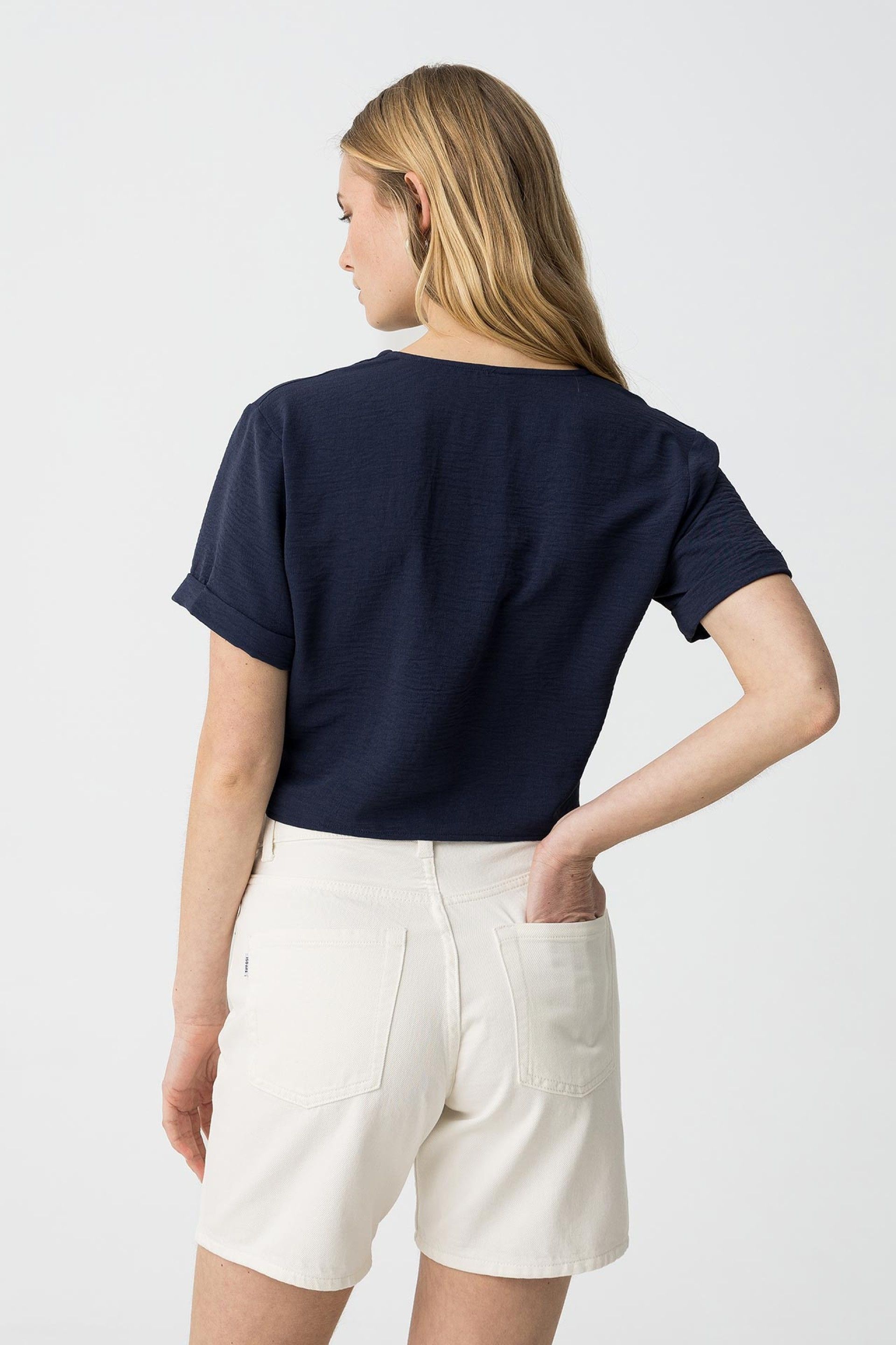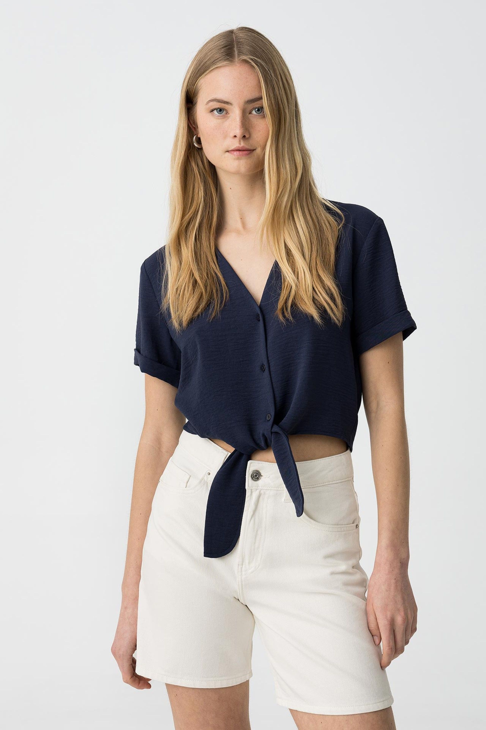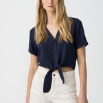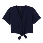 Short blouse with a V-neckline and short sleeves. Button and bow closure at the front.