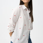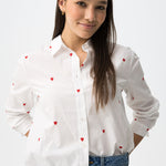 Camisa blanca de manga larga con estampado de pequeños corazones rojos, corte regular y clásico.