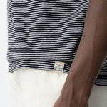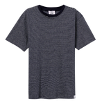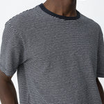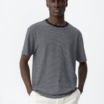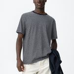 El tejido presenta una superficie ligera y una textura visual sutil, reforzada por el dibujo de rayas finas. Esa mezcla hace que la camiseta tenga más profundidad que una base completamente lisa, sin dejar de sentirse sencilla.