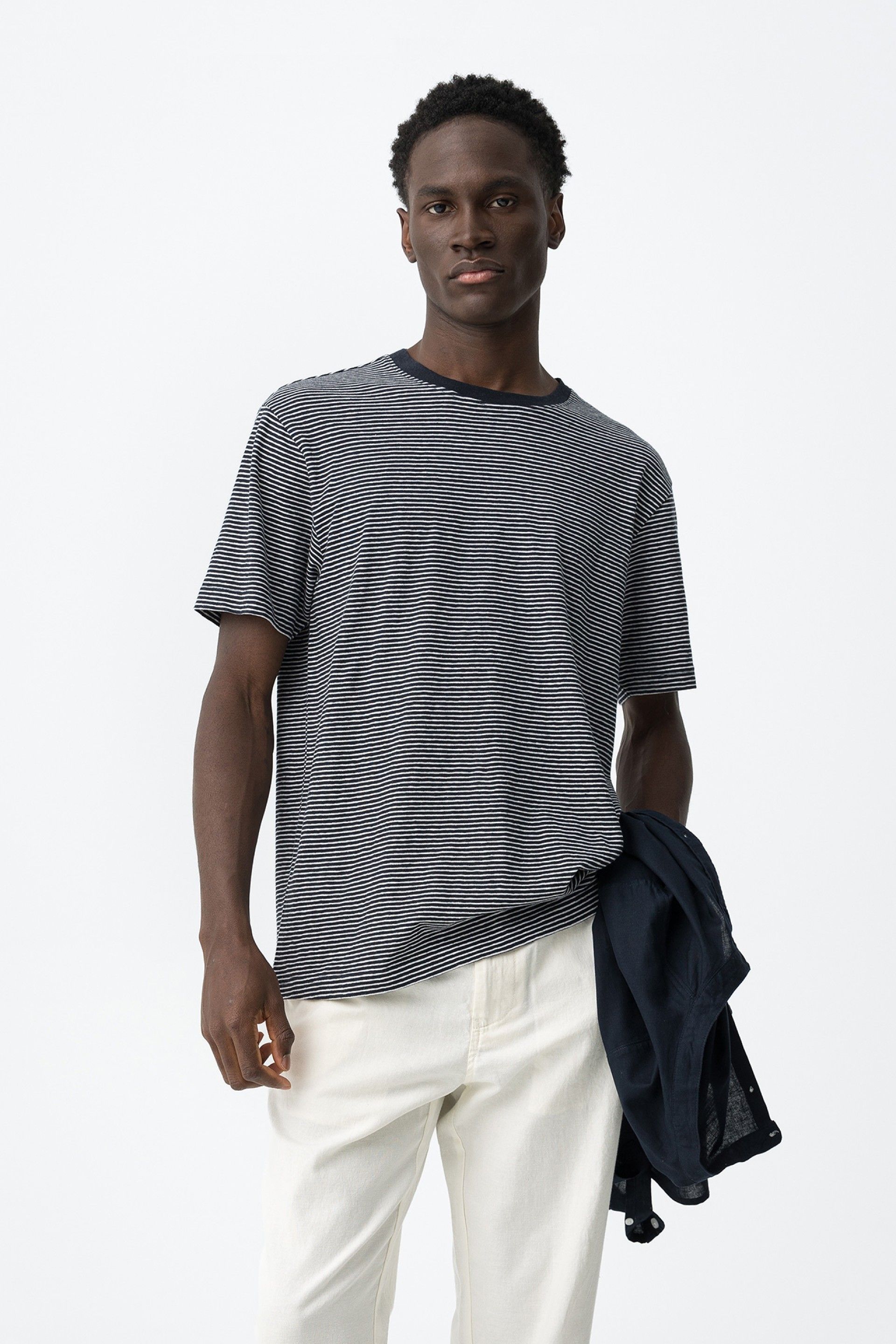 Las rayas finas aportan ritmo visual sin dominar en exceso el conjunto. Ese detalle hace que la camiseta gane interés y se sitúe un paso por encima de una básica unicolor dentro de un look casual.