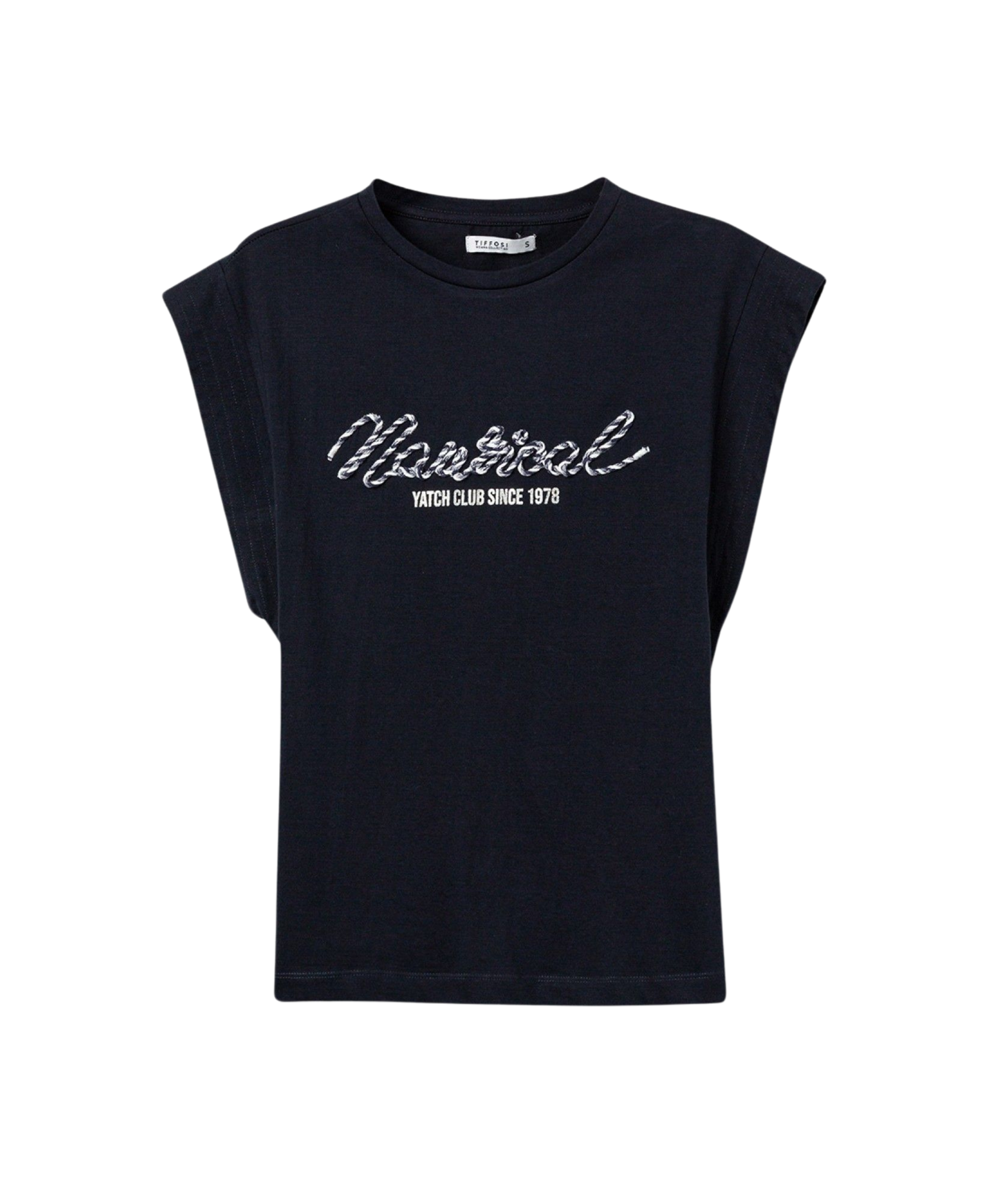 Sleeveless round-neck T-shirt. Front print and appliqués. 100% cotton.