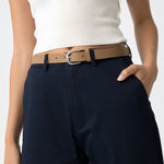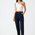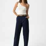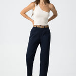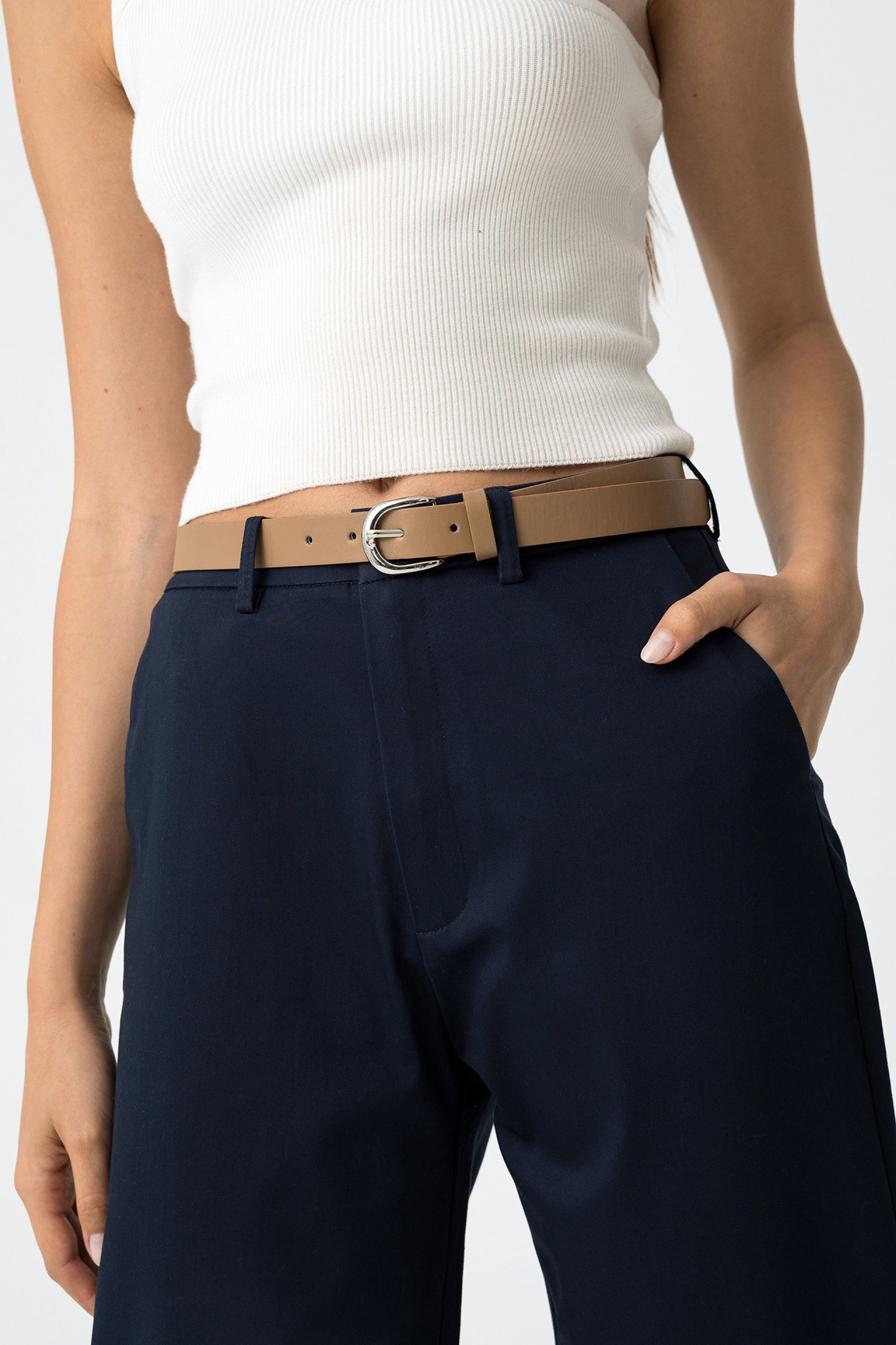 Mid-rise trousers with a faux leather belt. Front zip and metal hook closure. Side pockets. 65% CO 33% PES 2% EL