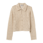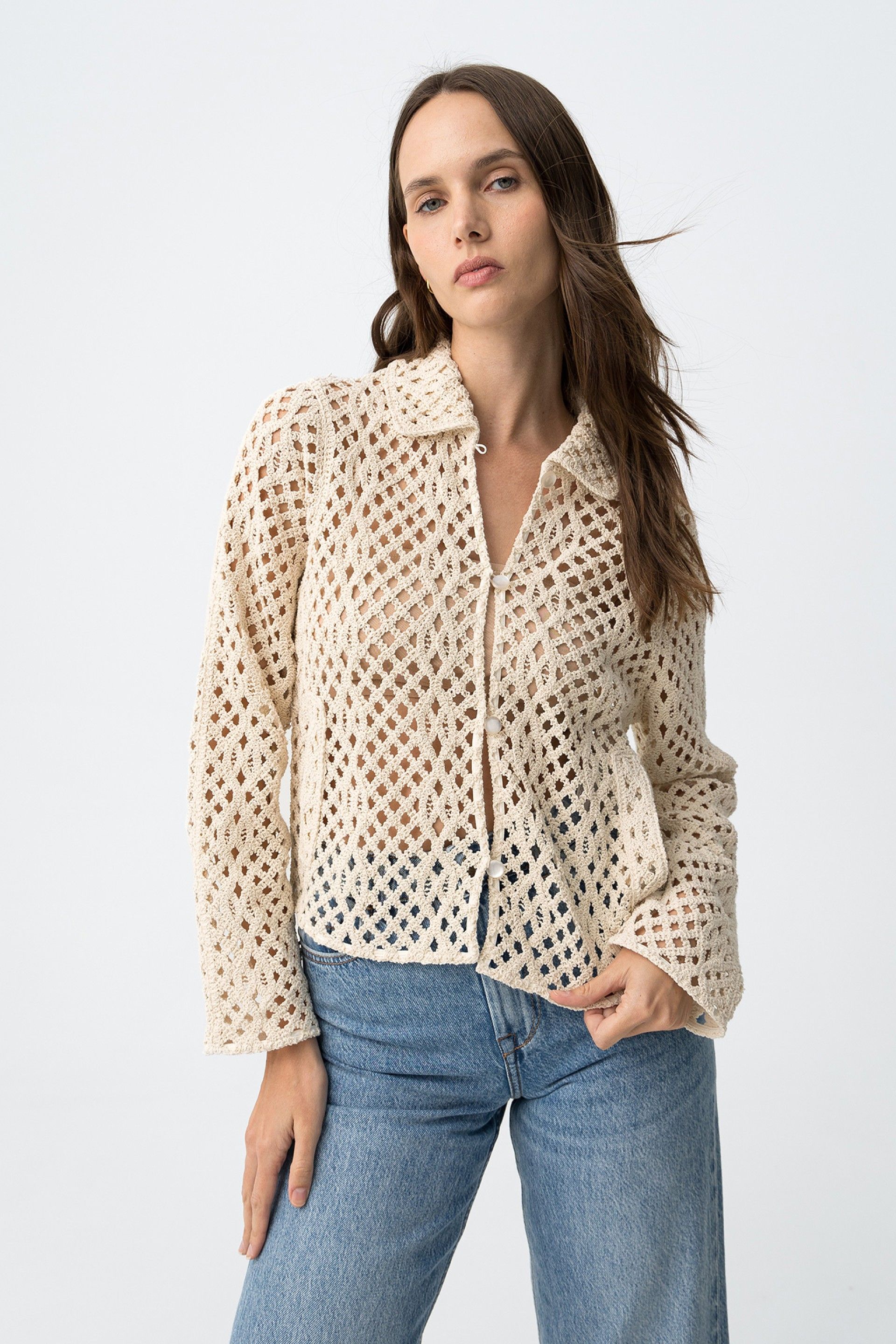El diseño de la Eliza se apoya en una construcción corta y recta, con cuello camisero y cierre frontal de botones. La base es sencilla, pero queda transformada por el trabajo calado del tejido.