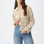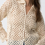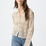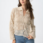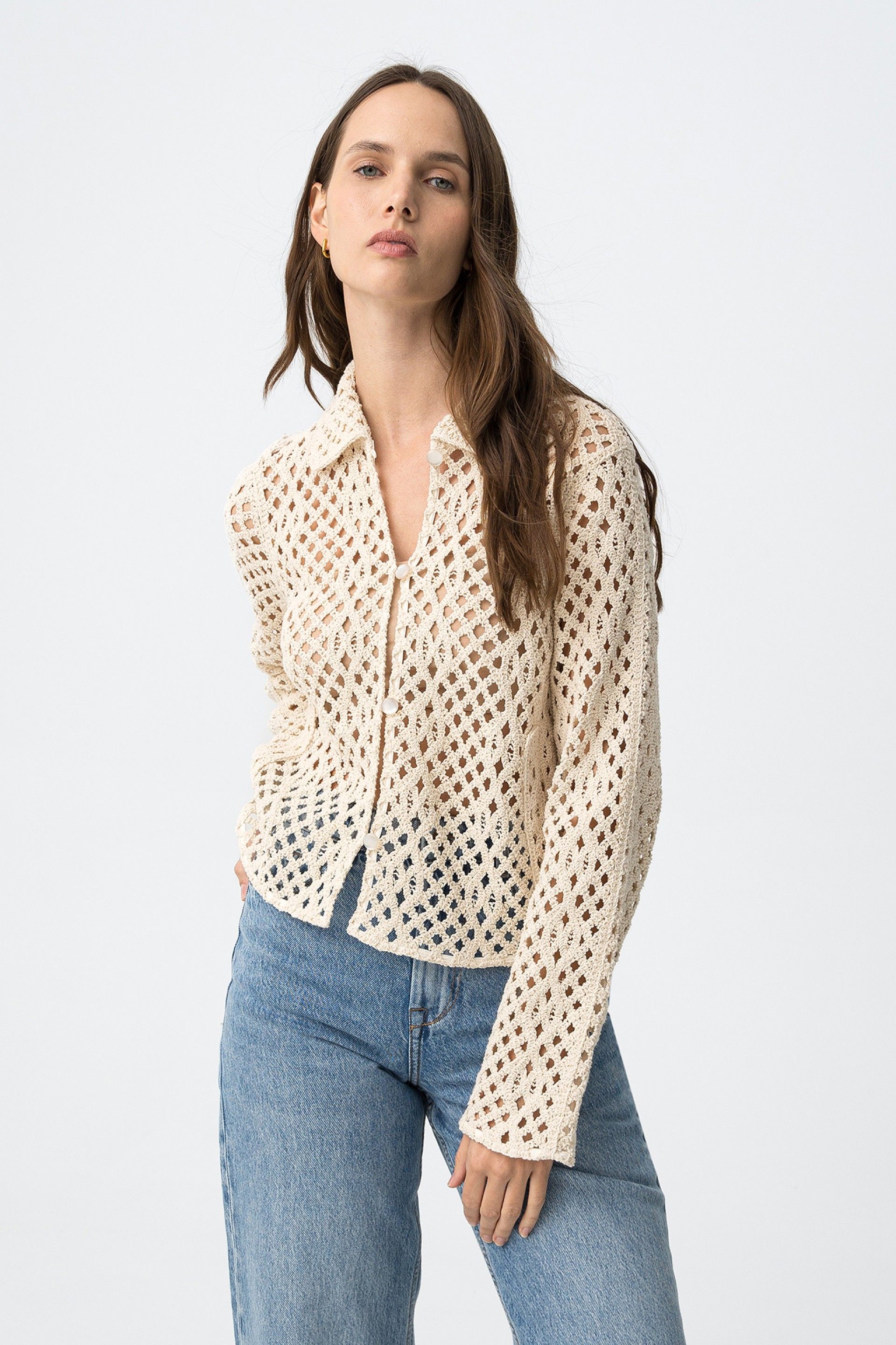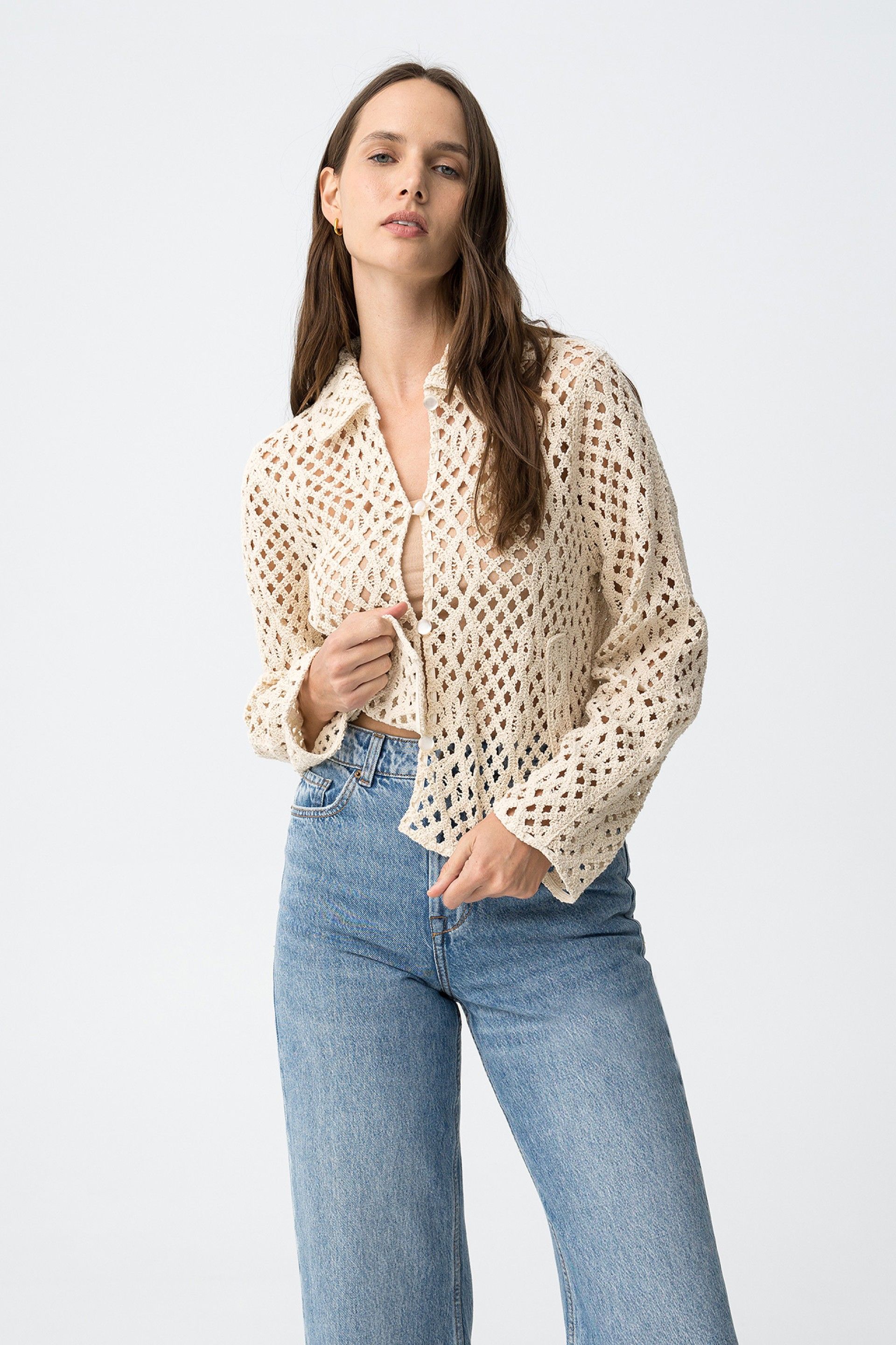 Es una sobrecamisa de mujer de manga larga, pensada como capa ligera con un tejido calado protagonista.