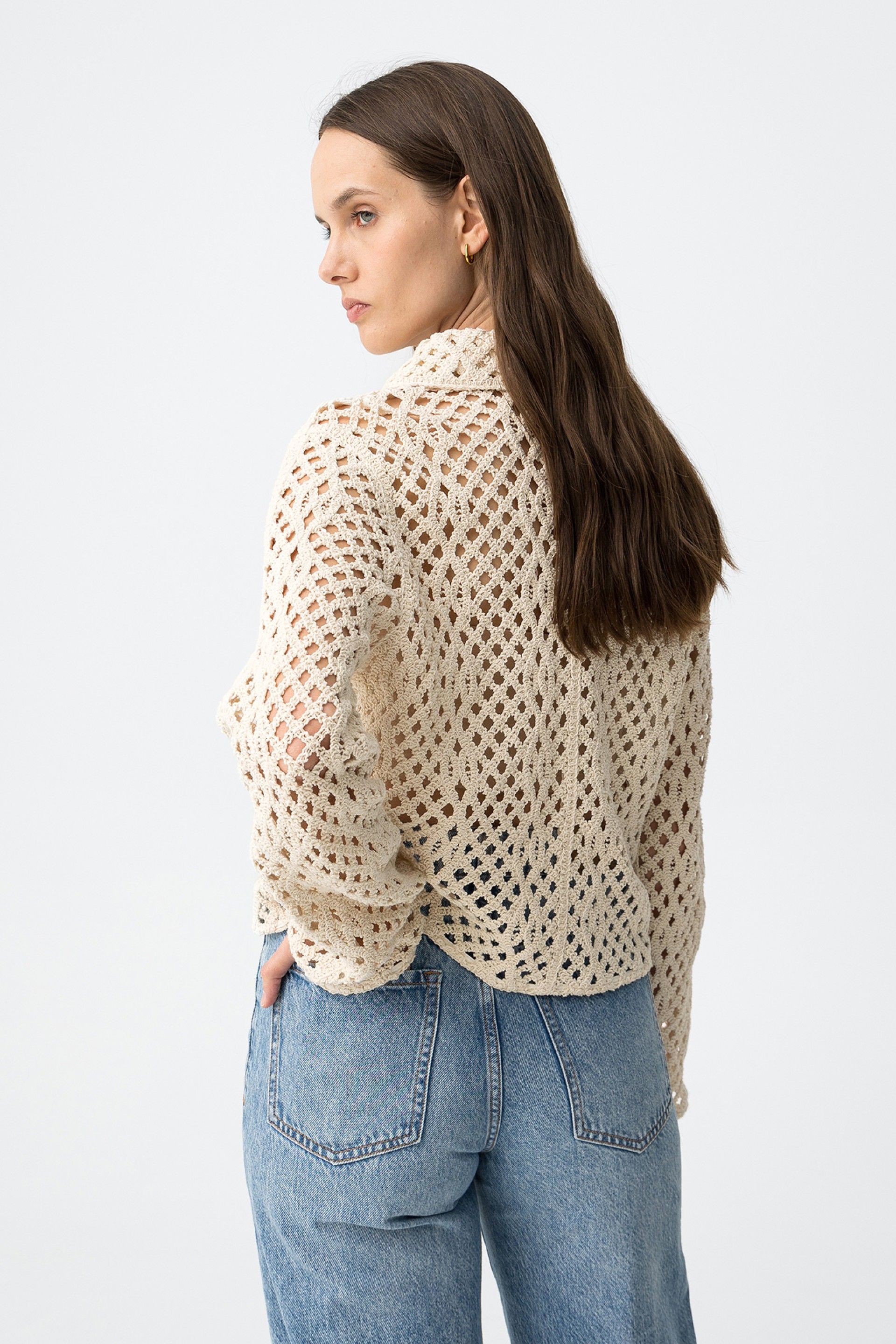 Las mangas largas y el cuerpo contenido equilibran el protagonismo visual del tejido calado. Esa construcción ayuda a que la prenda resulte fácil de combinar sin que el look se vea recargado.