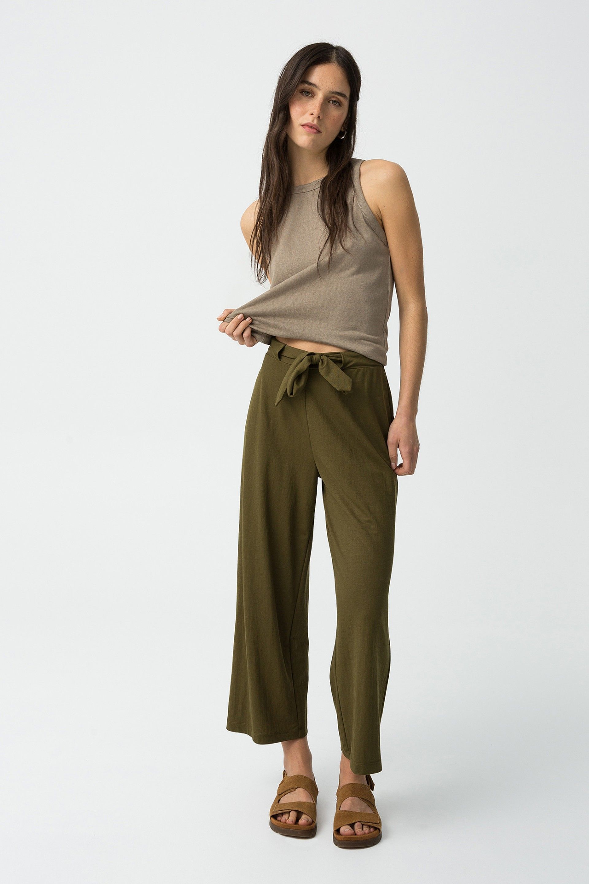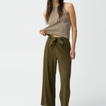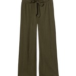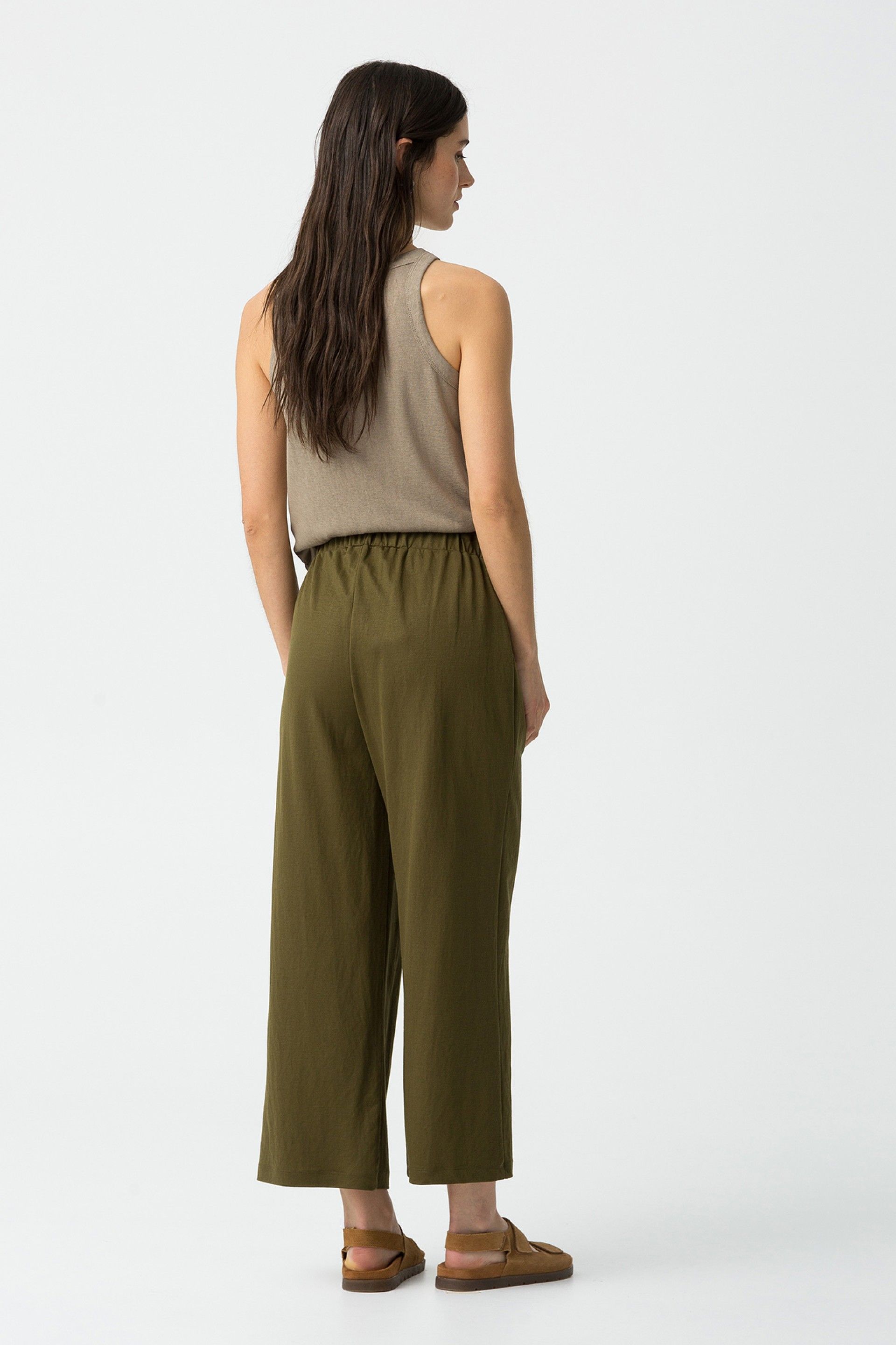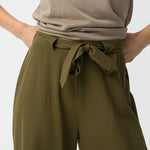 Mid-waist crinkle-effect trousers with elastic waistband and bow.