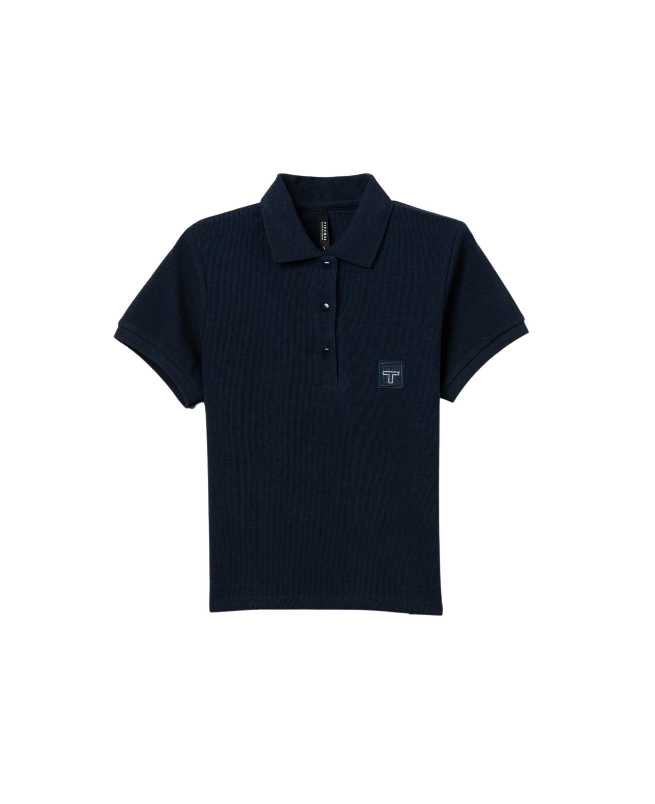 100% cotton polo shirt with a lapel collar, short sleeves, and small side vents. Blue buttons on the front. Ribbed sleeves. Logo detail on the front.
