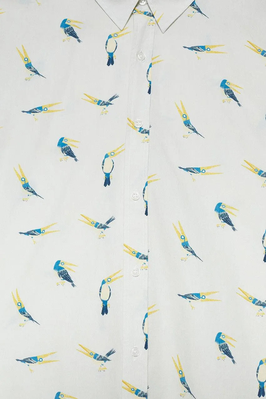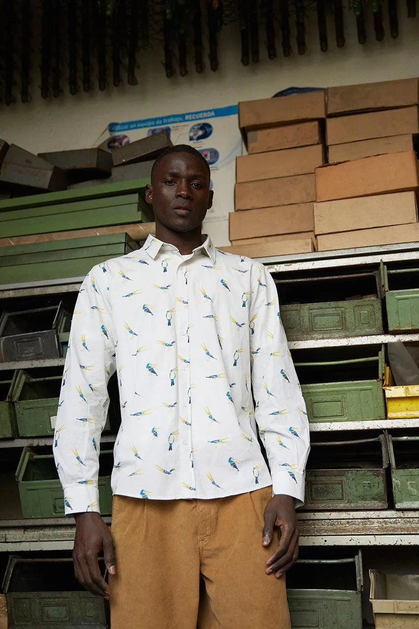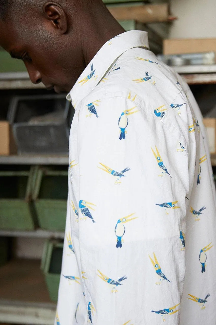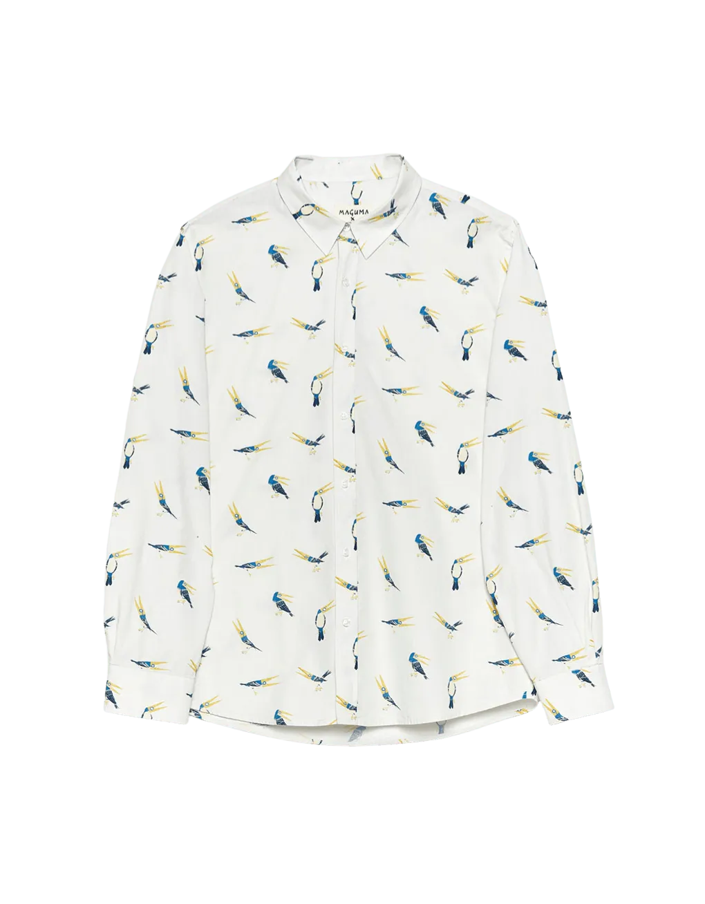 Magu-Pin by Maguma long-sleeved shirt, organic cotton and white, with a soft print of a pincer finch bird all-over-print designed exclusively for the special edition of the Spanish artist.