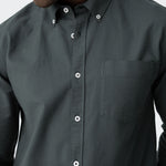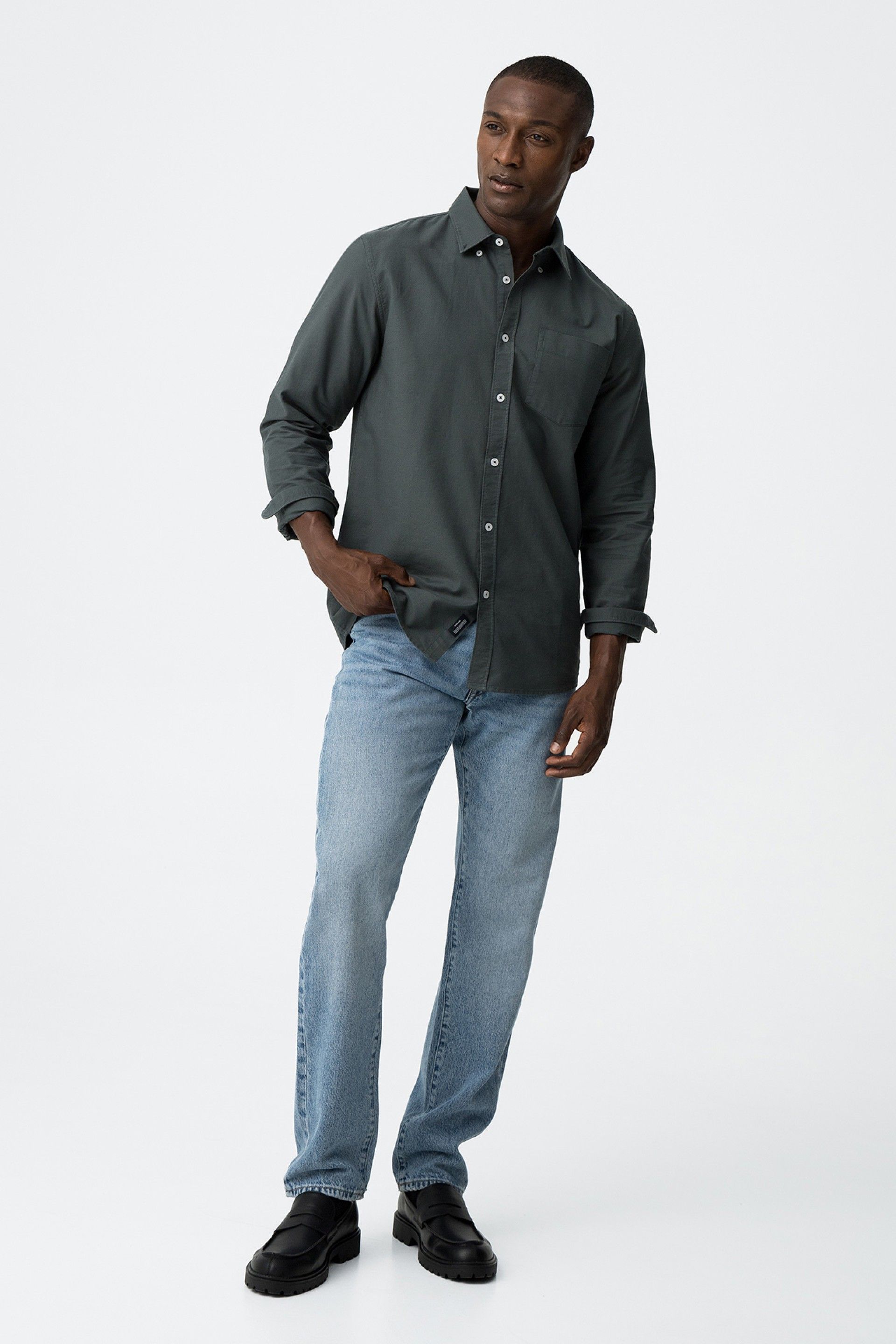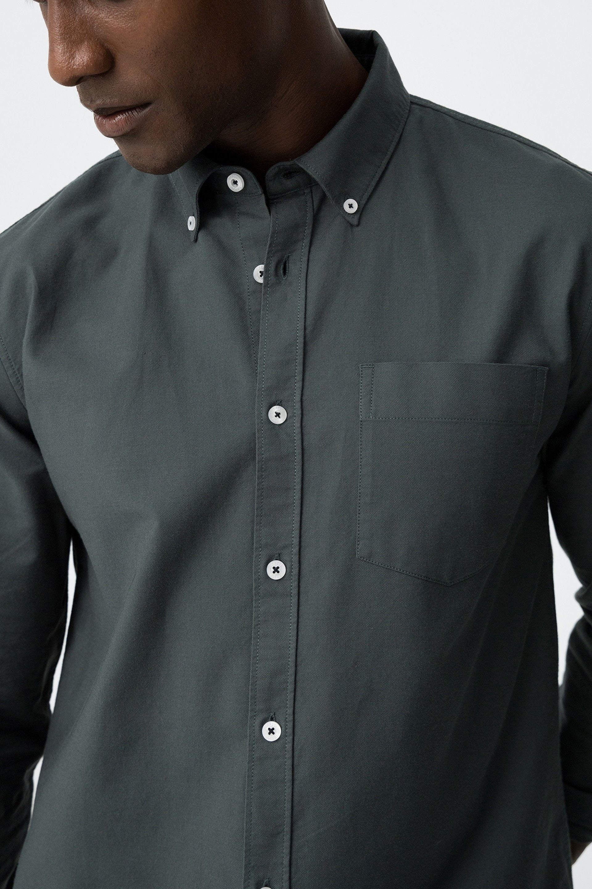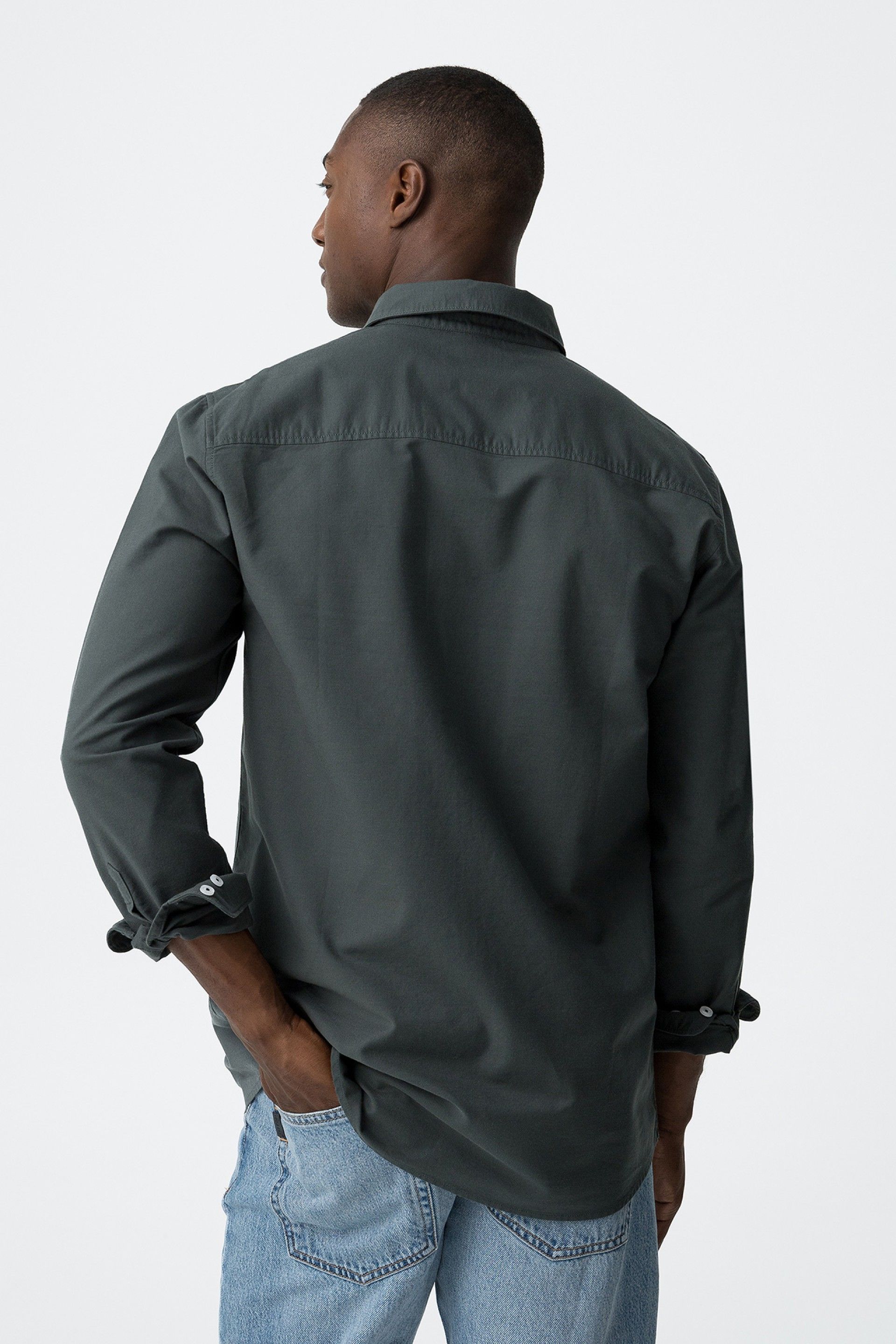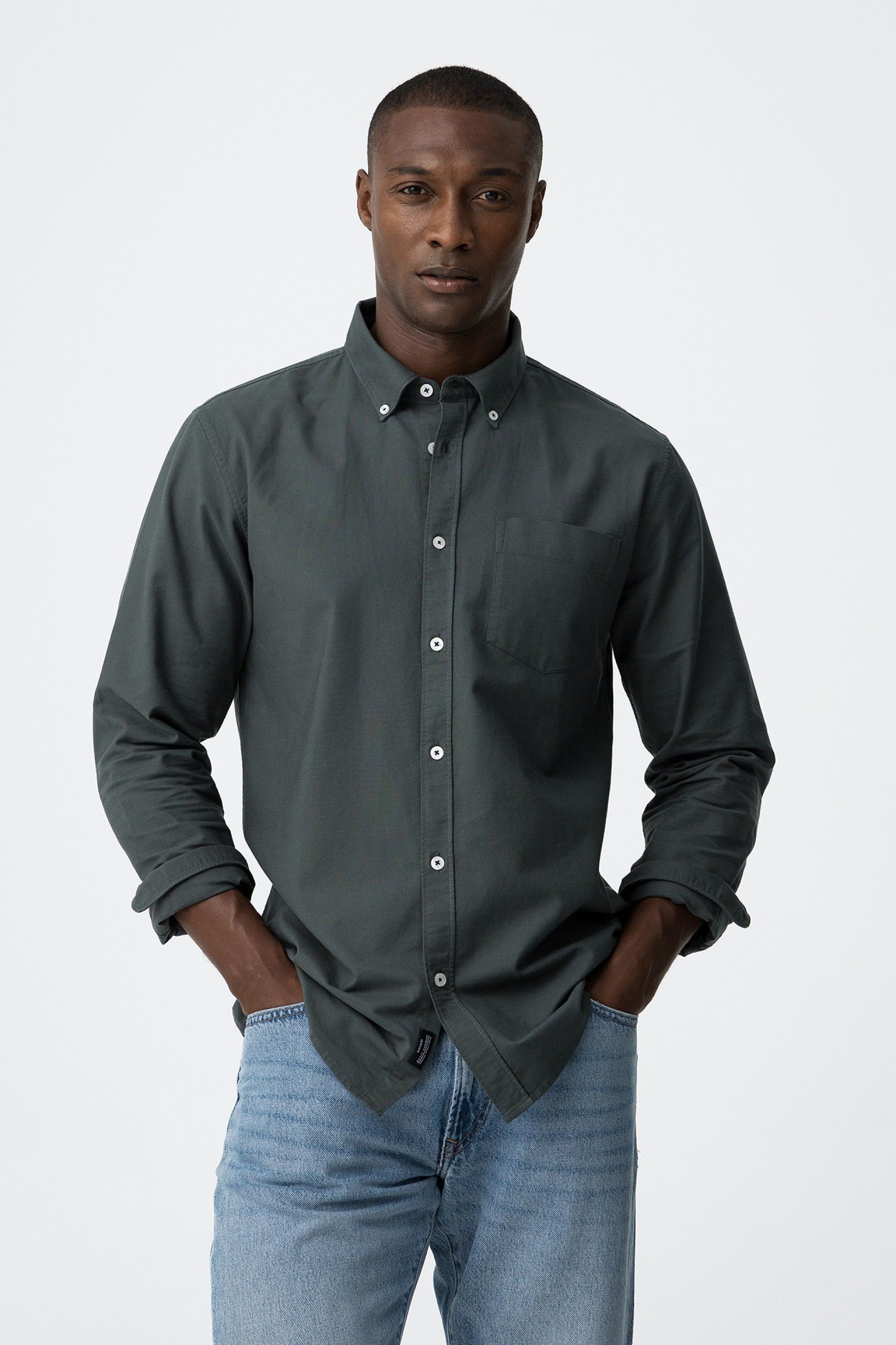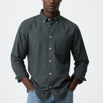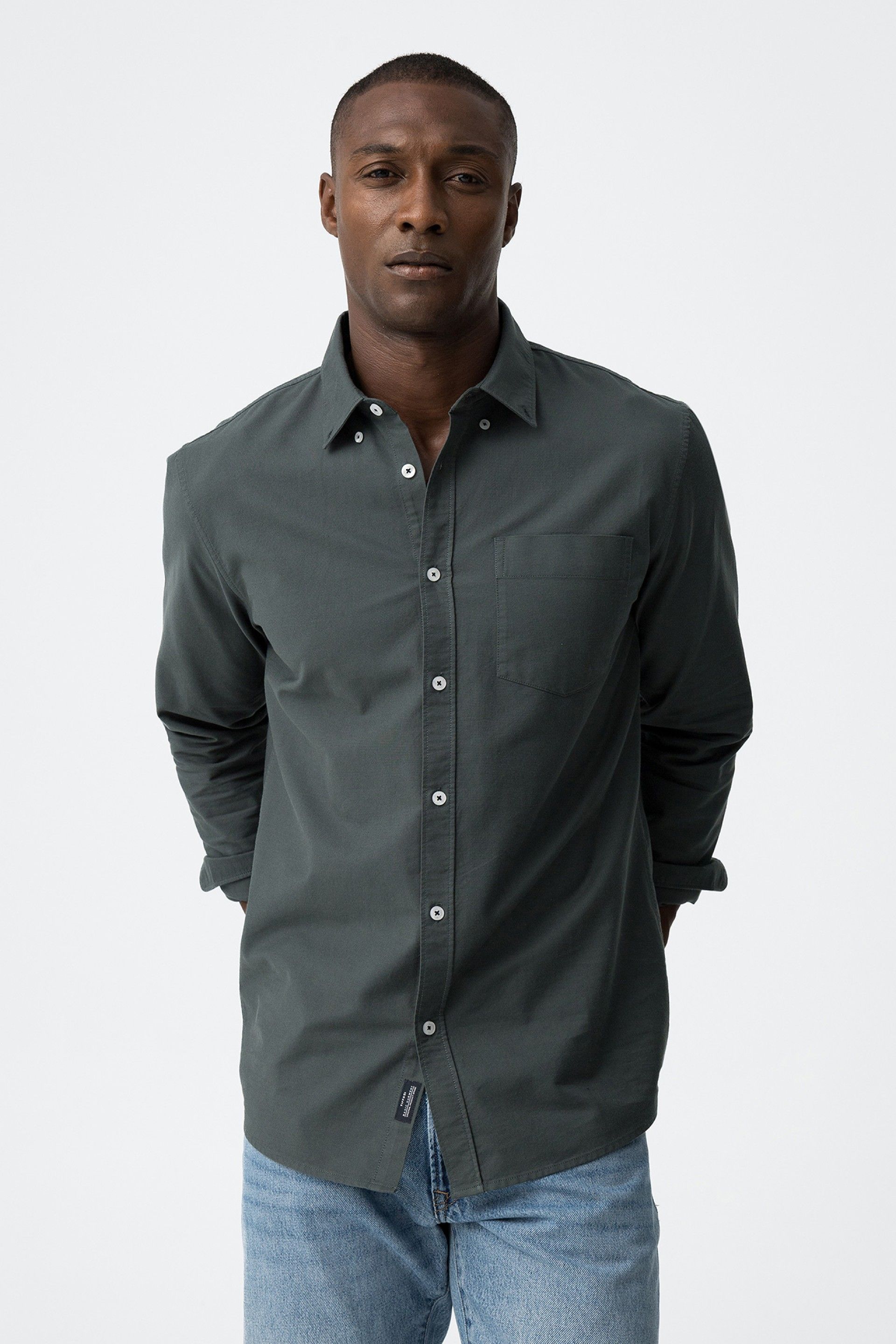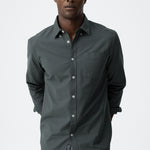 Button-down lapel collar shirt with long sleeves. Front button closure. Front pocket.