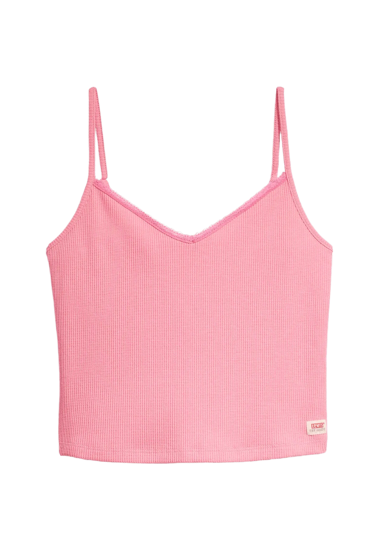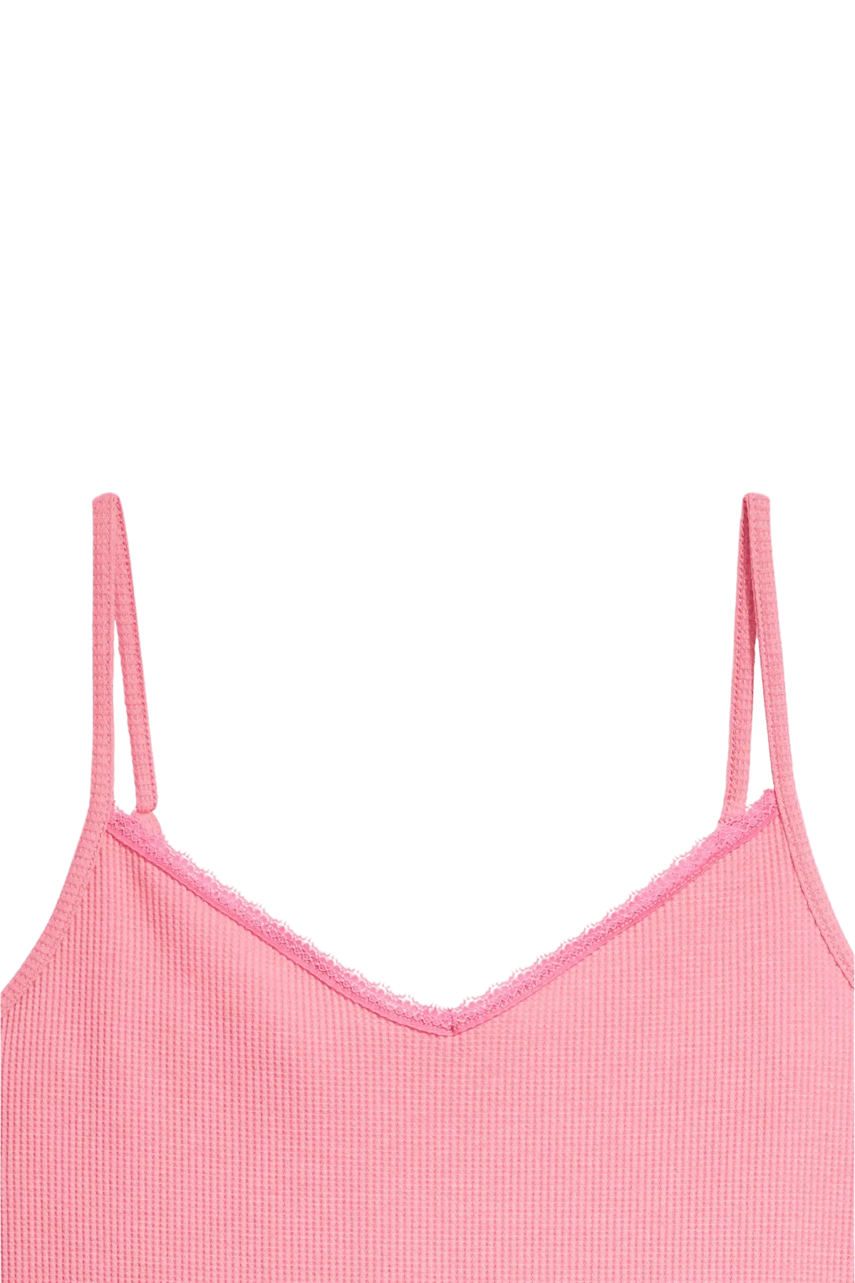 Straight from the '90s, this Waffle tank top is designed with a V-neck and lace bow trim, spaghetti straps, a slim, cropped fit, and soft waffle knit fabric.