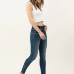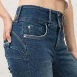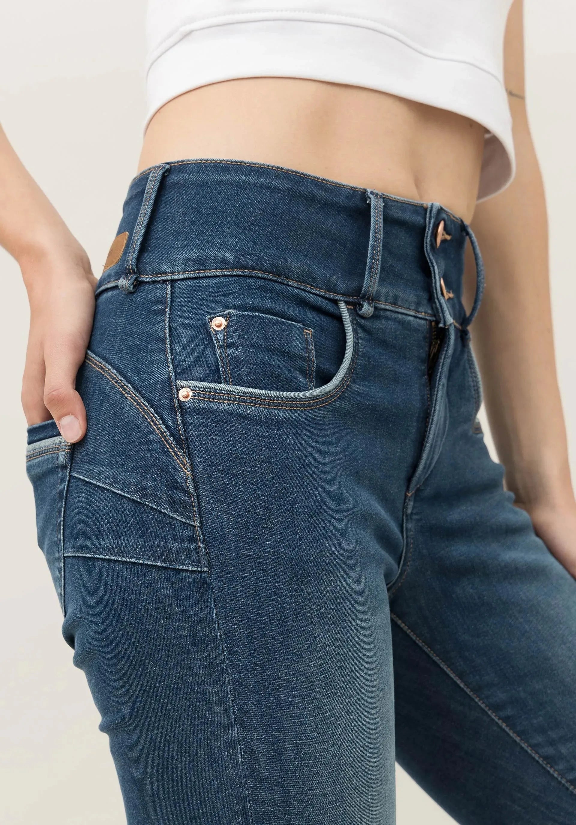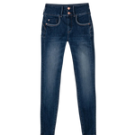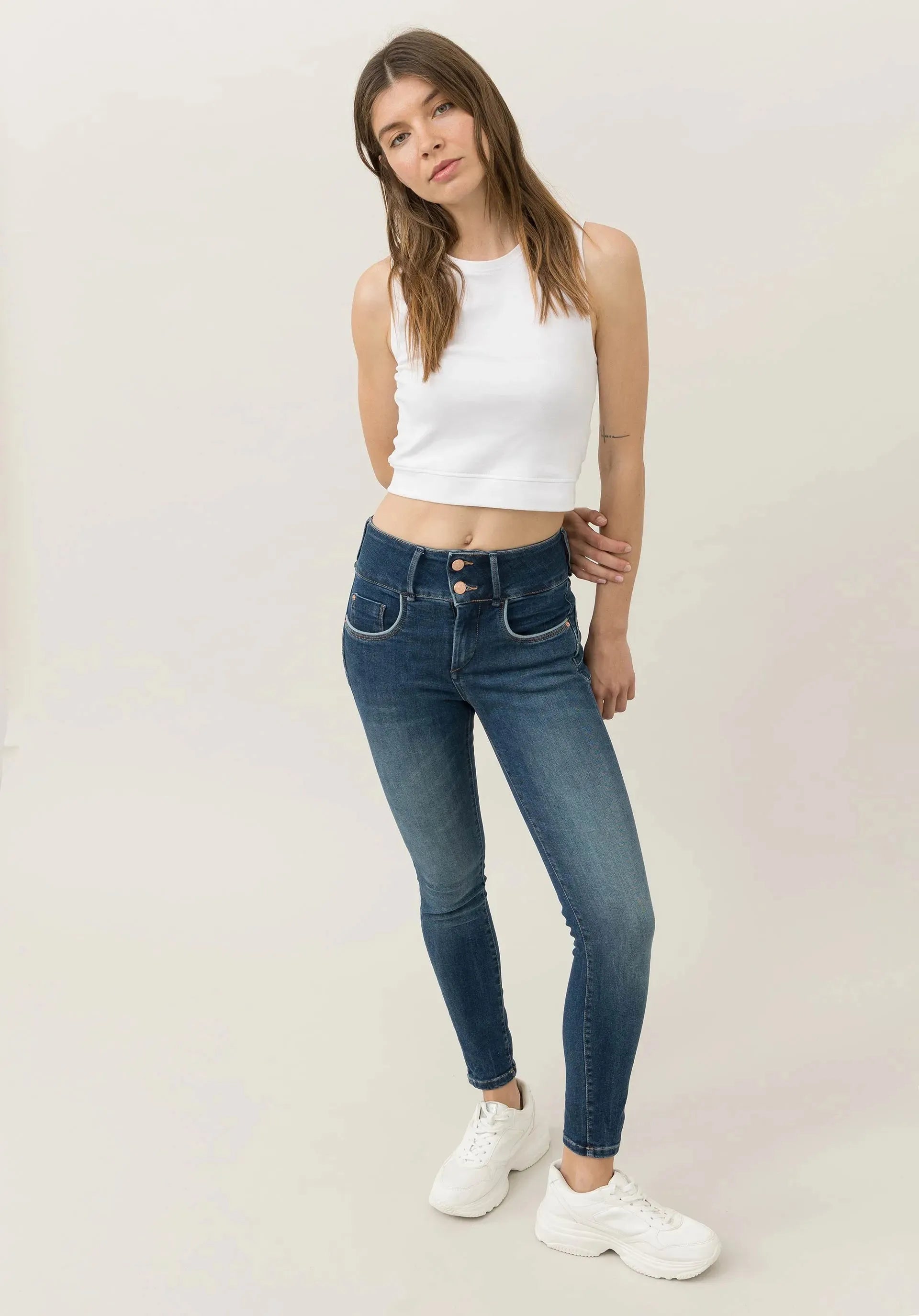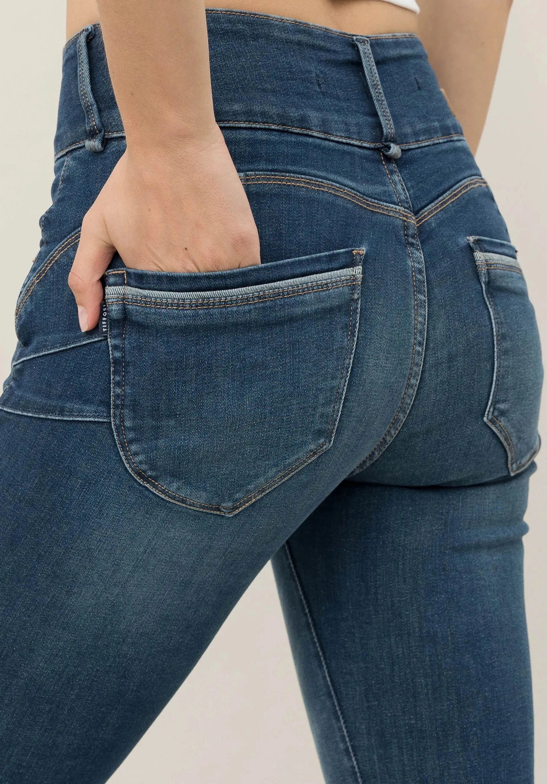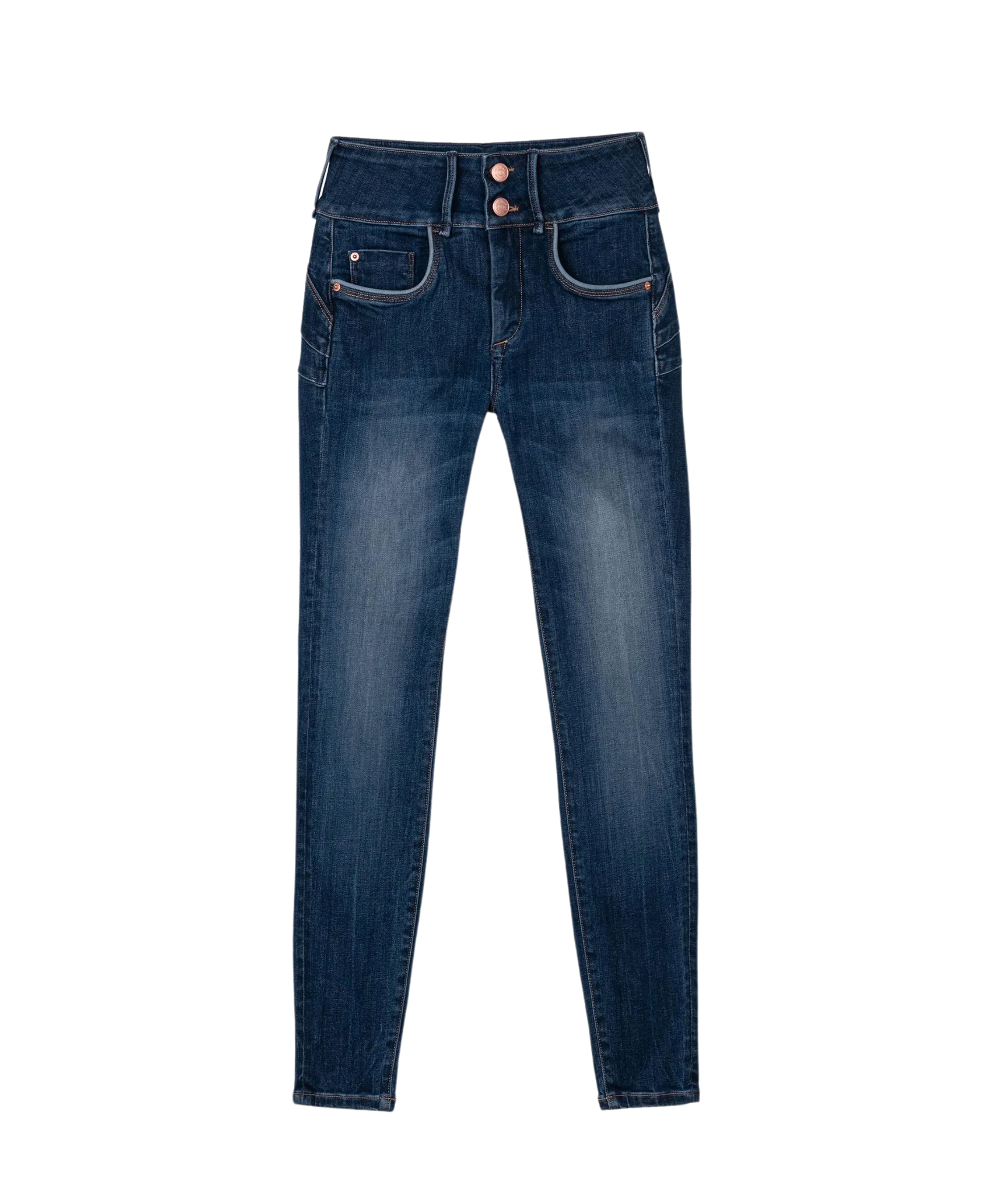 High-waisted skinny jeans with five pockets. Front zip closure with metal buttons.