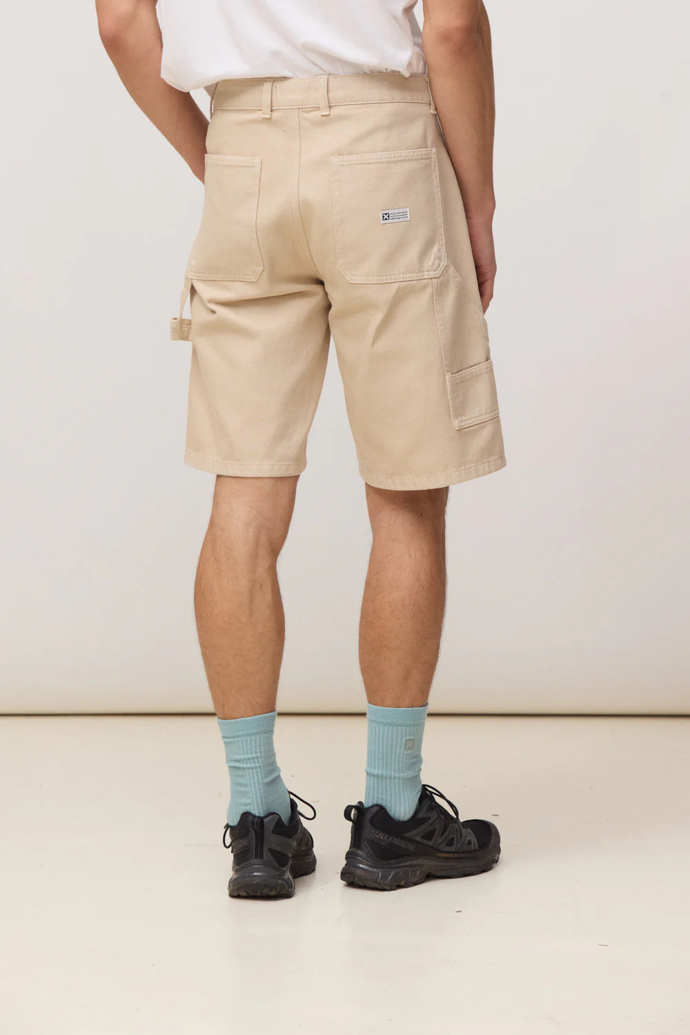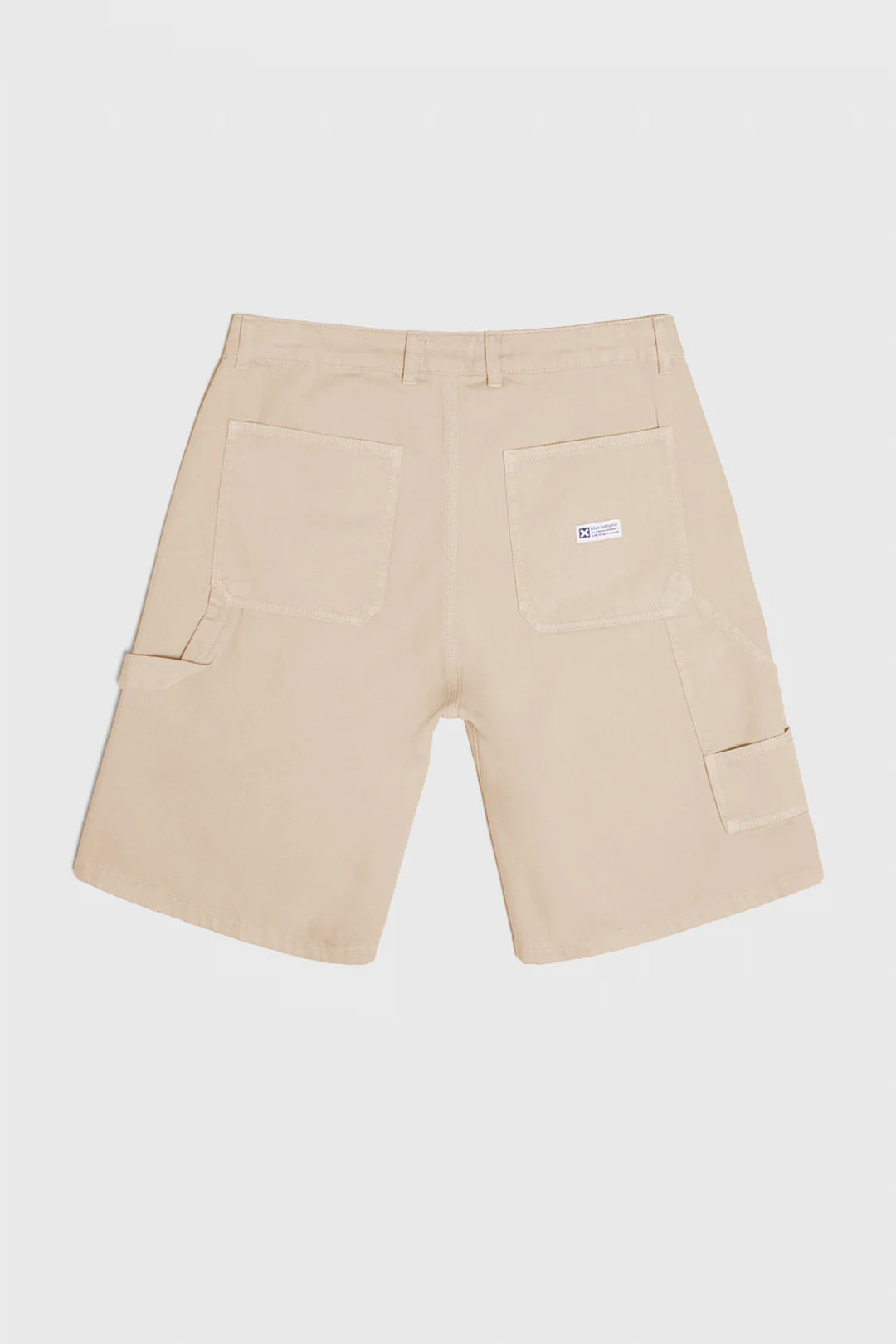 También incorpora bolsillo carpenter y bolsillos traseros con etiqueta decorativa. Son detalles que empujan la bermuda hacia una estética de inspiración workwear ligera, sin perder limpieza ni facilidad de combinación.