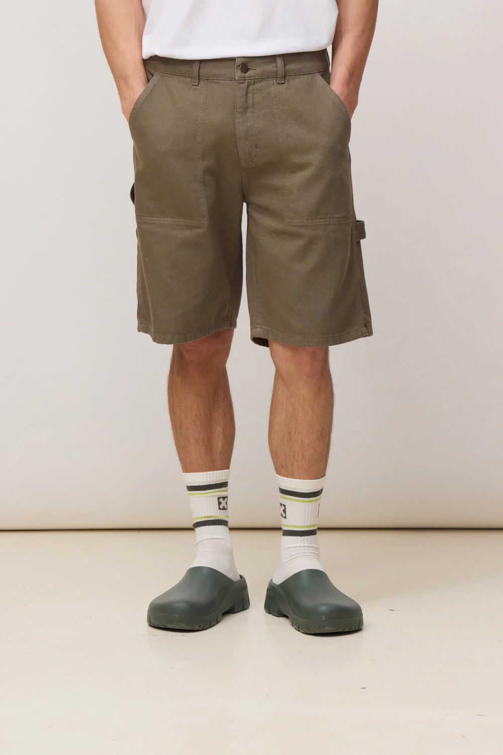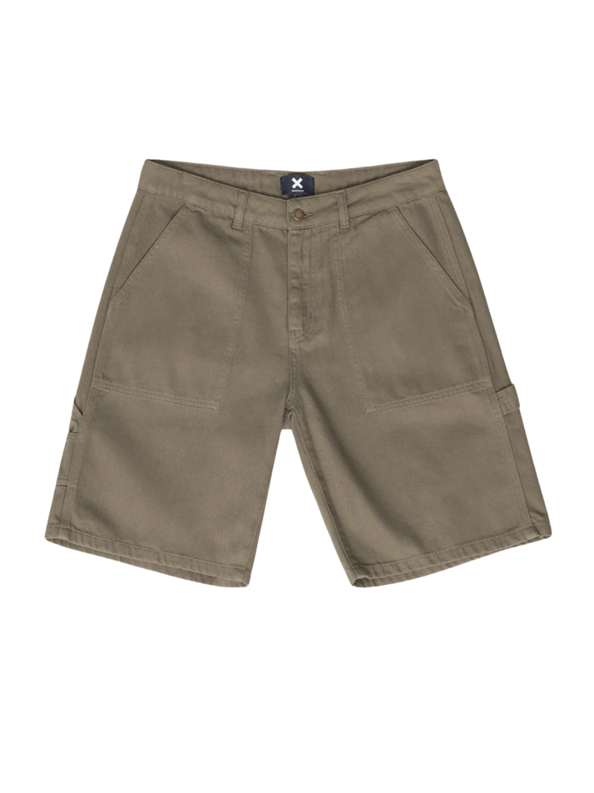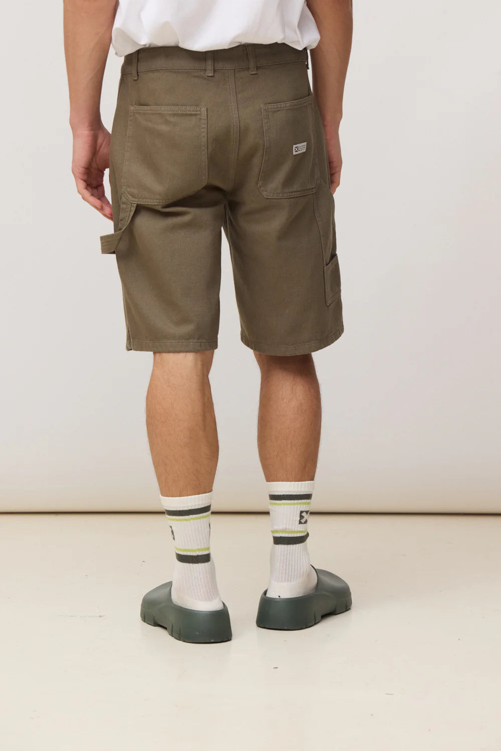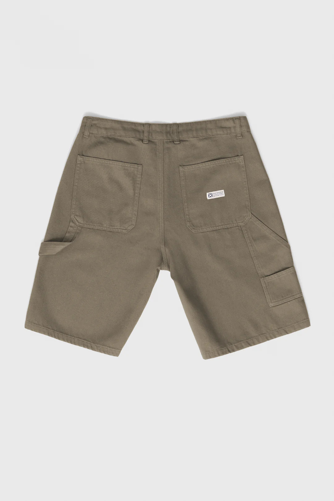 También incorpora bolsillo carpenter y bolsillos traseros con etiqueta decorativa. Son detalles que empujan la bermuda hacia una estética de inspiración workwear ligera, sin perder limpieza ni facilidad de combinación.