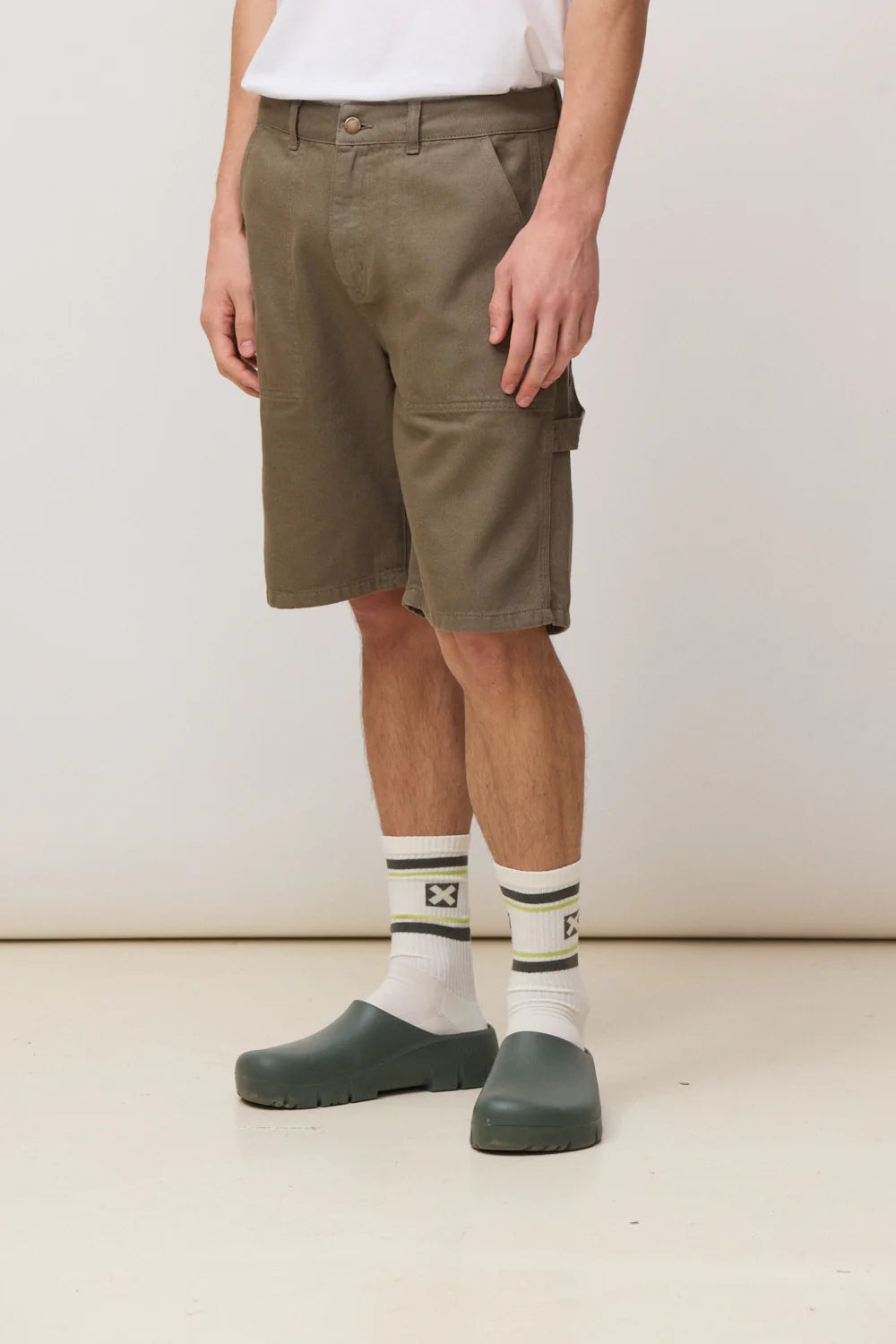 Porque ofrece algo más que una bermuda básica. El tejido de sarga, el corte recto y el detalle carpenter hacen que tenga más personalidad y más estructura visual que otros pantalones cortos más genéricos.