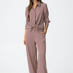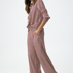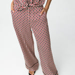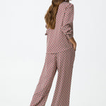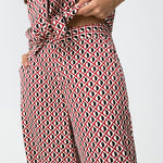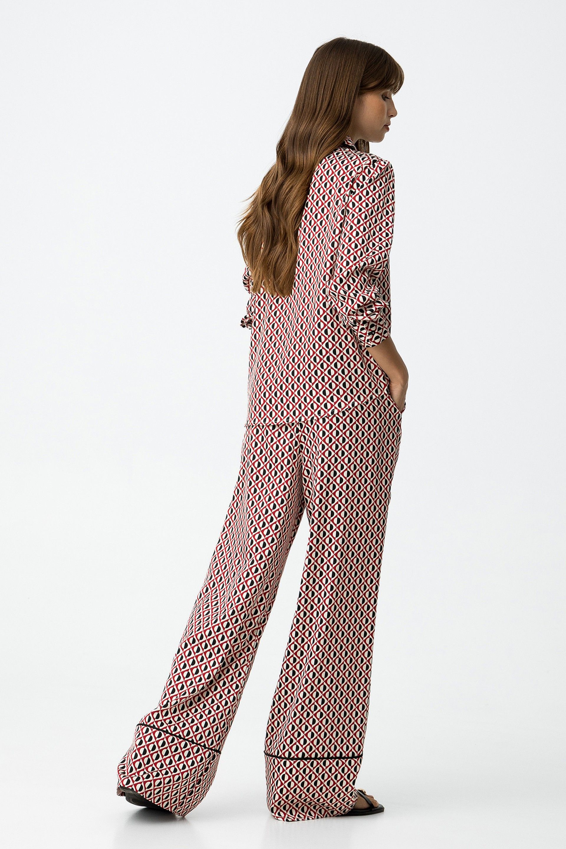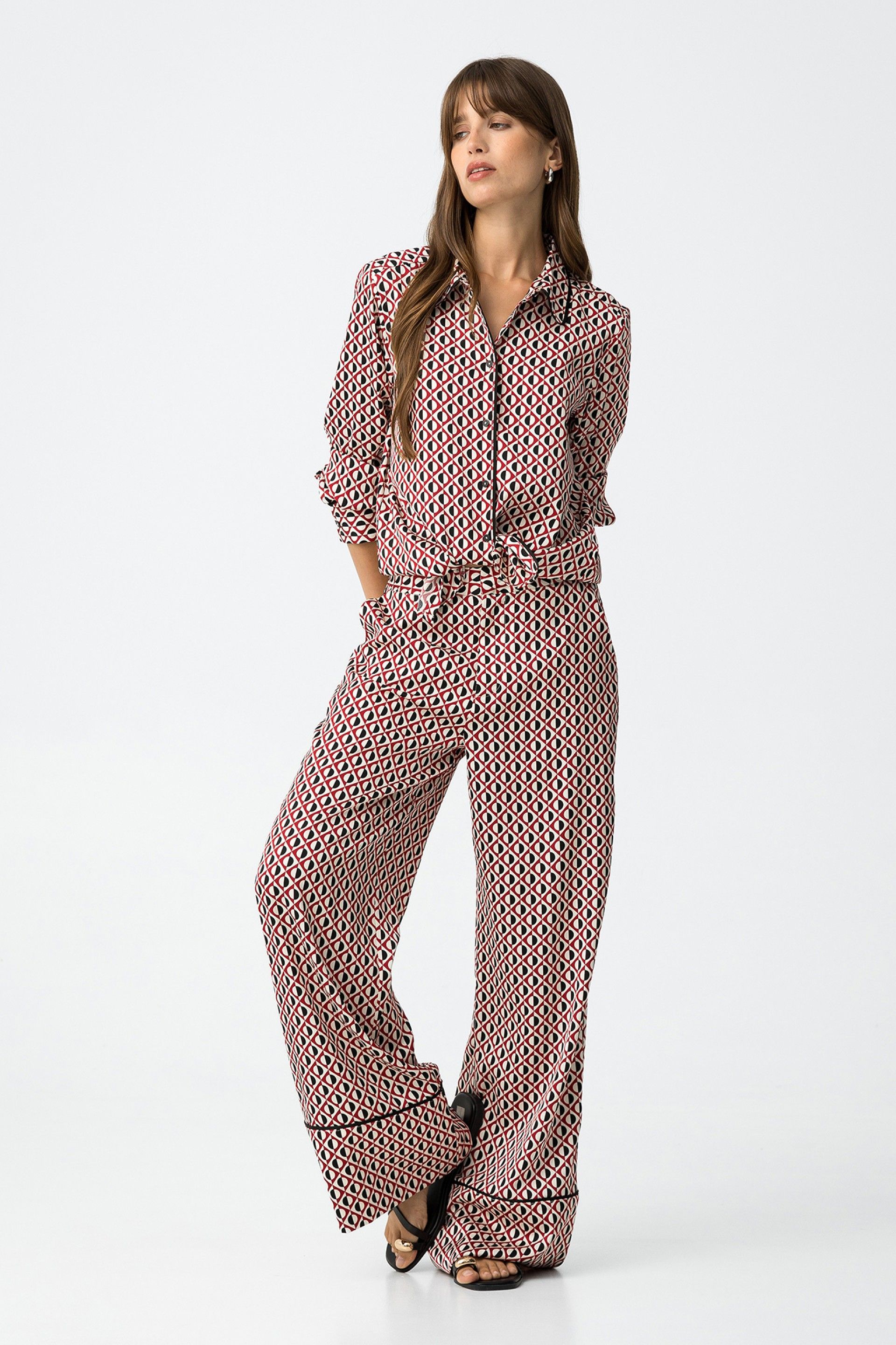 Wide-leg satin pants with an all-over print and piping detail. High waist, two pockets, and a front hook-and-zip closure. 100% polyester.